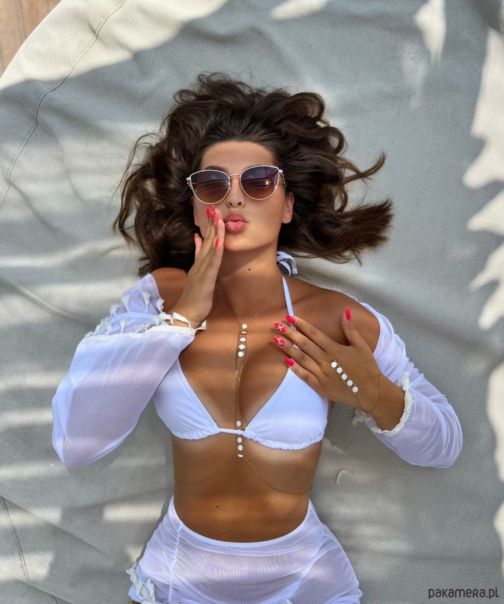 Łańcuszek na ciało z 10 pastylek masy perłowej w cieniowanych w białym, mlecznym odcieniu, wykonany w połączeniu ze stalą szlachetną pozłacaną Łańcuszek zapinany jest na szyi oraz w talii, z możliwością regulacji (+10 cm), dzięki czemu można dopasować go do ciała. Całość prezentuje się bardzo zmysłowo i oryginalnie.