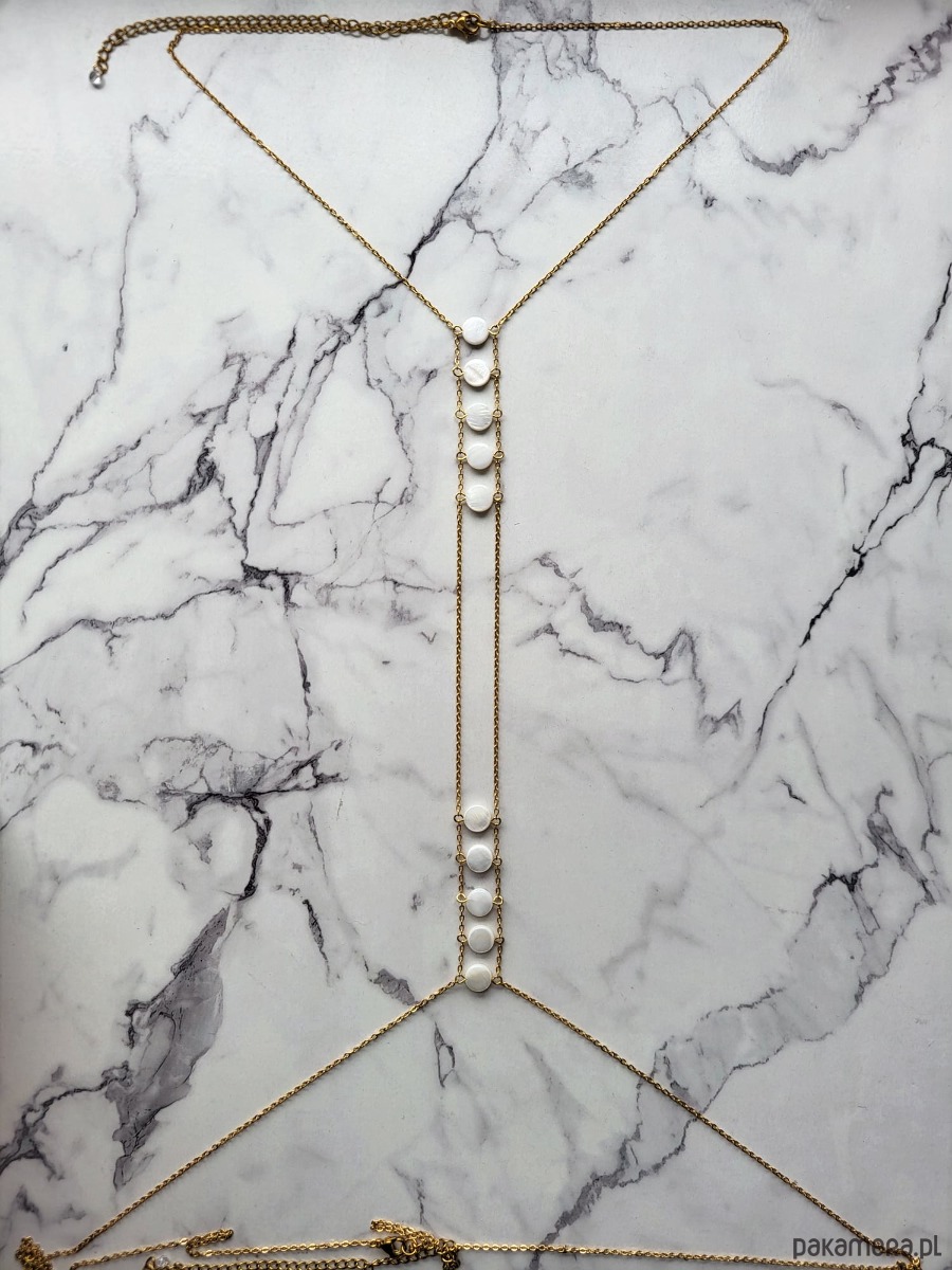 Łańcuszek na ciało z 10 pastylek masy perłowej w cieniowanych w białym, mlecznym odcieniu, wykonany w połączeniu ze stalą szlachetną pozłacaną Łańcuszek zapinany jest na szyi oraz w talii, z możliwością regulacji (+10 cm), dzięki czemu można dopasować go do ciała. Całość prezentuje się bardzo zmysłowo i oryginalnie.