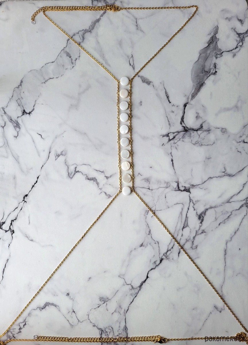 Łańcuszek na ciało z 10 pastylek masy perłowej w kolorze białym mlecznym, wykonany w połączeniu ze stalą szlachetną pozłacaną Łańcuszek zapinany jest na szyi oraz w talii, z możliwością regulacji (+10 cm), dzięki czemu można dopasować go do ciała. Całość prezentuje się bardzo zmysłowo i oryginalnie.