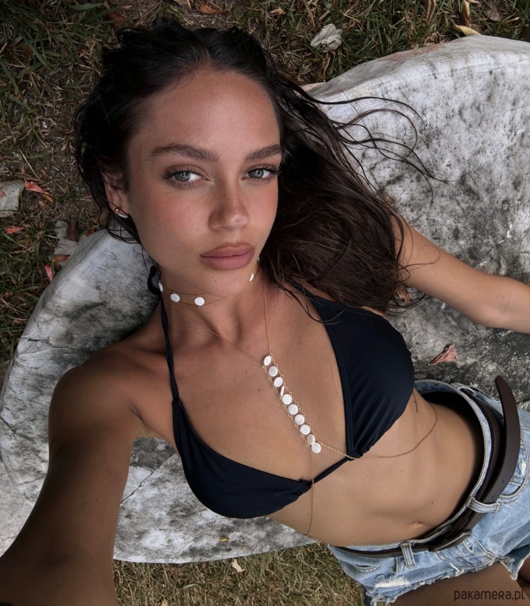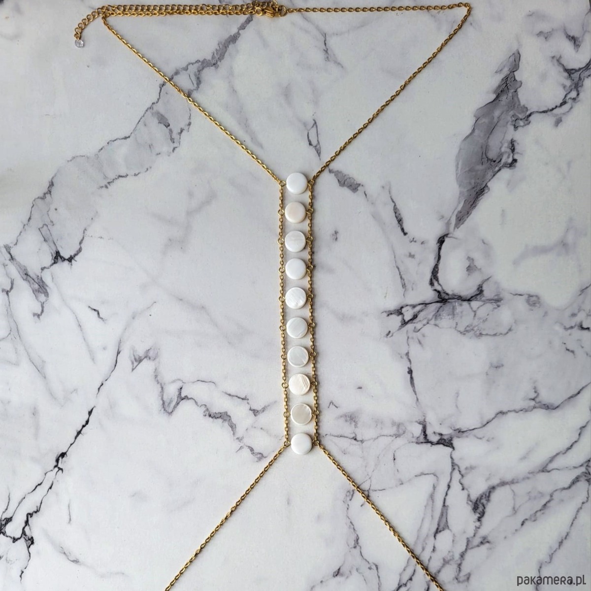 Łańcuszek na ciało z 10 pastylek masy perłowej w kolorze białym mlecznym, wykonany w połączeniu ze stalą szlachetną pozłacaną Łańcuszek zapinany jest na szyi oraz w talii, z możliwością regulacji (+10 cm), dzięki czemu można dopasować go do ciała. Całość prezentuje się bardzo zmysłowo i oryginalnie.