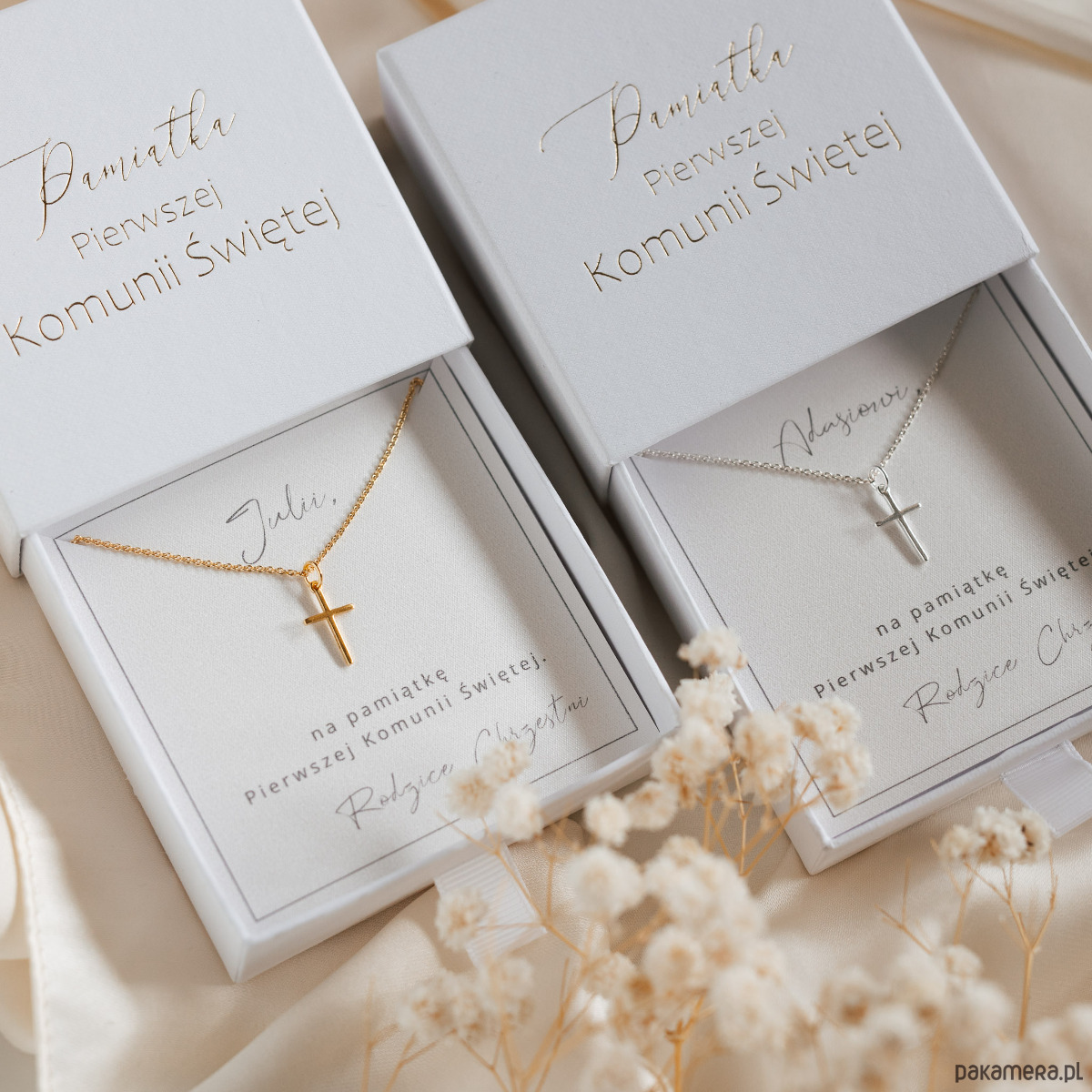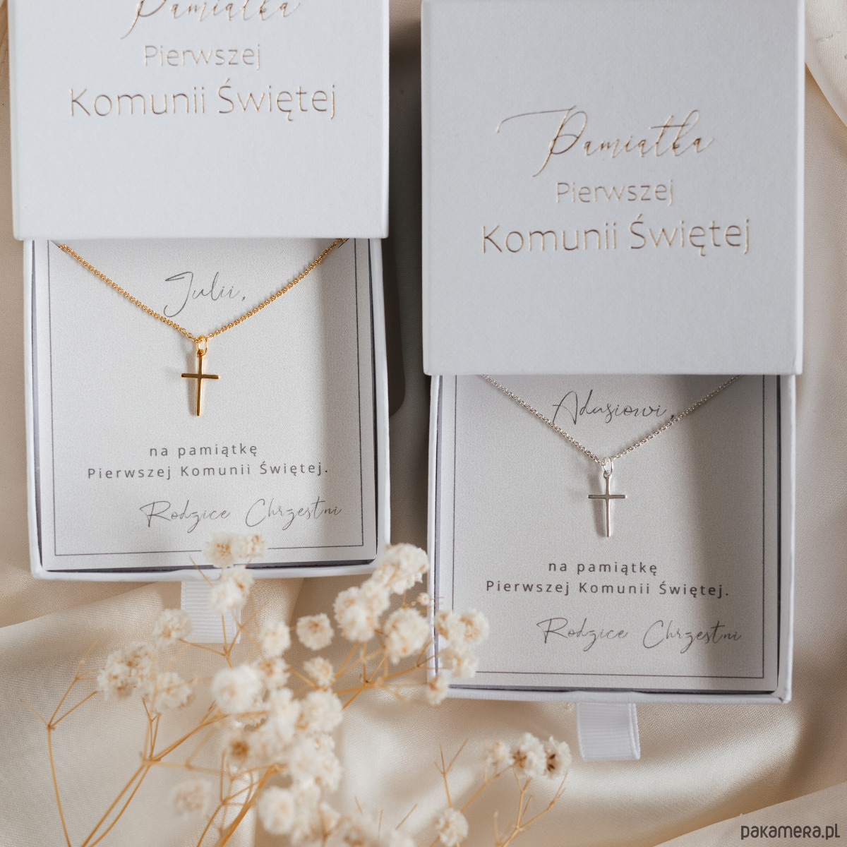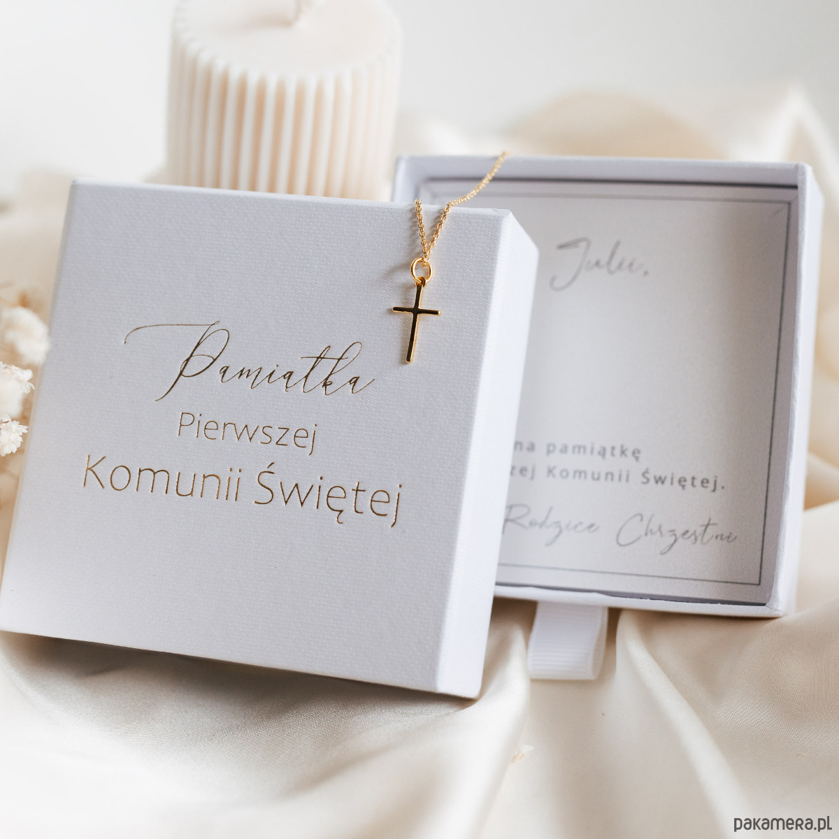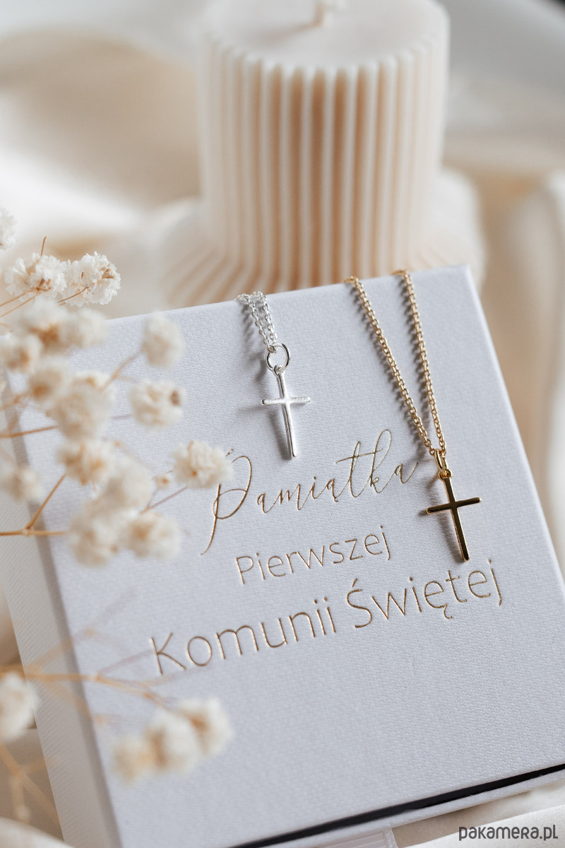Minimalistyczny i wyjątkowy naszyjnik z krzyżykiem, będzie symboliczną pamiątką z dnia Pierwszej Komunii Świętej. Naszyjnik zapakowany jest w ozdobne pudełko jubilerskie ze złotym tłoczeniem.