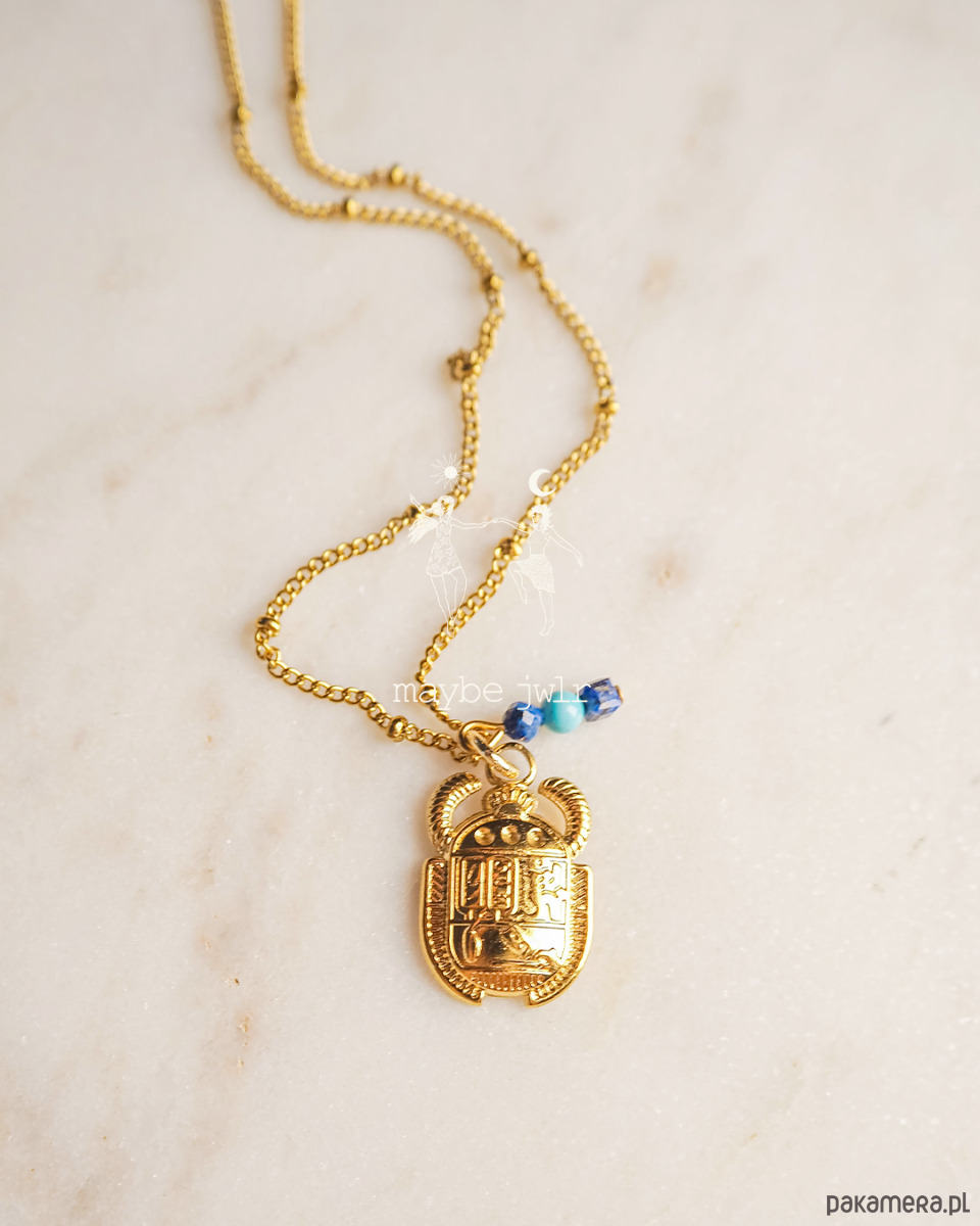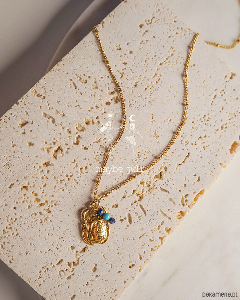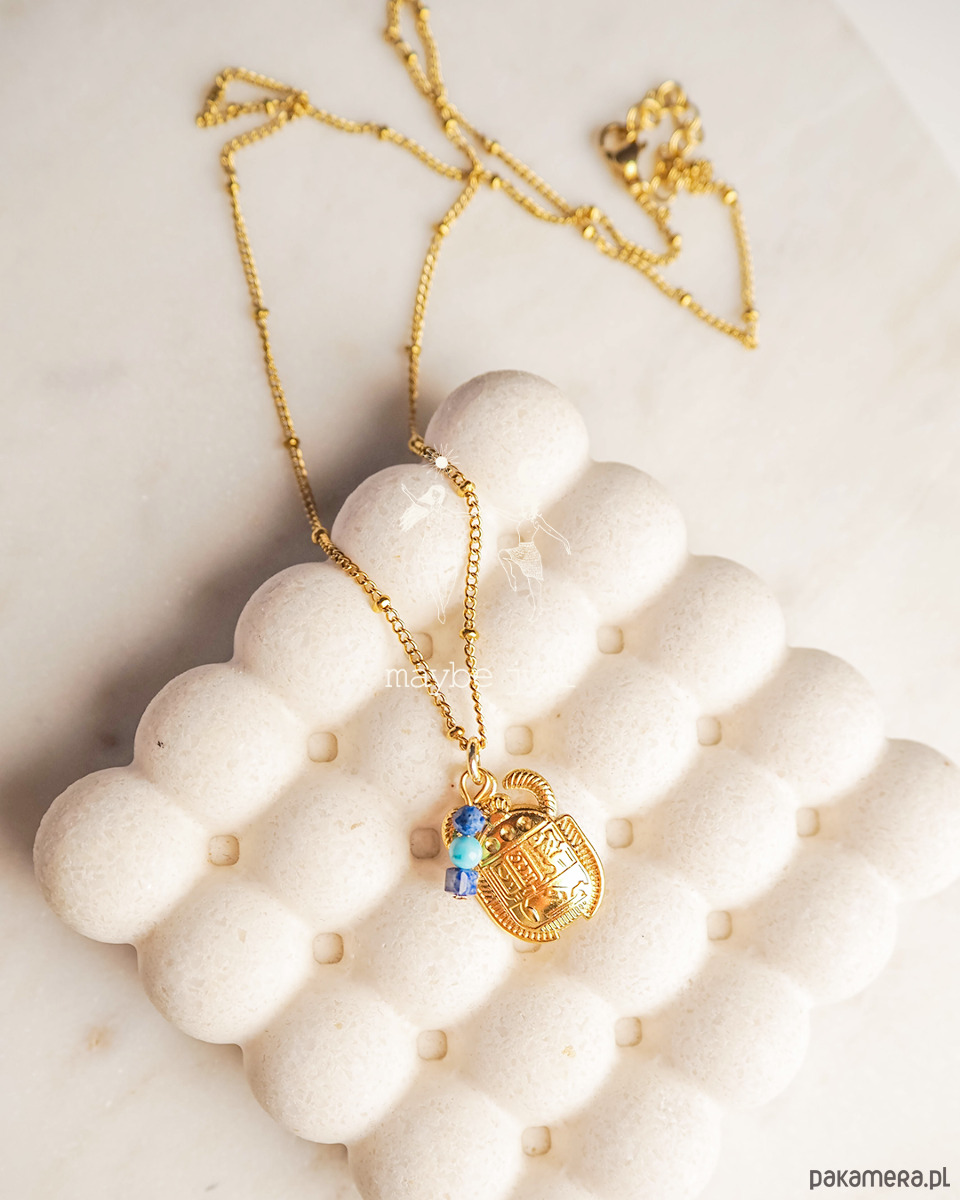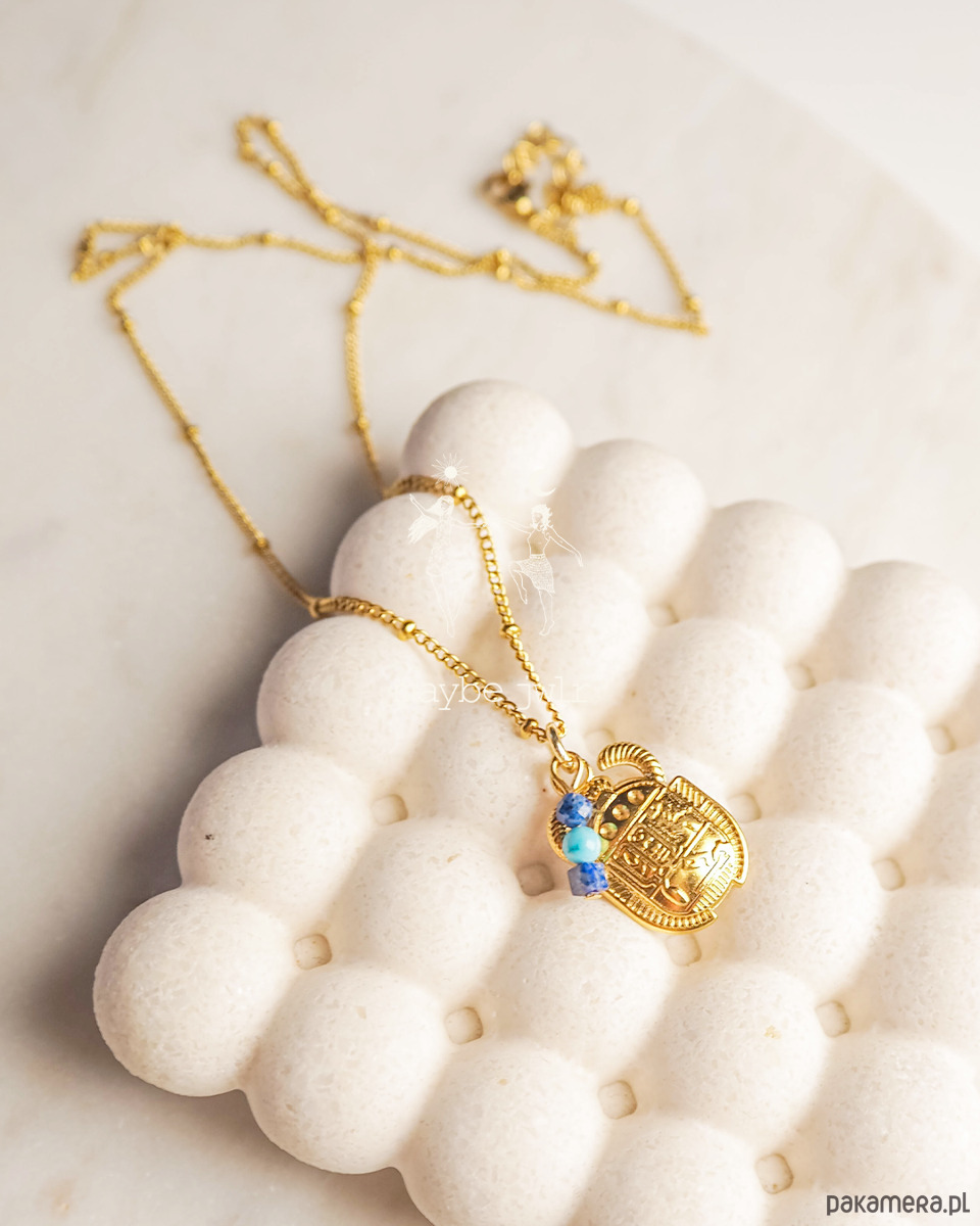 Elegancki i stonowany naszyjnik z zawieszką złoty Skarabeusz i kamieniami naturalnymi.