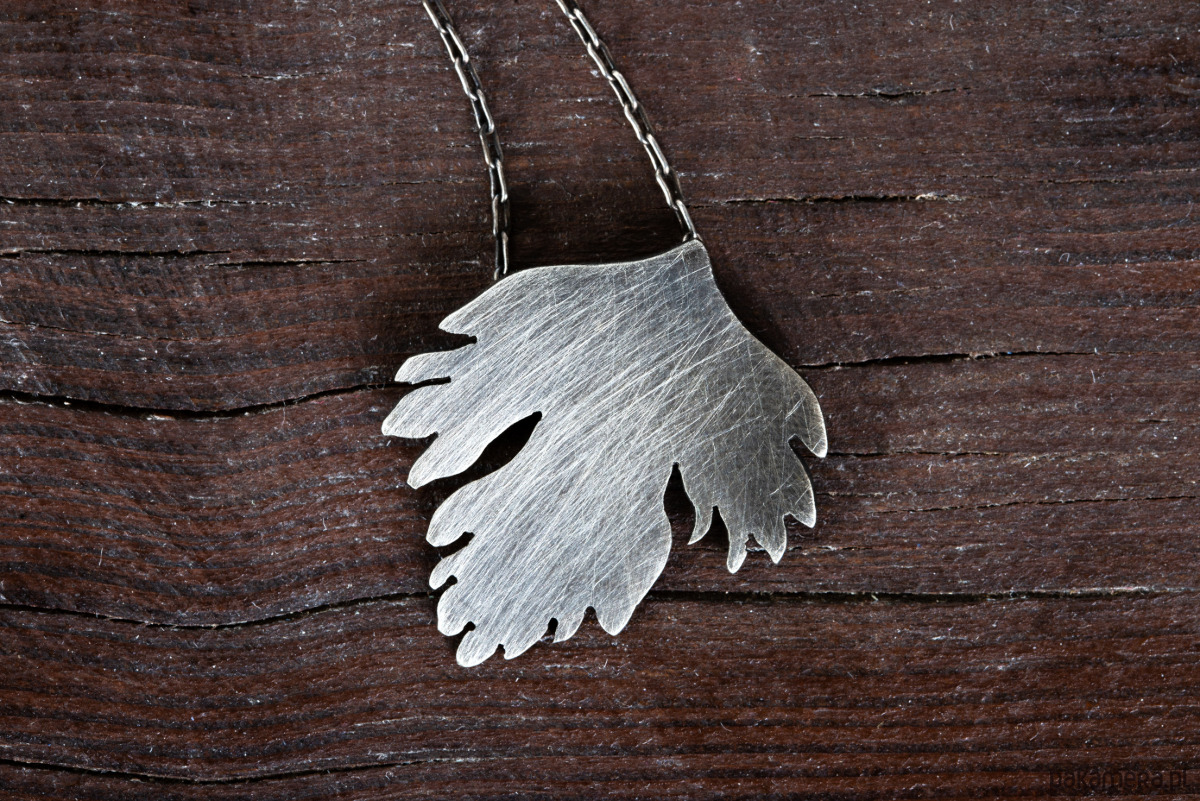 Delikatny naszyjnik z zawieszką w kształcie liścia pietruszki na łańcuszku.
