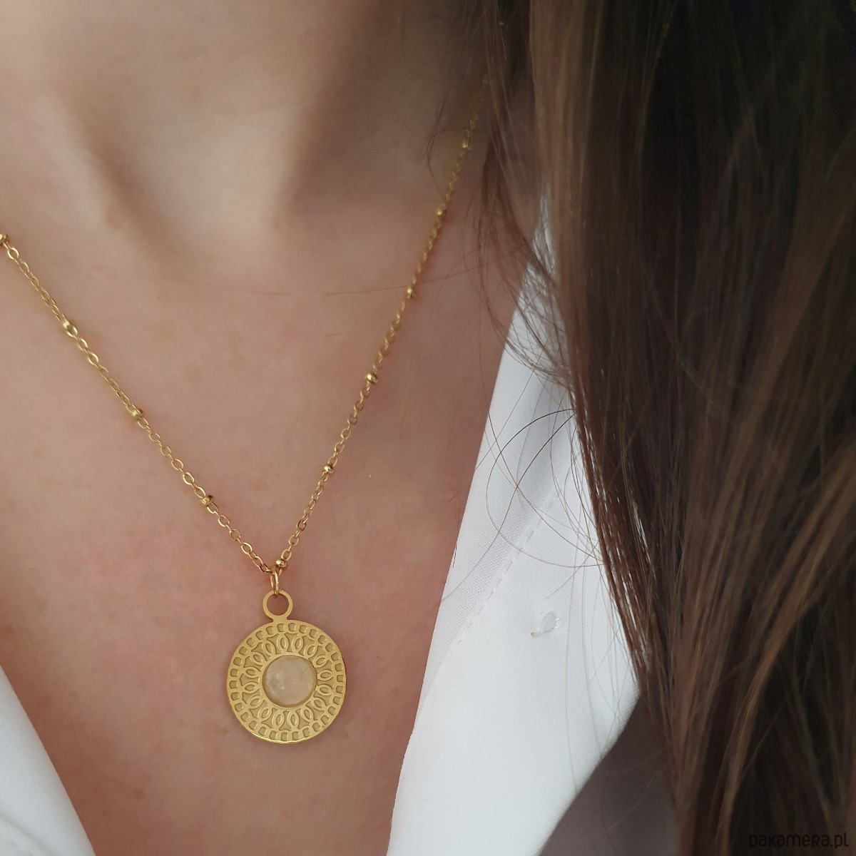 Łańcuszek ze stali szlachetnej w kolorze złotym, z zawieszką w kształcie medalionu z kamieniem naturalnym kamieniem słonecznym.