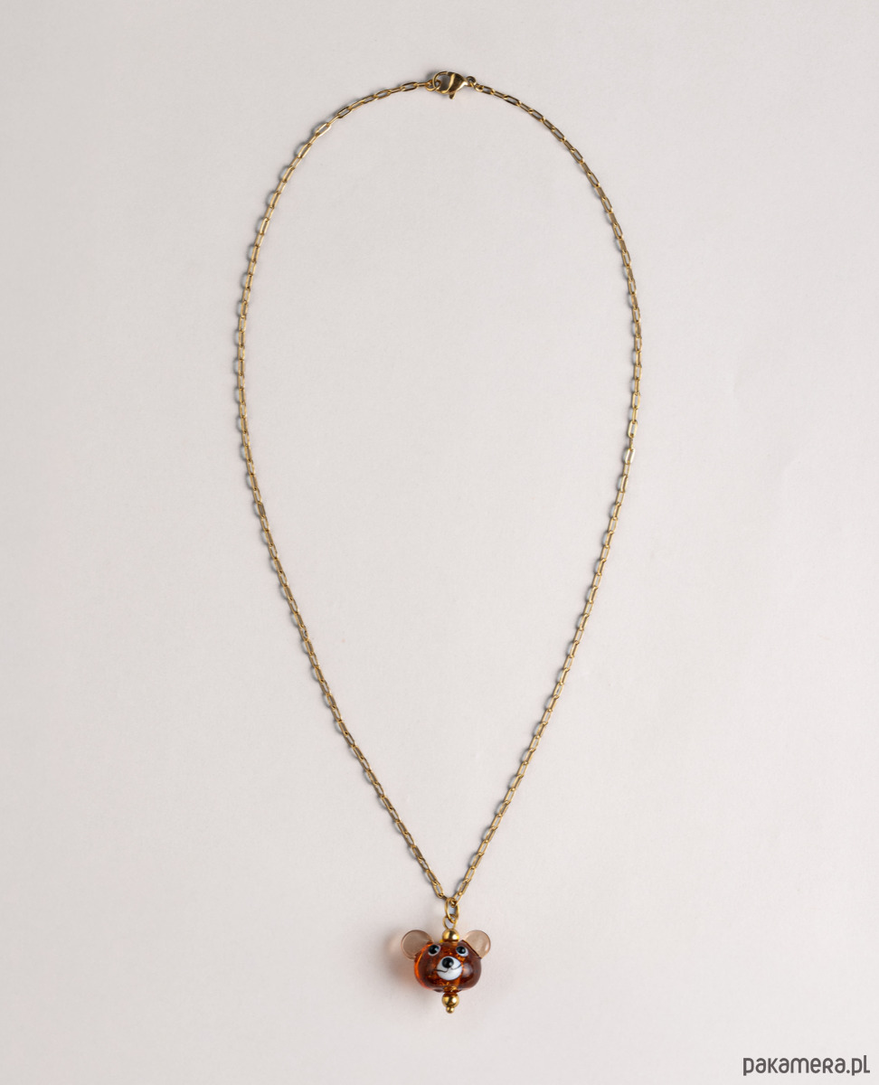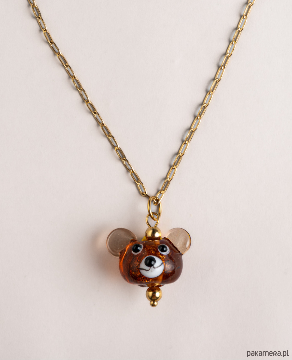 Minimalistyczny urzekający wisiorek ze stali szlachetnej zakończony zawieszkà w postaci szklanego misia.