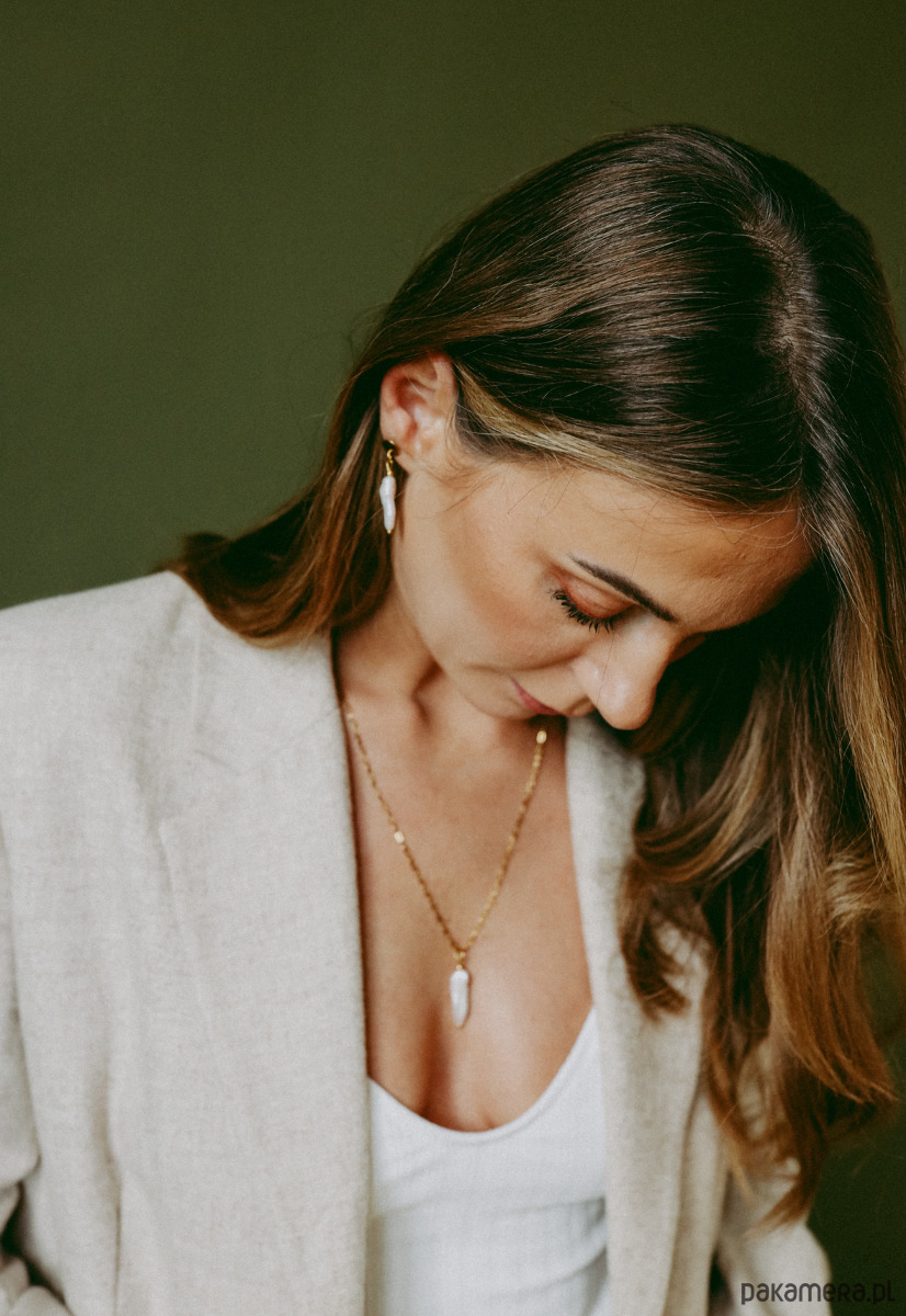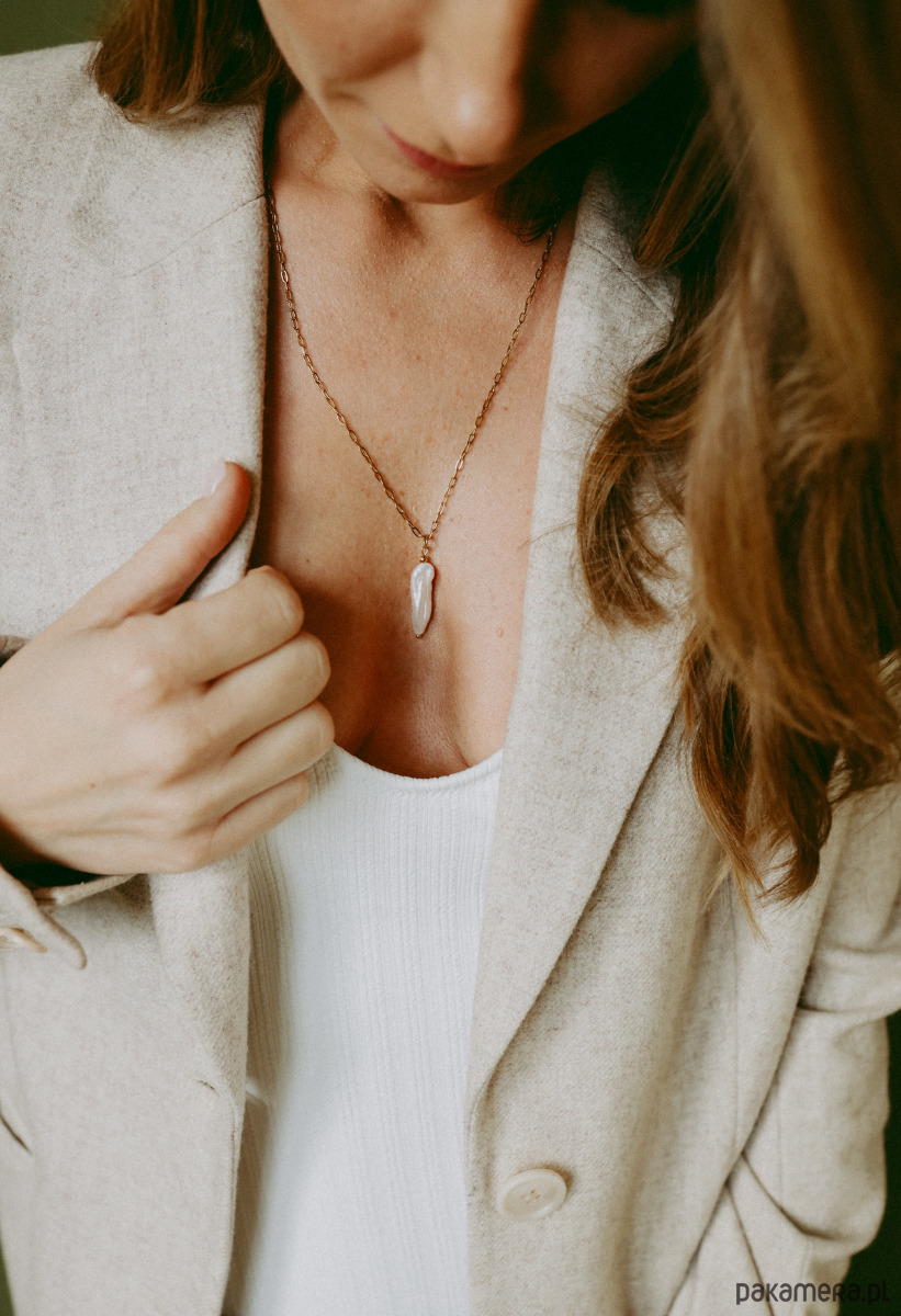 Wisiorek ze stali szlachetnej z perłą naturalną . Perełka jest podłużna i pięknie nieregularna .