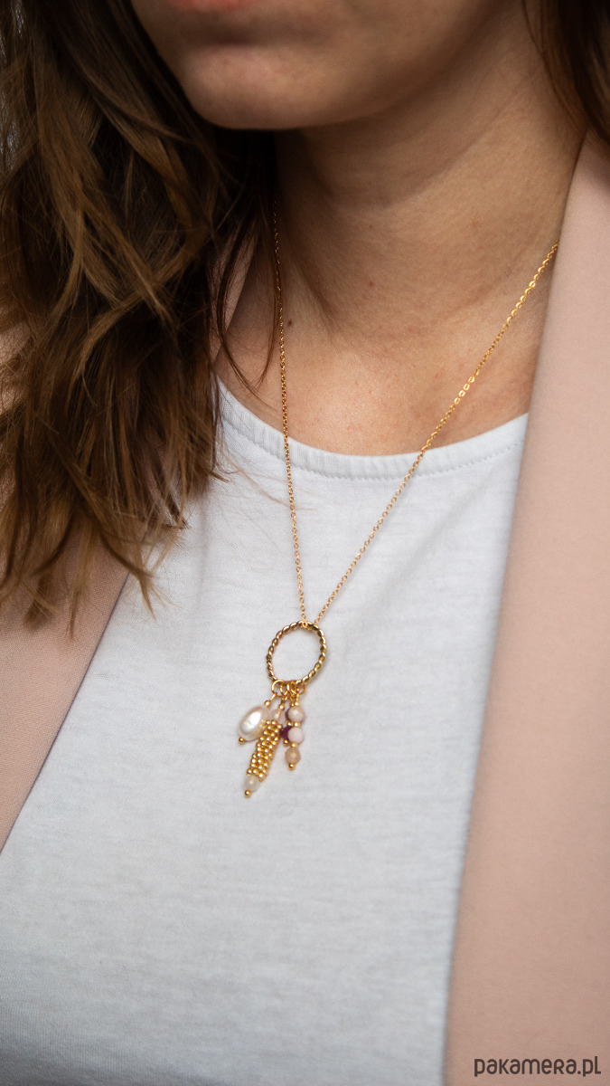 Ten niezwykły łańcuszek ze stali chirurgicznej to wyjątkowy dodatek, który łączy w sobie elegancję i nowoczesność. Długość łańcuszka wynosi od 45 do 50 cm, co sprawia, że idealnie układa się na dekolcie, dodając szyku każdej stylizacji. Jego sercem jest misternie wykonana, ręcznie robiona zawieszka z mosiężnego kółeczka, na którym delikatnie spoczywa kolekcja pięknych kamieni.
