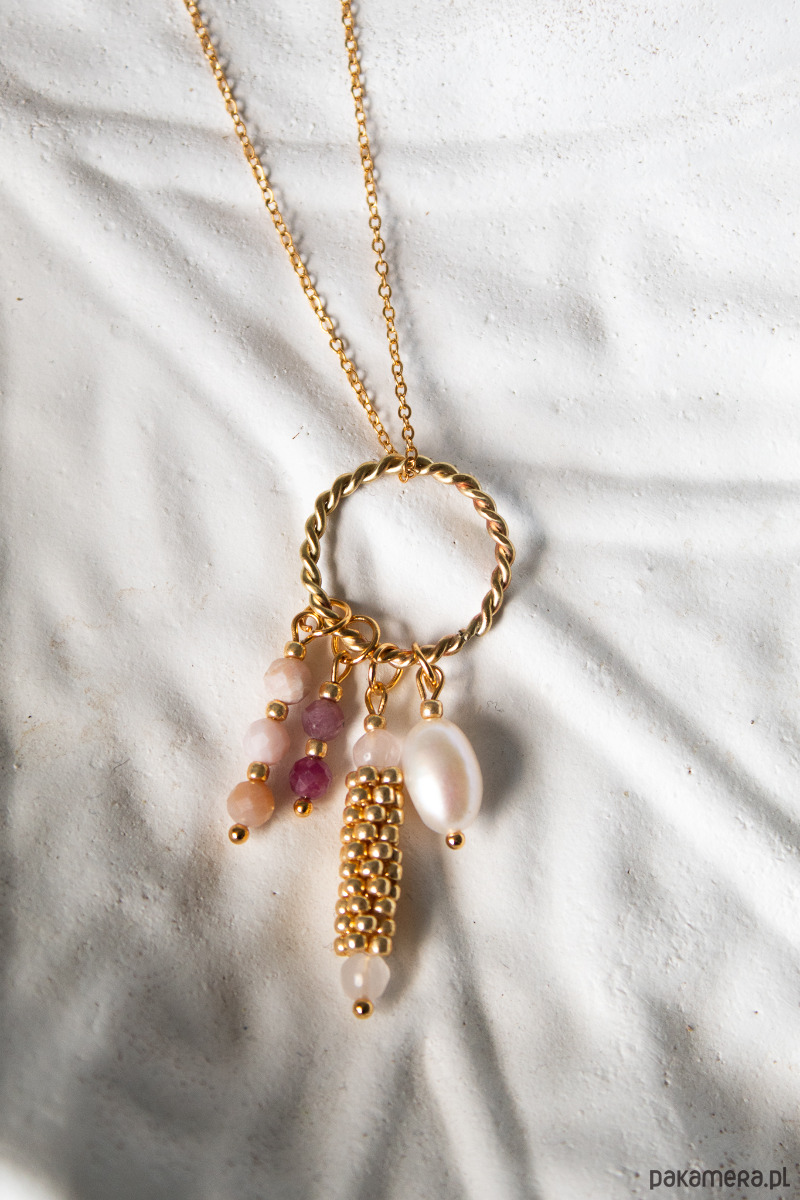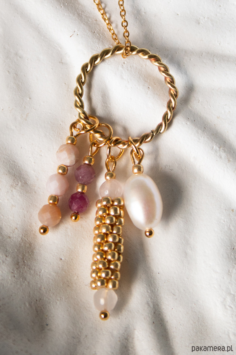 Zawieszka ozdobiona jest perłą, która symbolizuje czystość i niewinność, dodając naszyjnikowi klasycznej elegancji. Towarzyszą jej rubiny, znane ze swojego intensywnego koloru, które dodają energii i pasji. Kwarce różowe oraz opale różowe wprowadzają nutę romantyczności i subtelnego blasku. Każdy z tych kamieni został starannie dobrany, aby tworzyć harmonijną kompozycję, która zachwyci każdą kobietę.