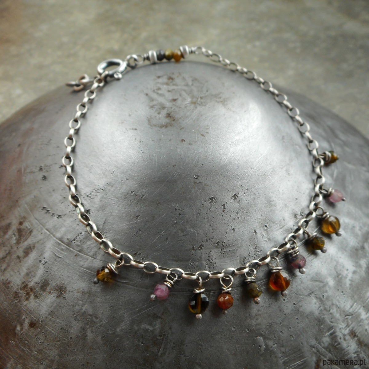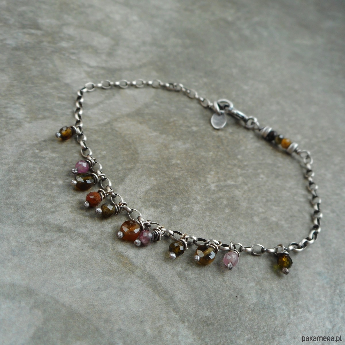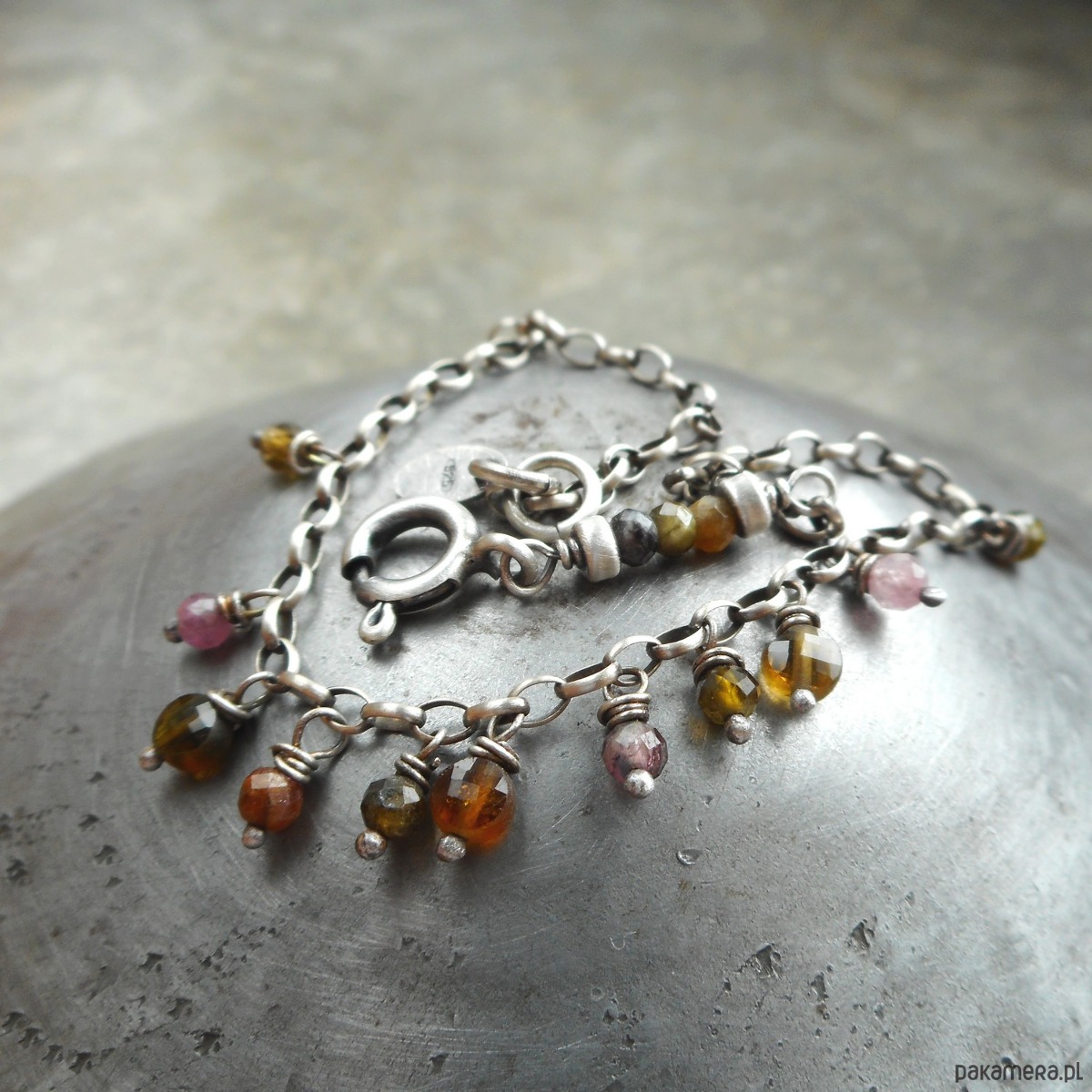 Delikatna bransoletka z zawieszkami, wykonana z kamieni naturalnych i szlachetnego srebra; lekka, łańcuszkowa, ozdobionych szeregiem drobnych, różnorodnych turmalinów.