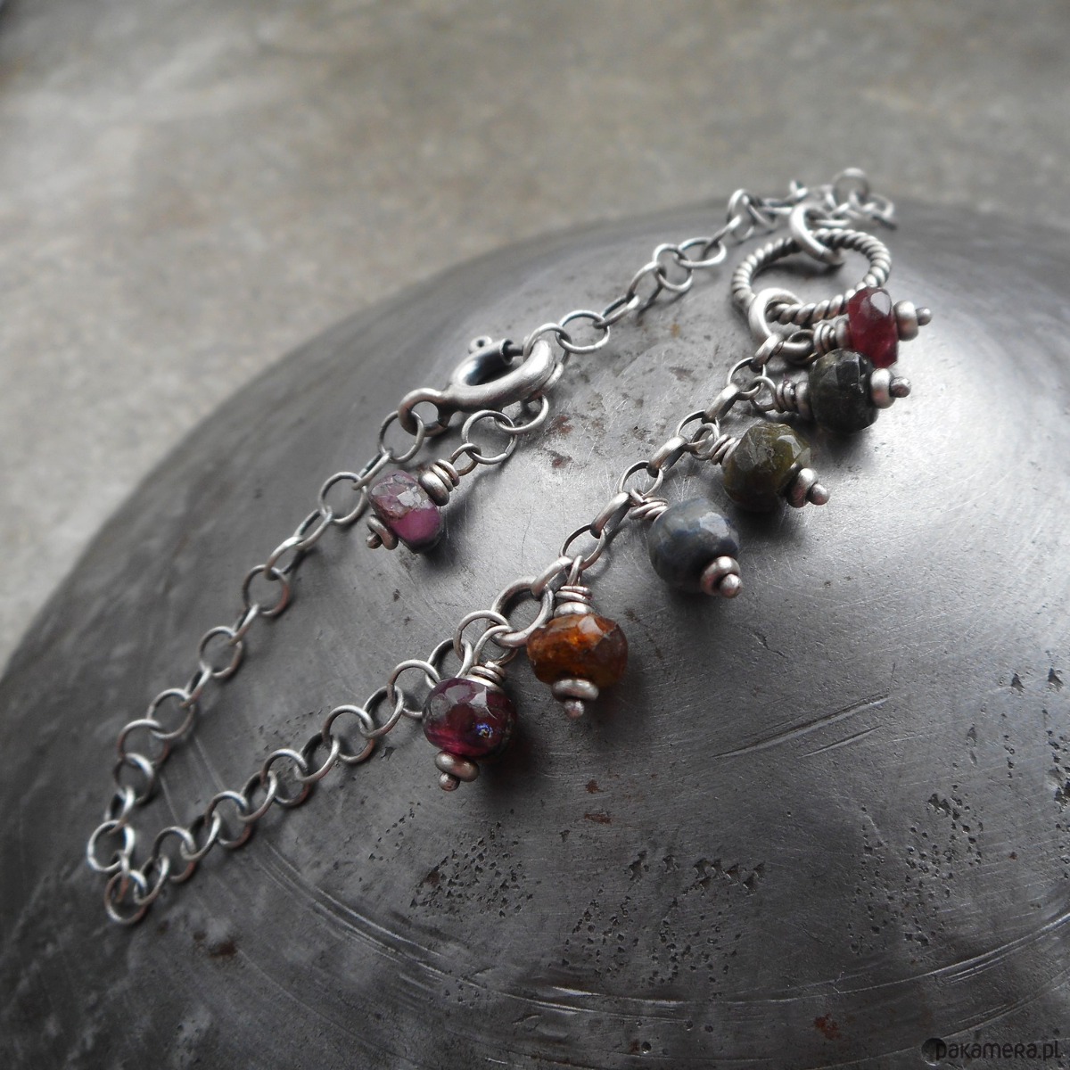 Delikatna bransoletka z zawieszkami, wykonana z kamieni naturalnych i szlachetnego srebra; lekka, łańcuszkowa, ozdobionych szeregiem turmalinów w stonowanych barwach