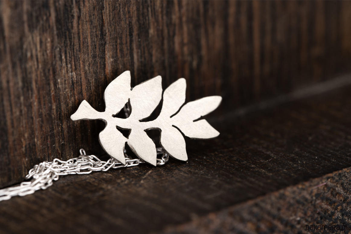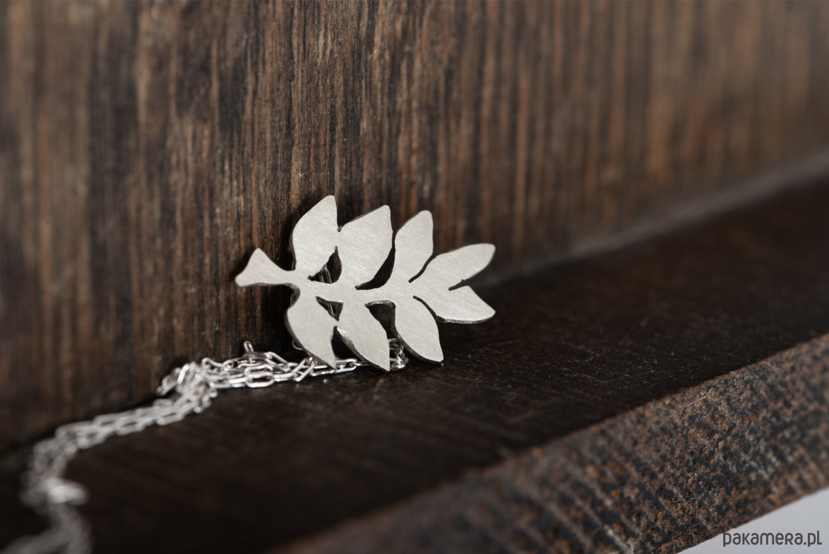 Delikatny naszyjnik z zawieszką w kształcie liścia jesionu na łańcuszku.