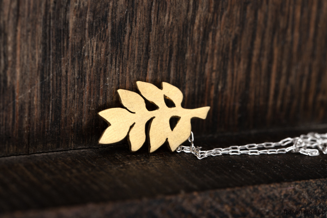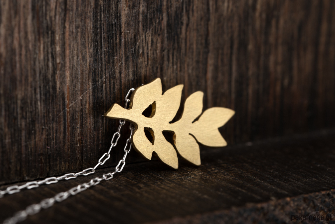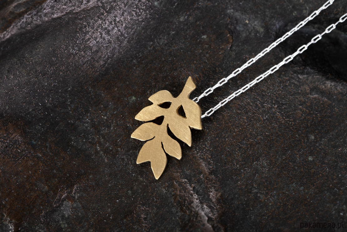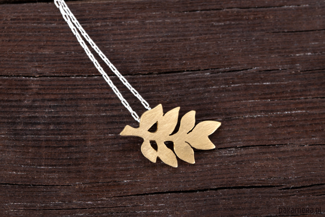 Delikatny naszyjnik z zawieszką w kształcie liścia jesionu na łańcuszku.