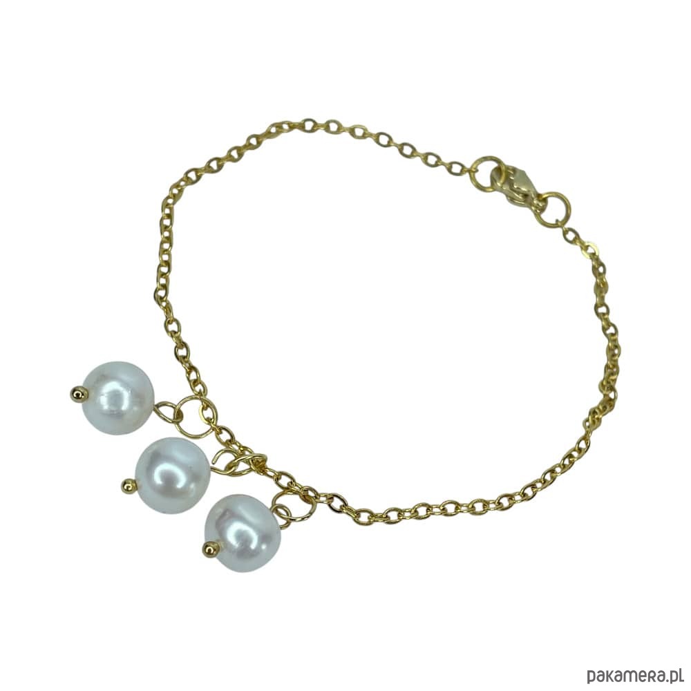 Bransoletka z kolekcji „Morskie szepty pereł” to model wykonany z pozłacanego łańcuszka, ozdobiony trzema naturalnymi perłami zawieszonymi w formie drobnych charmsów. Prosta, minimalistyczna forma eksponuje ich klasyczny urok, a poruszające się perły miękko odbijają światło przy każdym ruchu dłoni, nadając kompozycji elegancji i lekkiej dynamiki. Całość wykończona została wygodnym karabińczykiem, który zapewnia komfort noszenia na co dzień. To ponadczasowa bransoletka łącząca nowoczesną oszczędność formy z kobiecą delikatnością — piękna zarówno noszona samodzielnie, jak i w komplecie z innymi elementami kolekcji.