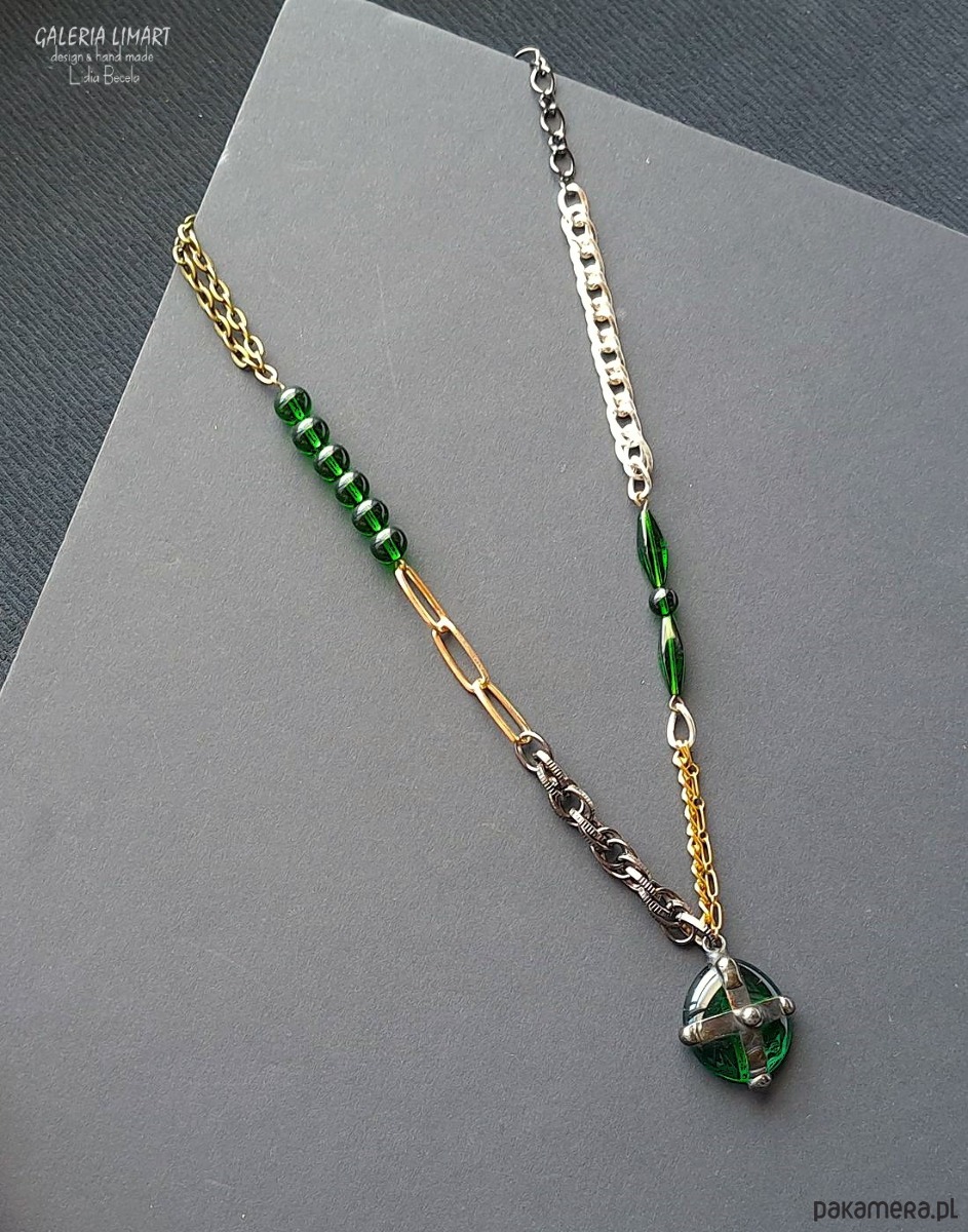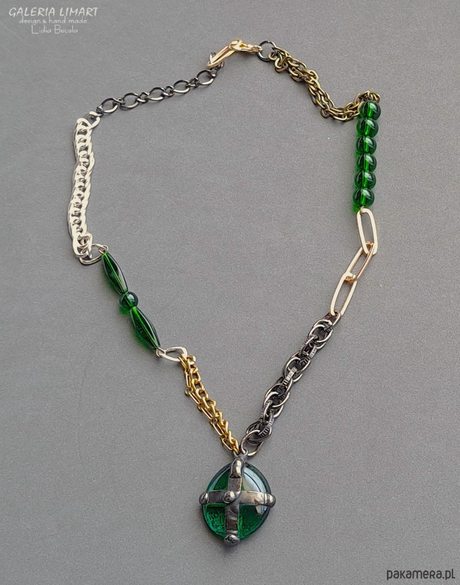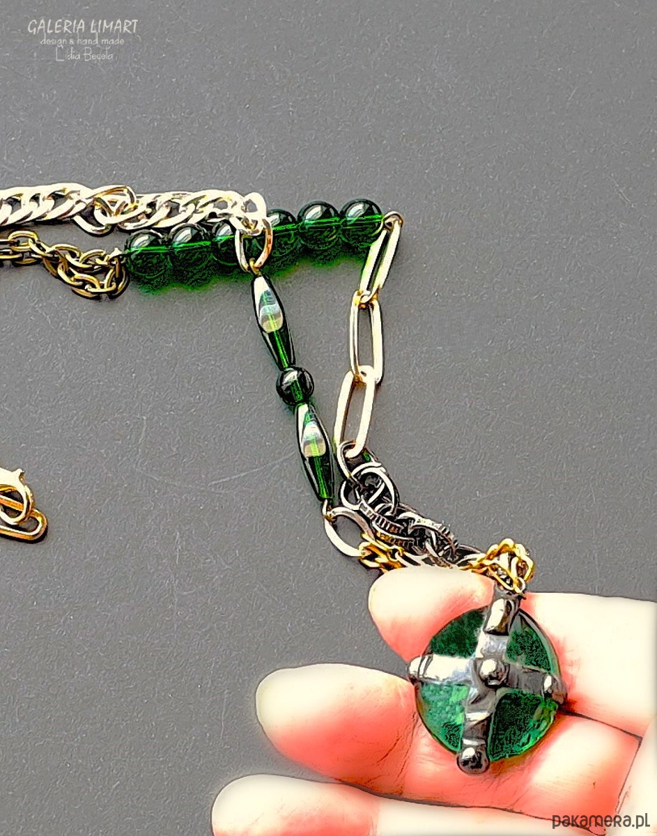 Na przeróżnych łańcuchach dopasowanych kolorystycznie zawieszony został medalion z zielonegio ręcznie wytapianego i oprawianego kaboszona, pomiędzy łańcuchy zostały wplecione korale z zielionego czeskiego szkła, które doskonale współgrają z łańcuchami. Ciekawa i niebanalna kompozycja długości ok. 65 cm. (ok. 60 cm łańcuchy i 5 cm medalion) może być zarówno dla niej jak i dla niego. Naszyjnik unisex. Pasuje do wszystkiego. Sprawi radość każdemu kto kocha niesztampową i unikatową biżuterię handmade.