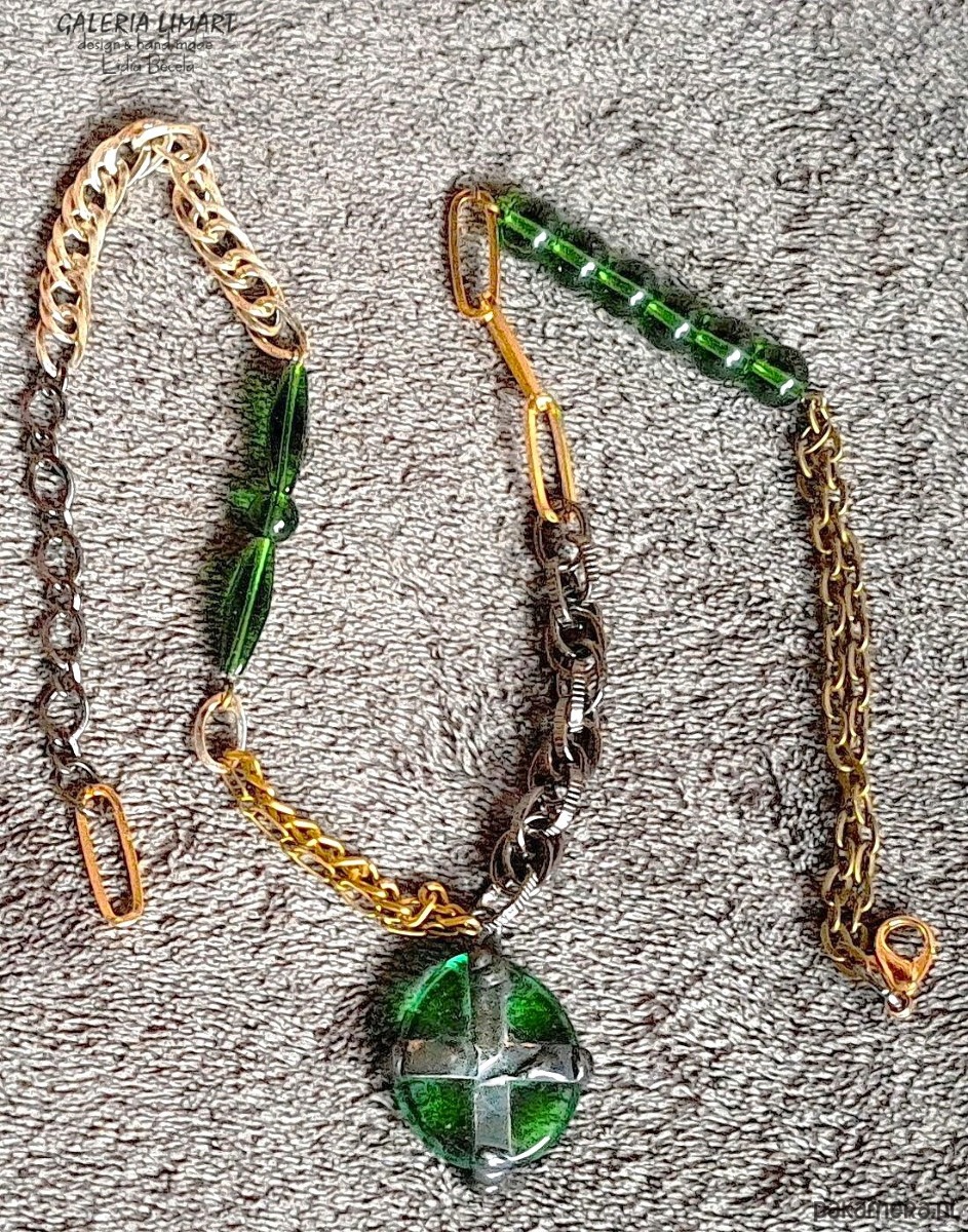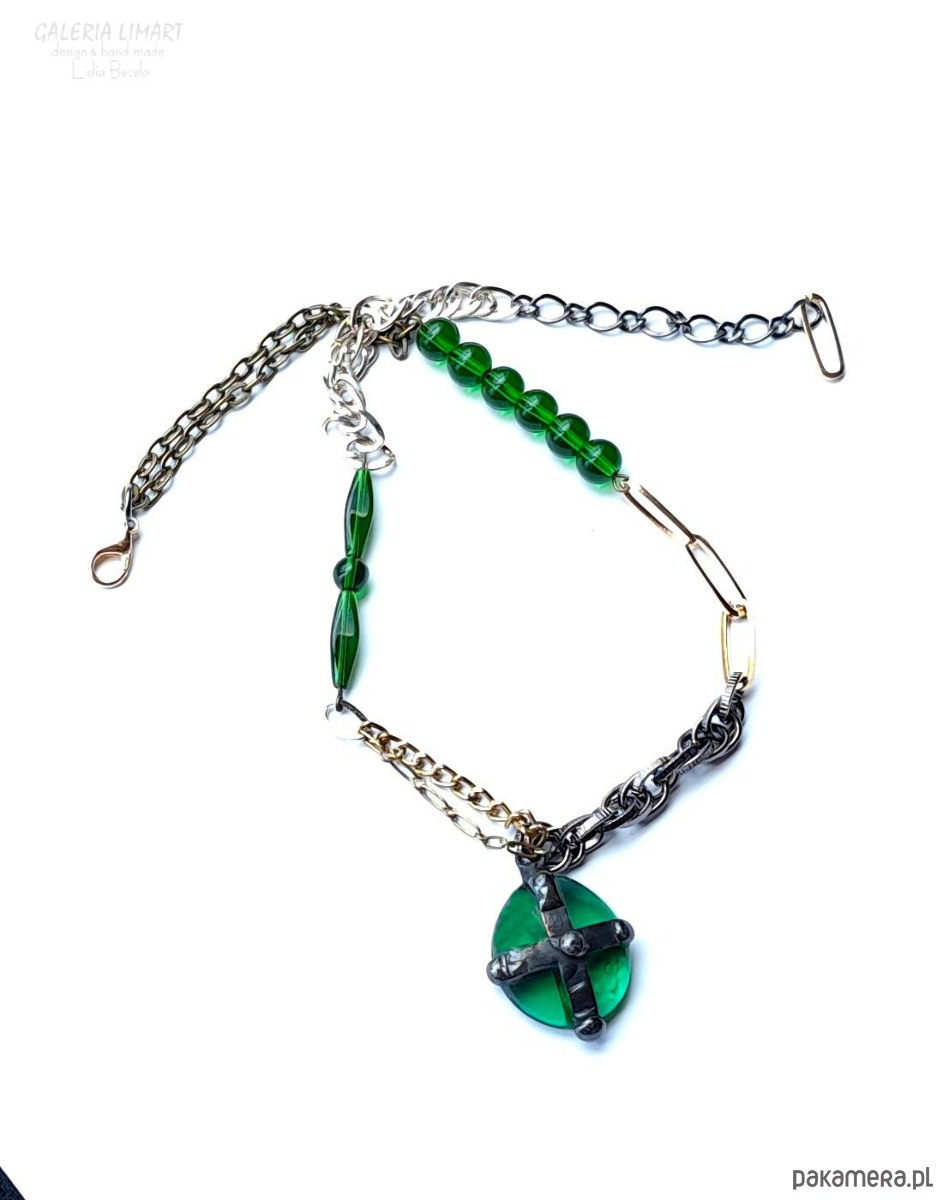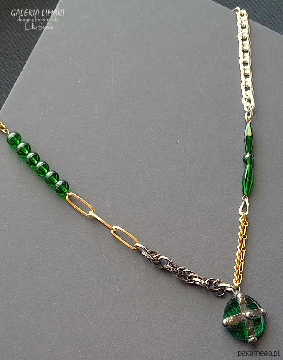 Na przeróżnych łańcuchach dopasowanych kolorystycznie zawieszony został medalion z zielonegio ręcznie wytapianego i oprawianego kaboszona, pomiędzy łańcuchy zostały wplecione korale z zielionego czeskiego szkła, które doskonale współgrają z łańcuchami. Ciekawa i niebanalna kompozycja długości ok. 65 cm. (ok. 60 cm łańcuchy i 5 cm medalion) może być zarówno dla niej jak i dla niego. Naszyjnik unisex. Pasuje do wszystkiego. Sprawi radość każdemu kto kocha niesztampową i unikatową biżuterię handmade.
