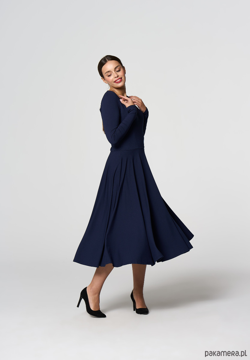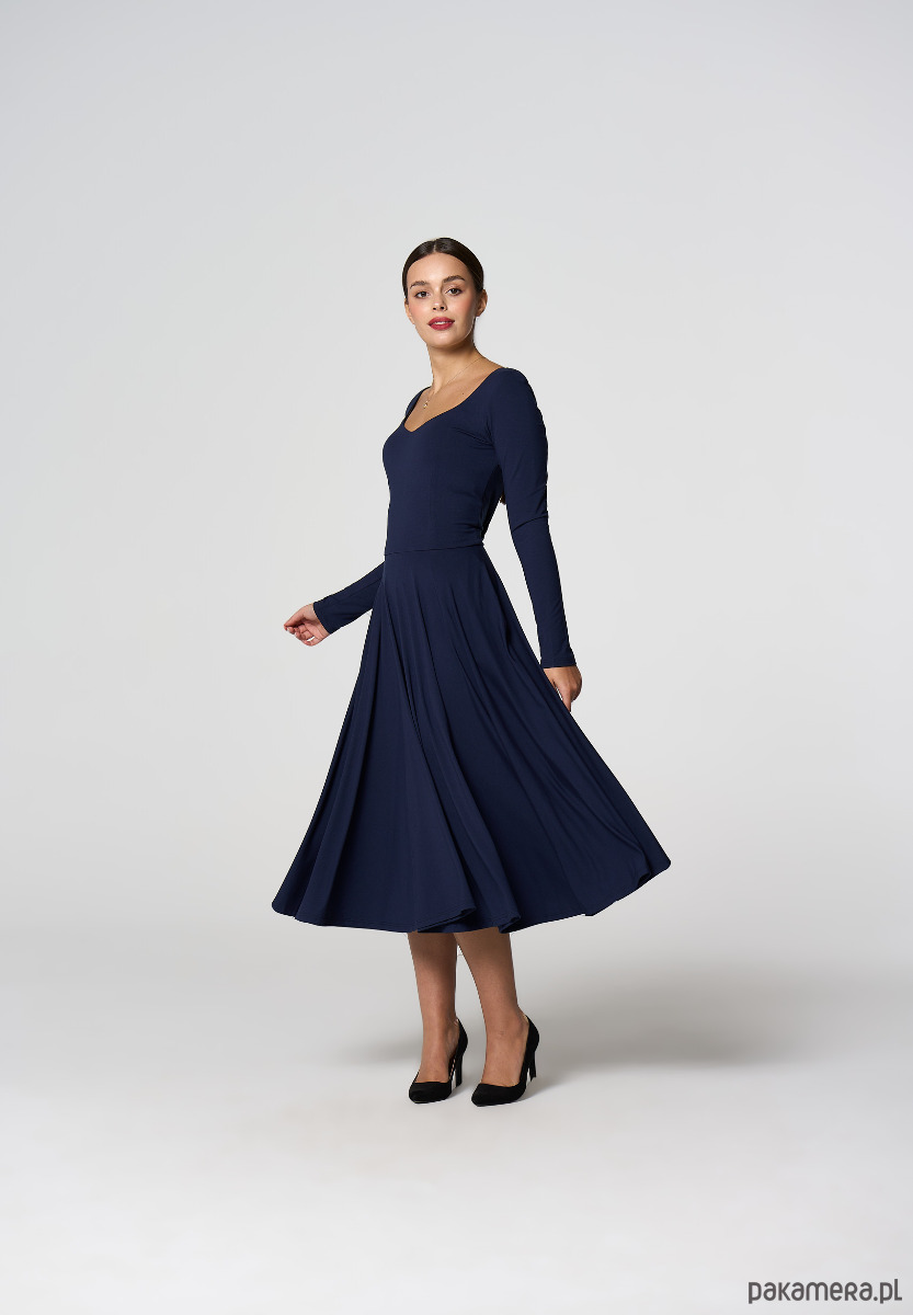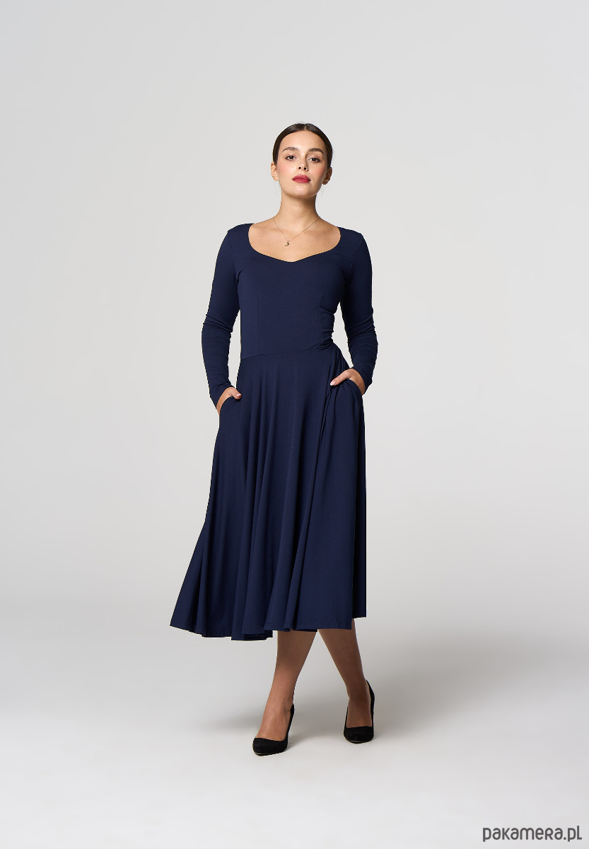 Sukienka midi z dekoltem w serduszko, dopasowana w tali i w biuście.