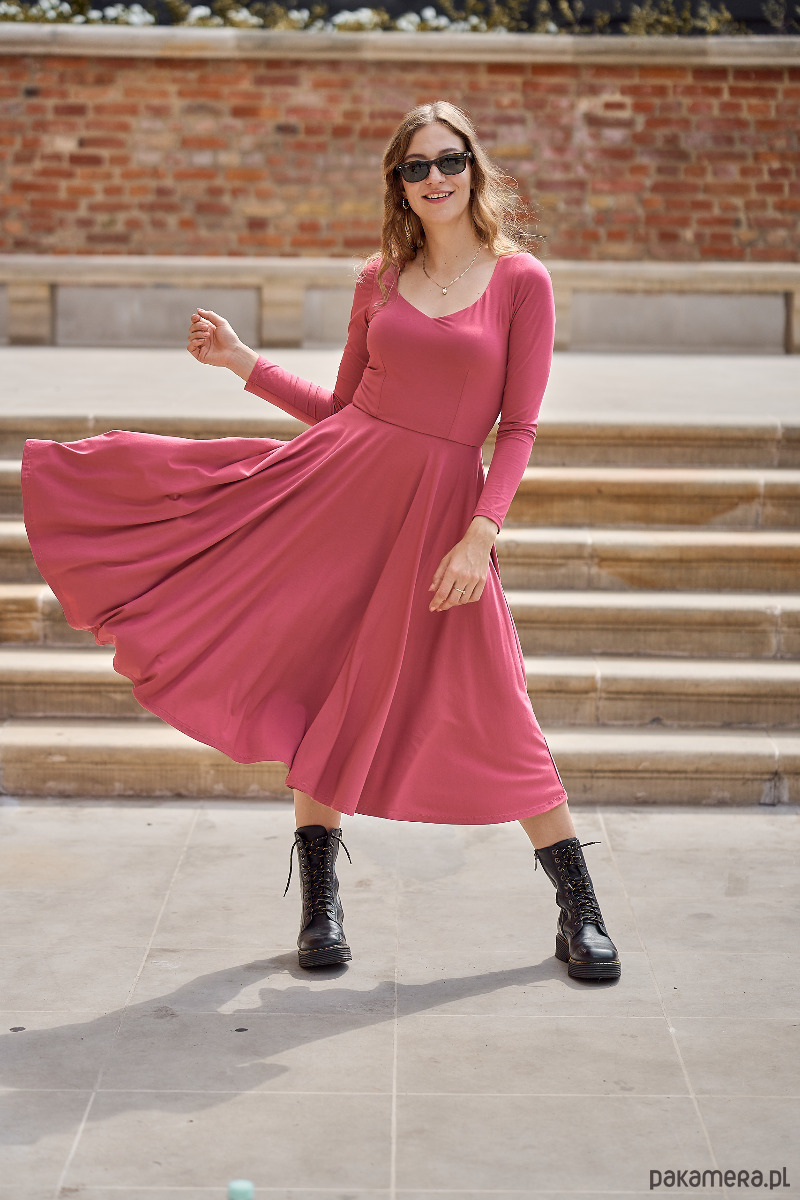 Sukienka midi z dekoltem w serduszko, dopasowana w tali i w biuście.