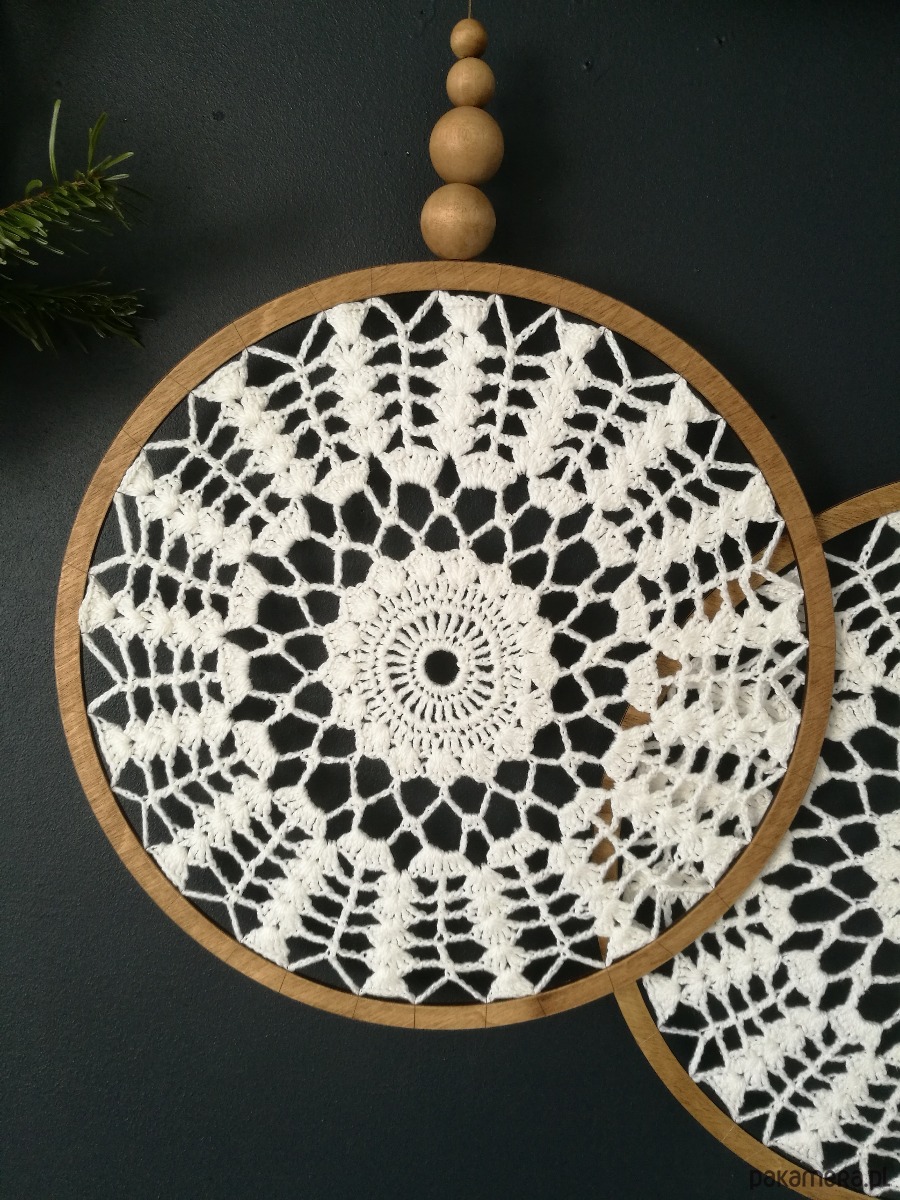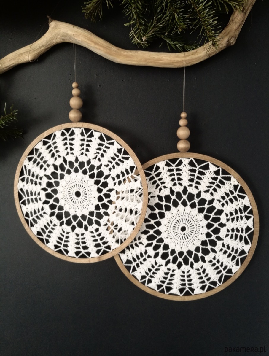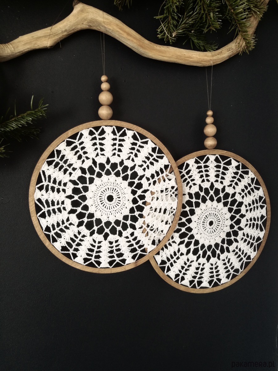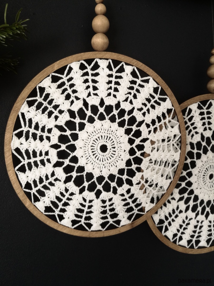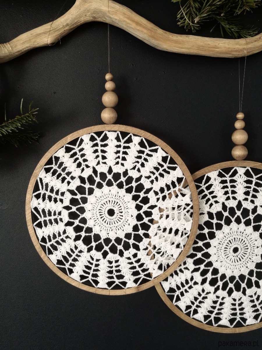 Ręcznie wykonany łapacz snów, kolor biały, 2 sztuki. Obręcz drewniana ręcznie barwiona na brązowy kolor podkreślającym strukturę drewna. Zawieszka ozdobiona koralami umożliwia zawieszenie jej na ścianie. Modna i wpadająca w oko kompozycja, do lekkich wnętrz skandynawskich. Pięknie prezentuje się zawieszona w oknach, znakomicie zdobi przestrzeń w okresie świątecznym.