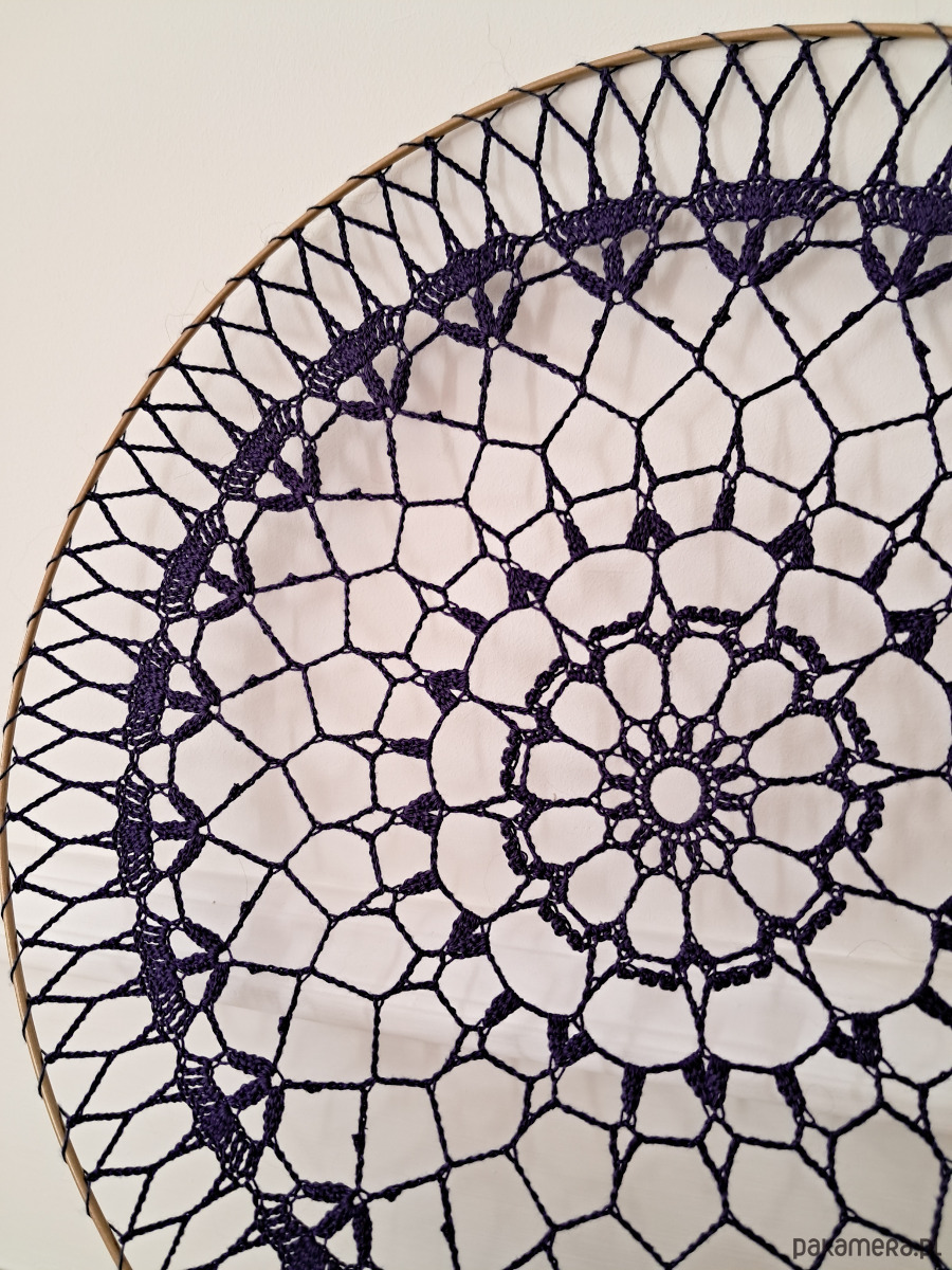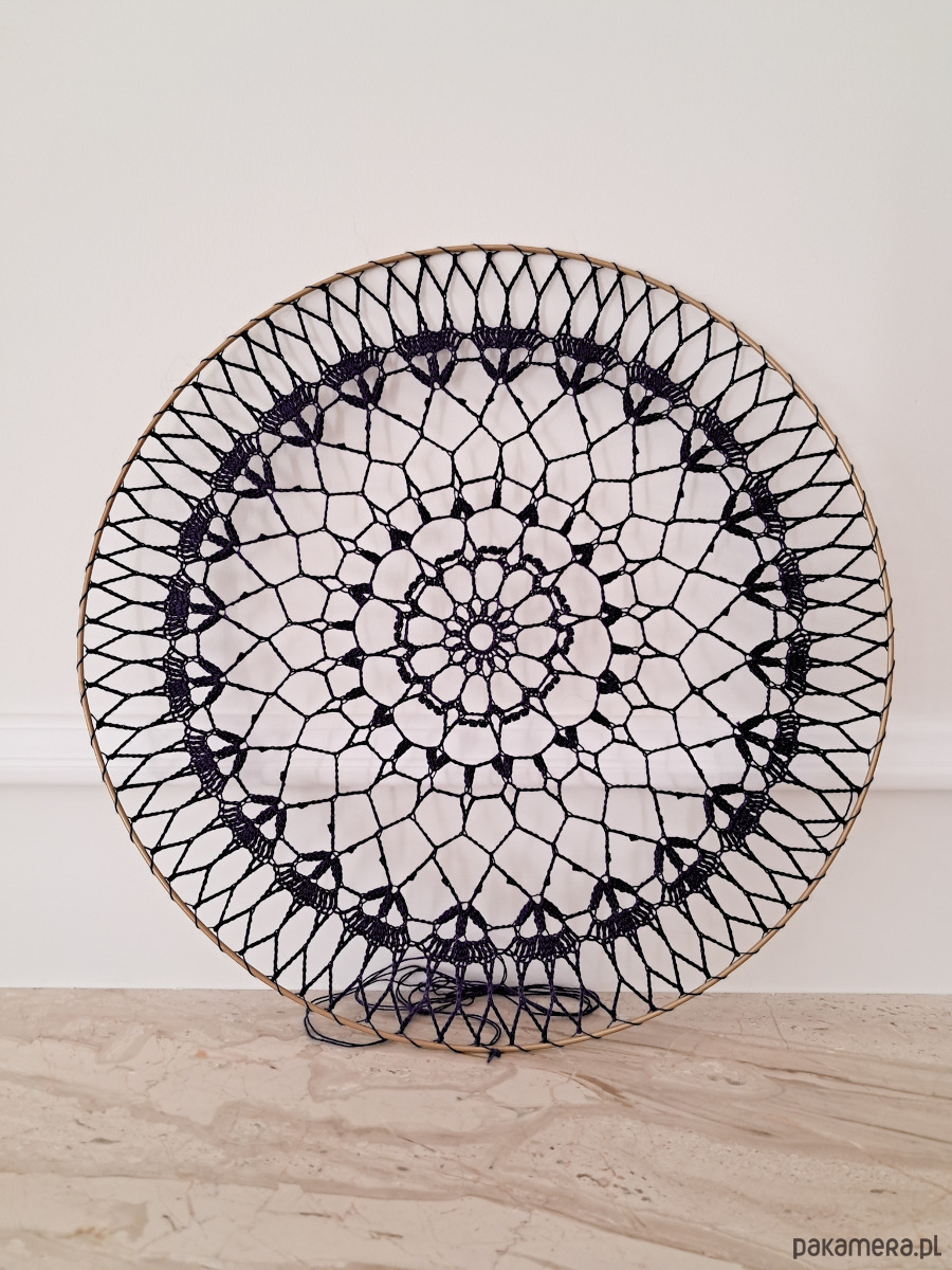 Piękna, unikatowa ozdoba wykonana szydełkiem z wysokiej jakości bawełnianego sznurka. Rozpięta na solidnym metalowym kole w kolorze złotym (średnica 35 cm). Utrzymana w klimacie boho i vintage - idealna do salonu, sypialni, pokoju dziecka lub jako wyjątkowy prezent.
