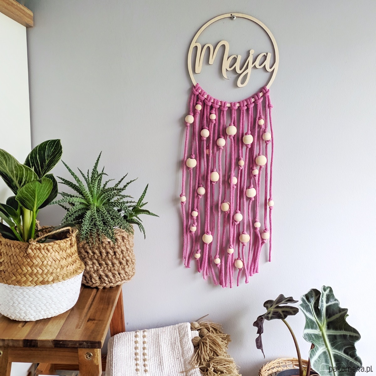Łapacz snów, makrama z koralikami, z napisem, różowa