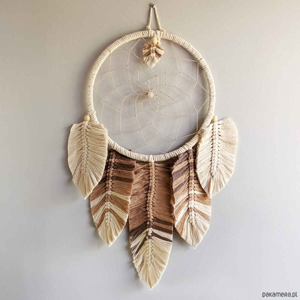 Łapacz snów, neutralne beżowe piórka, makrama 65cm