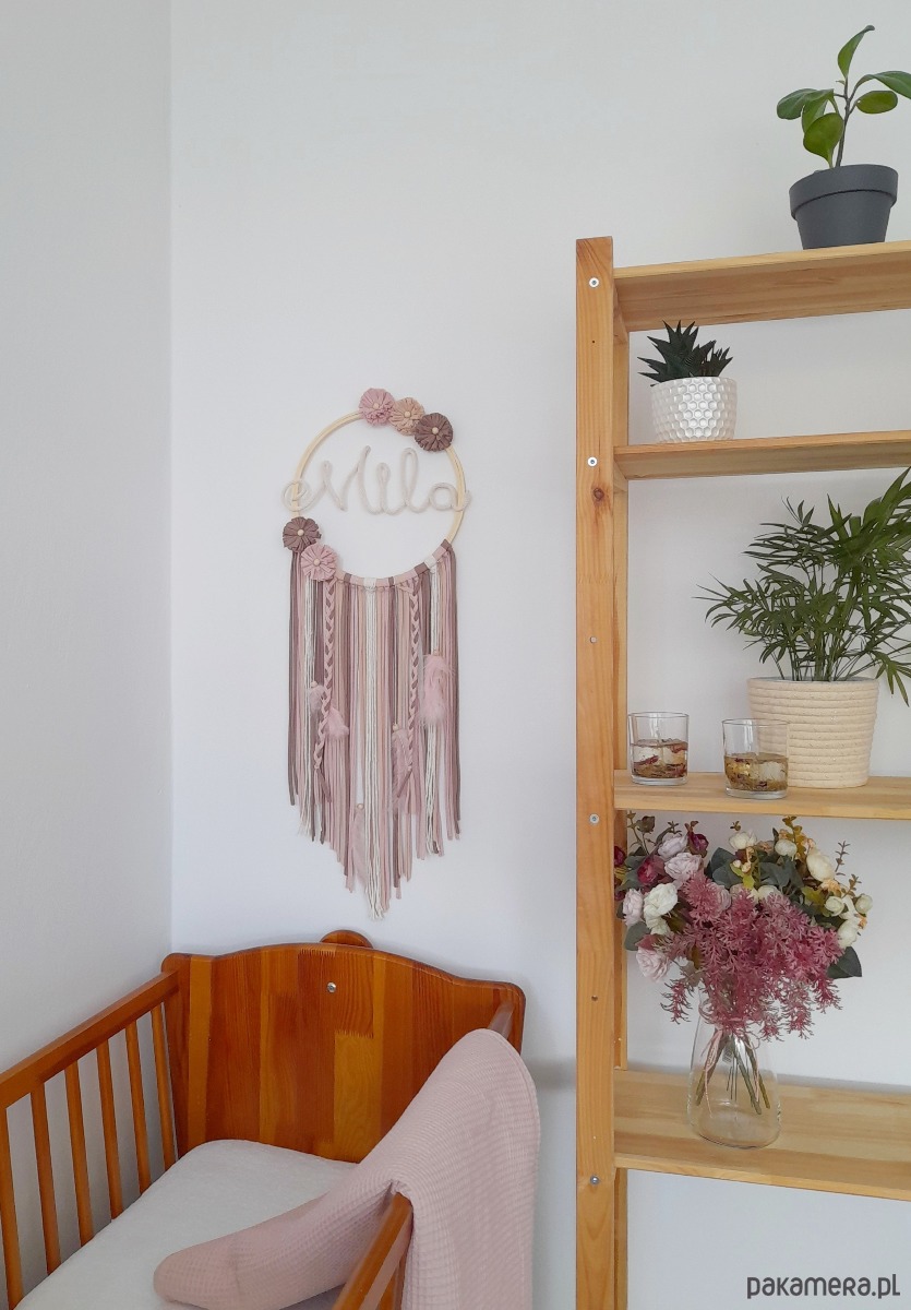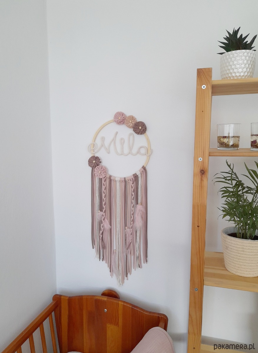 Łapacz snów z imieniem wraz z kolorowymi sznurkami symbolizuje zatrzymanie tylko tych najpiękniejszych snów i chwil Malucha.