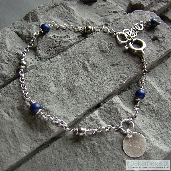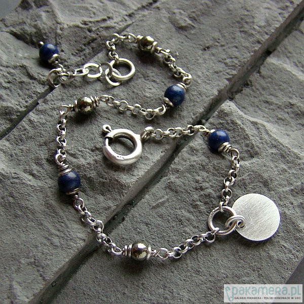 Delikatna, kobieca i nowoczesna bransoletka na co dzień. Wykonana w całości ze srebra próby 925 oraz kulek lapisu lazuli i pirytu wielkości 4 mm. Grubość łańcuszka to 2,2 mm. Całkowita długość bransoletki regulowana, od. 17,5 cm do 20 cm. Ozdobnie zapakowana.