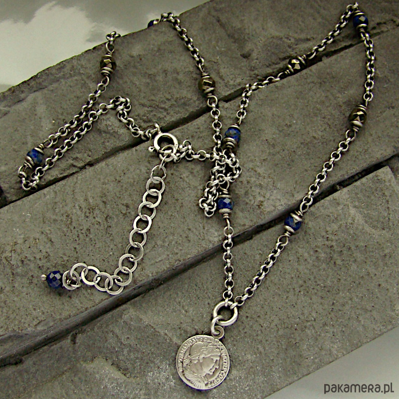 Subtelny, kobiecy naszyjnik na co dzień i nie tylko. Wykonany w całości z oksydowanego srebra próby 925 oraz fasetowanych oponek pirytu i kulek lapisu lazuli wielkości 4 mm. Obwód naszyjnika to 43,5 cm plus regulacja 5 cm, a srednica monety to 1,2 cm. W mojej galerii bransoletka do kompletu. Ozdobnie zapakowany.