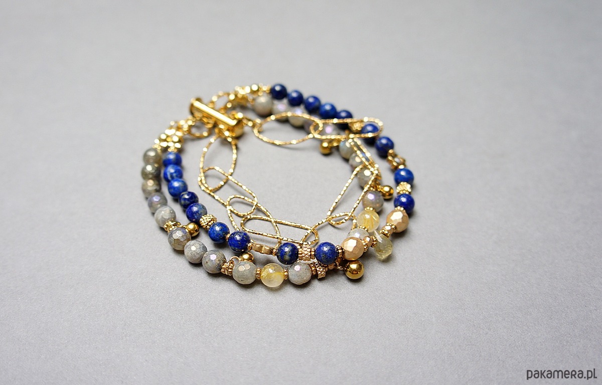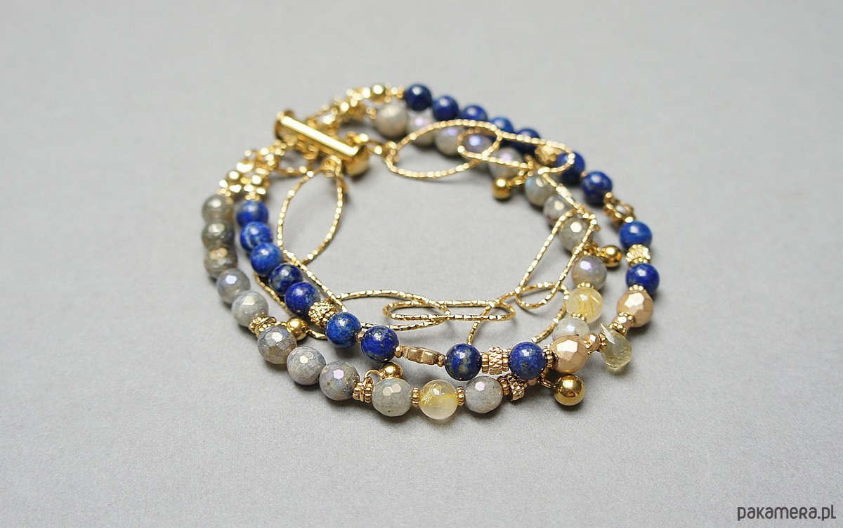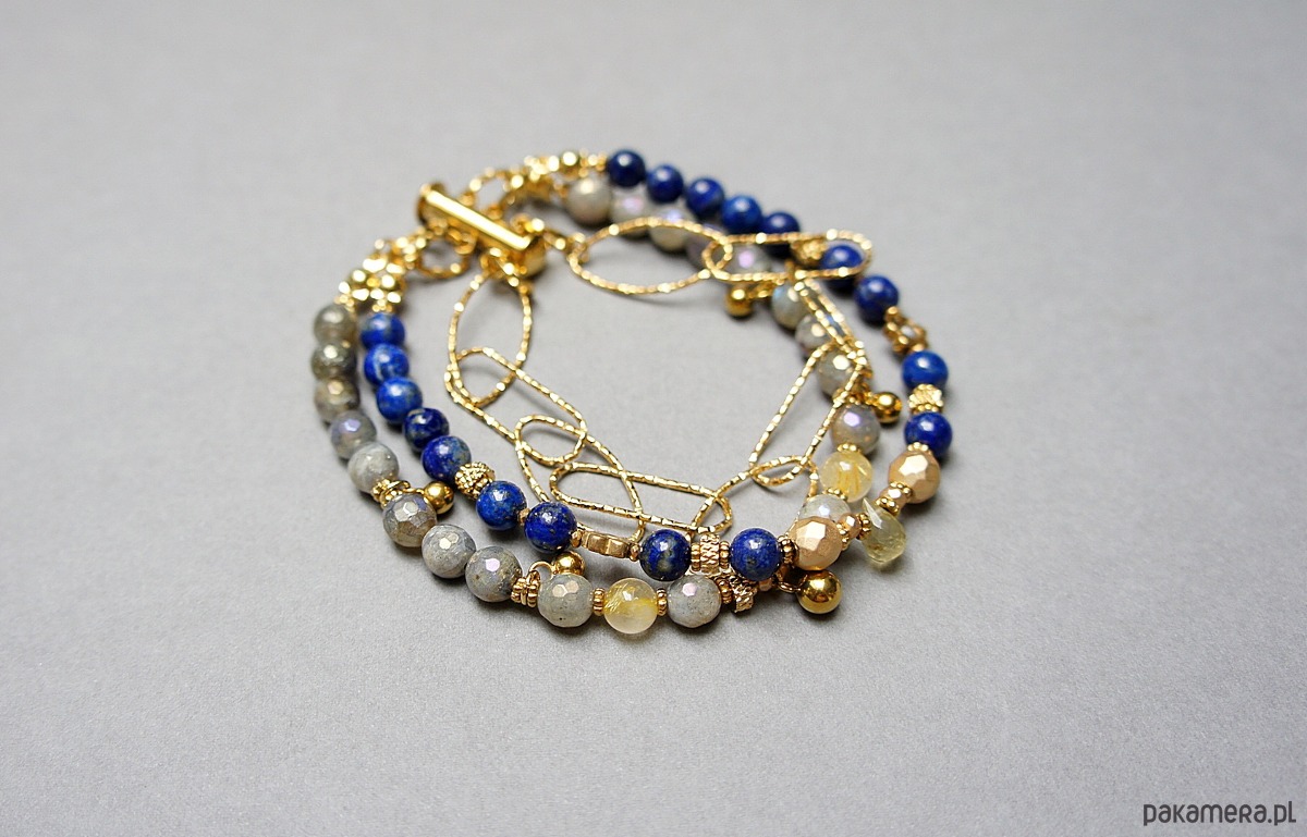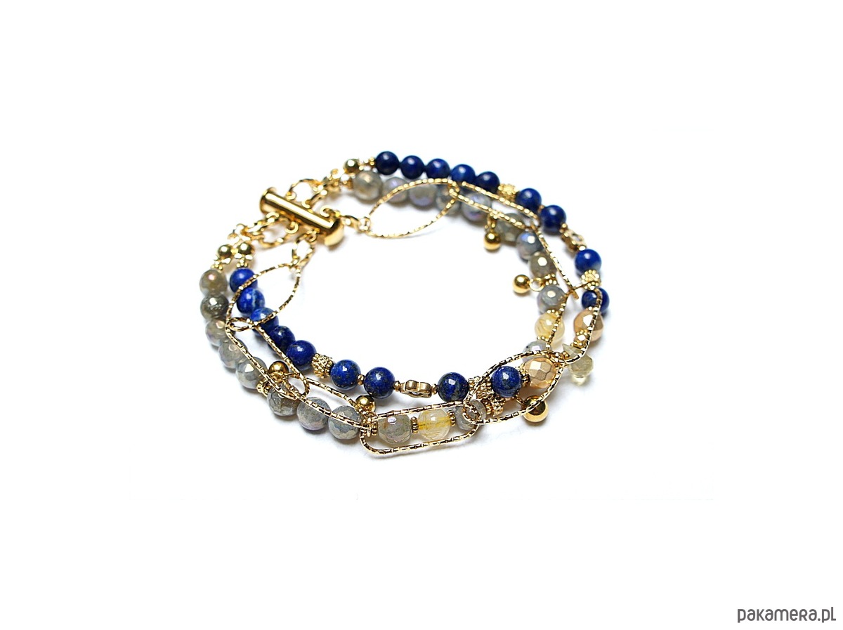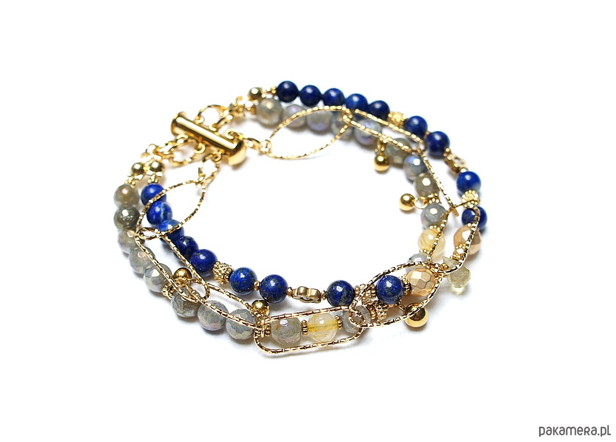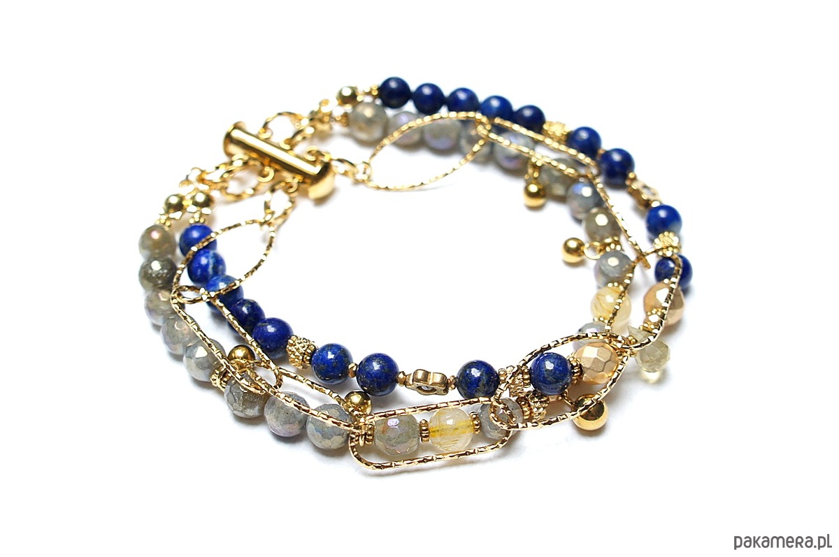 Bransoletka składająca się z trzech sznurów. Wykonane z pozłacanej stali szlachetnej, naturalnych, szlachetnych kamieni - lapis lazuli [5,5mm], fasetowany labradoryt platerowany z efektem mystic [5,5mm], kwarc z rutylem [5,5mm], hematyt fasetowany platerowany [6mm i 3 x 2mm], szafir fasetowany o błękitnym wybarwieniu [1,5mm], przekładek z hematytu [1mm], kropelki fasetowanej kwarcu. Zapięcie kasetkowe. Całkowita długość ok. 21cm. Biżuteria ozdobnie zapakowana.