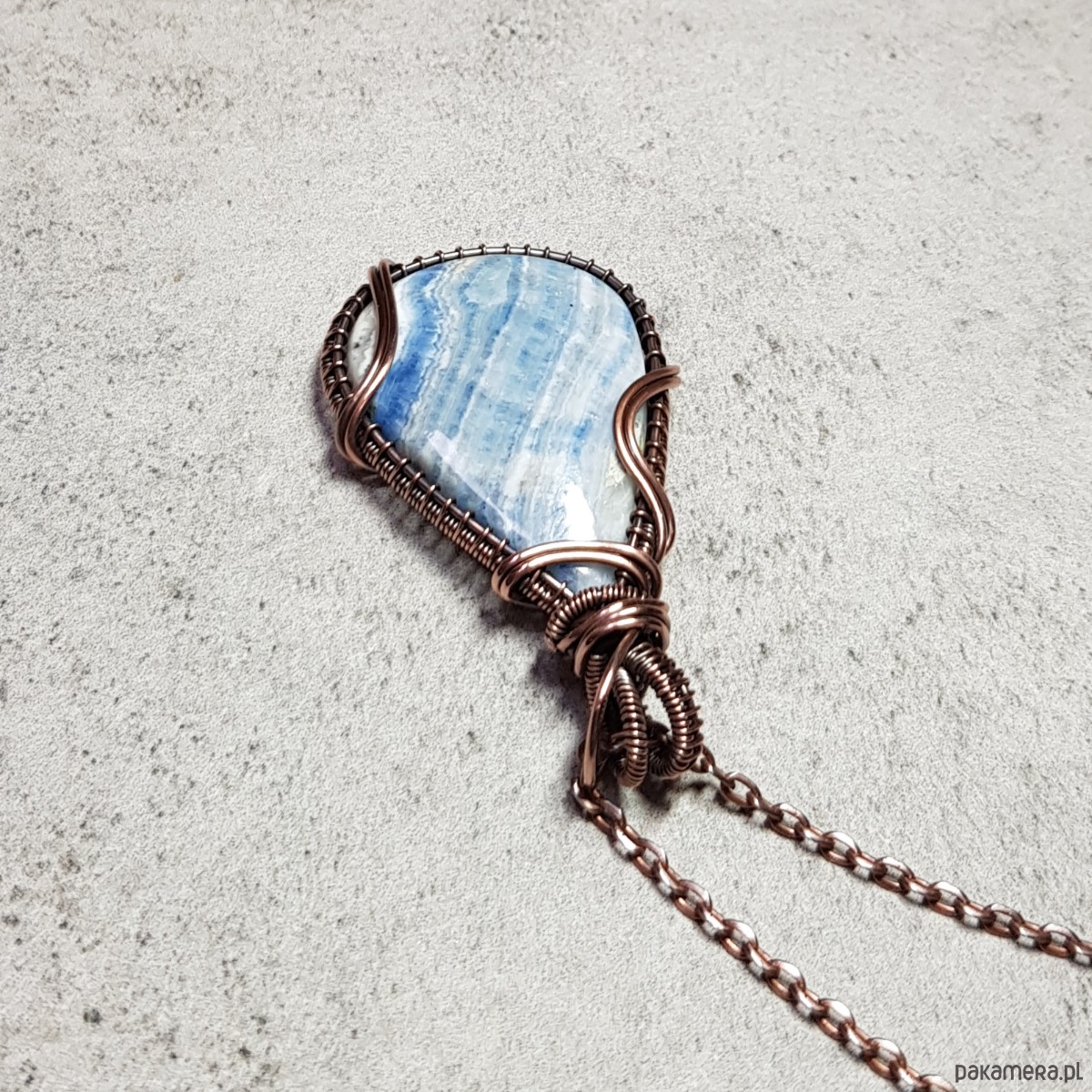 Zawieszka wykonana ręcznie metodą wire-wrappingu której głównym elementem jest naturalny niebieski szelit (lapis lace onyx). Do wykonania wisiorka użyłam drutu z miedzi, następnie zaoksydowałam i wypolerowałam w celu uzyskania szlachetnego efektu postarzenia. Wymiary zawieszki 54x24mm z łańcuszkiem długości około 48-50 cm.