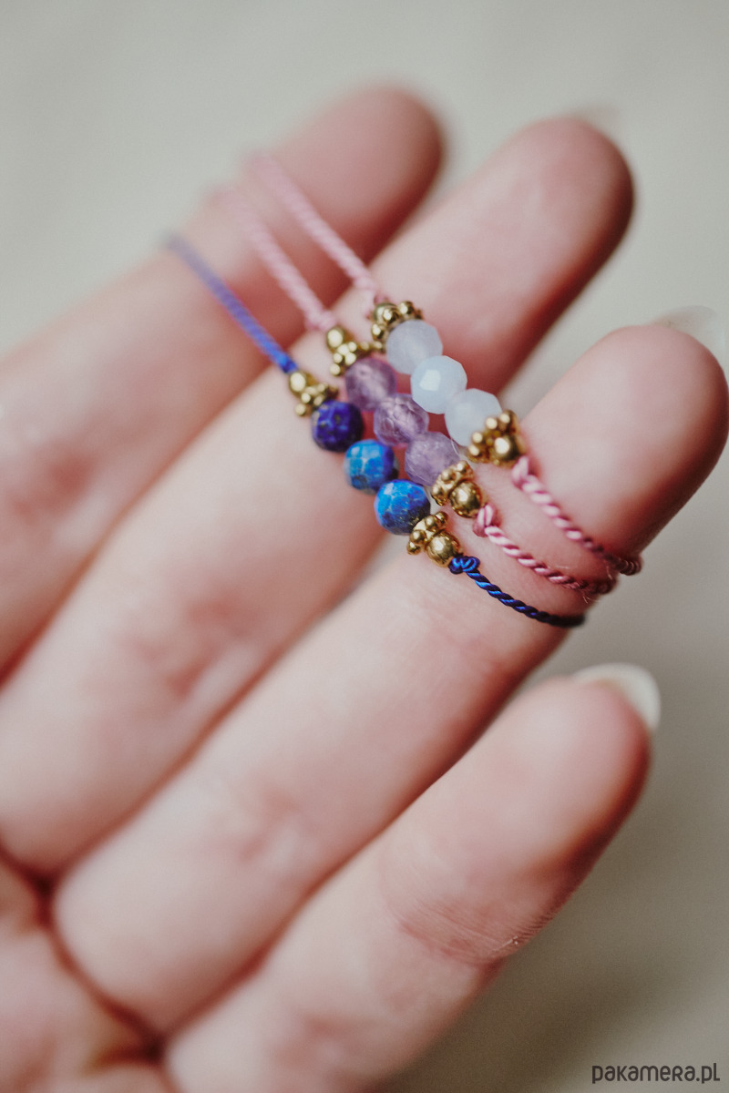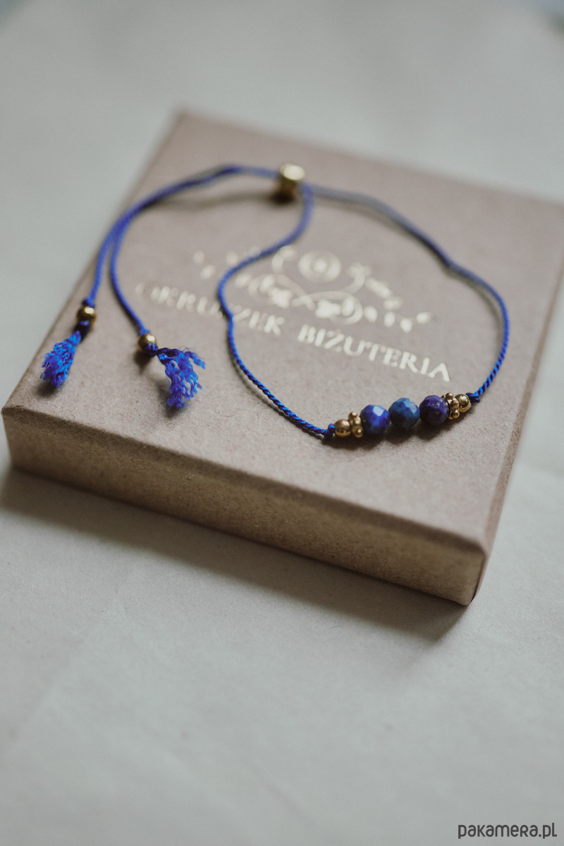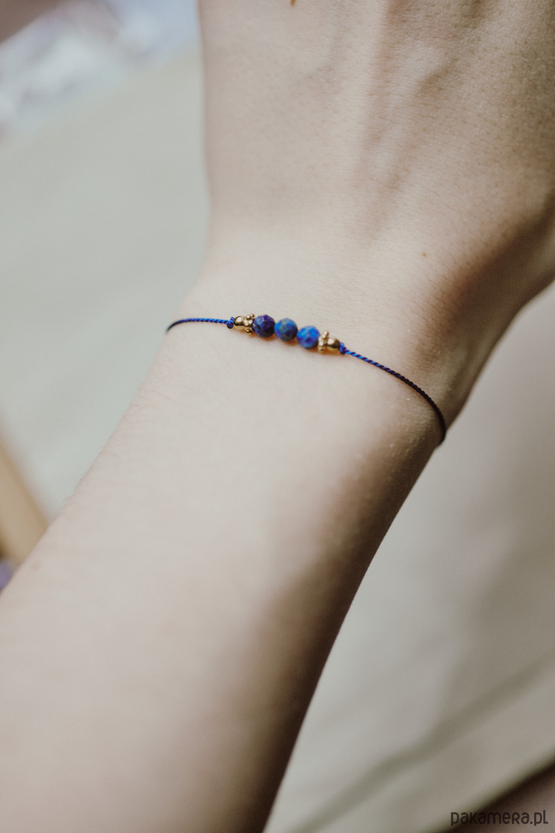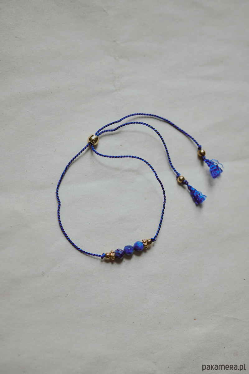 Delikatna, lekka bransoletka z wygodną i szeroką regulacją. Niebieski laspis lazuli zapleciony na jedwabnej nici w kolorze głębokiego granatu. Eleganckie złote przekładki.