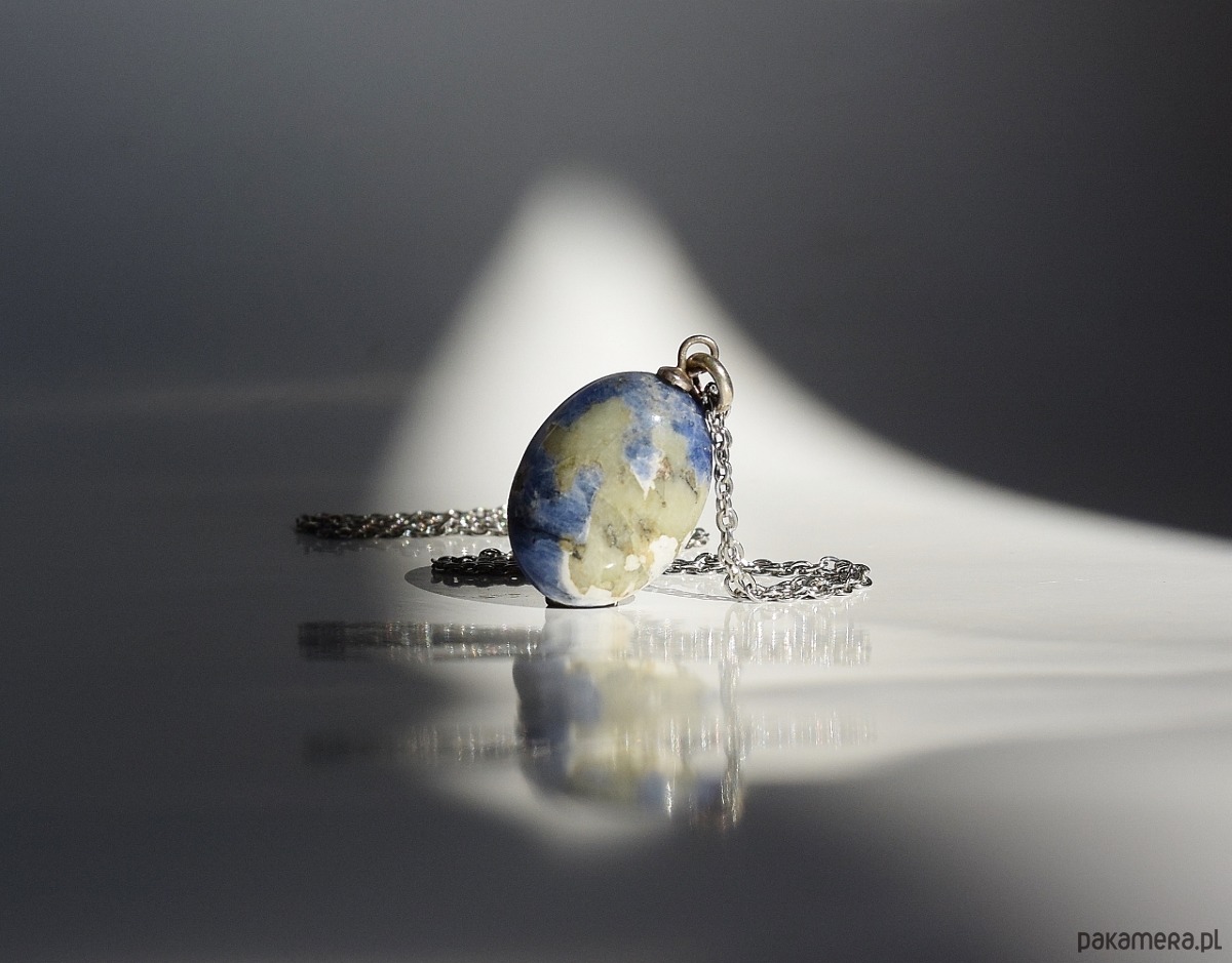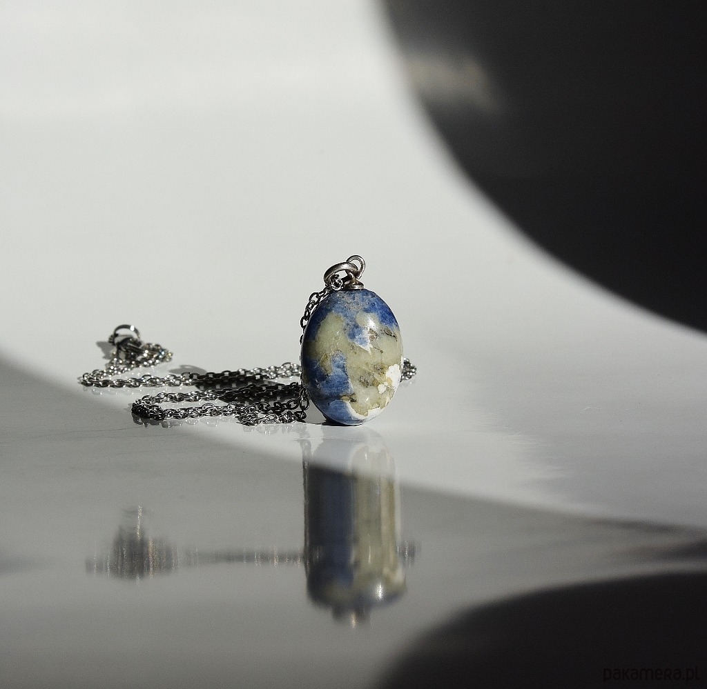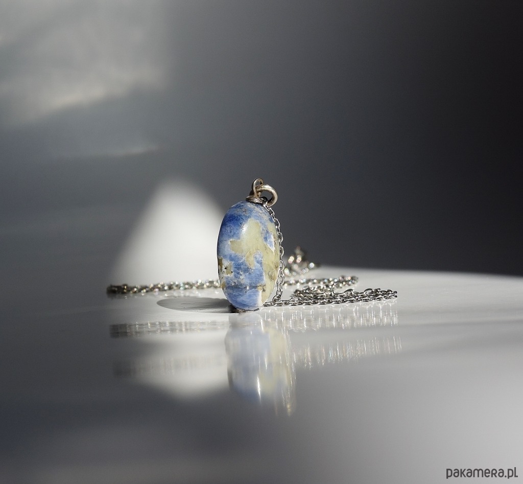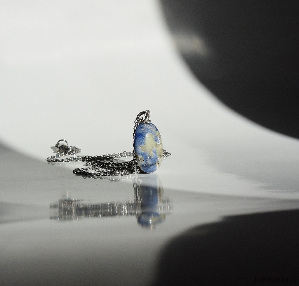 Naszyjnik wykonany został z wyjątkowego kawałka lapis lazuli w którym lazuryt występuje razem z innym minerałem - kalcytem. Wisiorek w formie kaboszonu zawieszony został na łańcuszku ze stali chirurgicznej (nie powoduje uczulenia). Kamień po jednej stronie jest wyszlifowany na płasko, a po drugiej jest półokrągły (widoczne na zdjęciu).