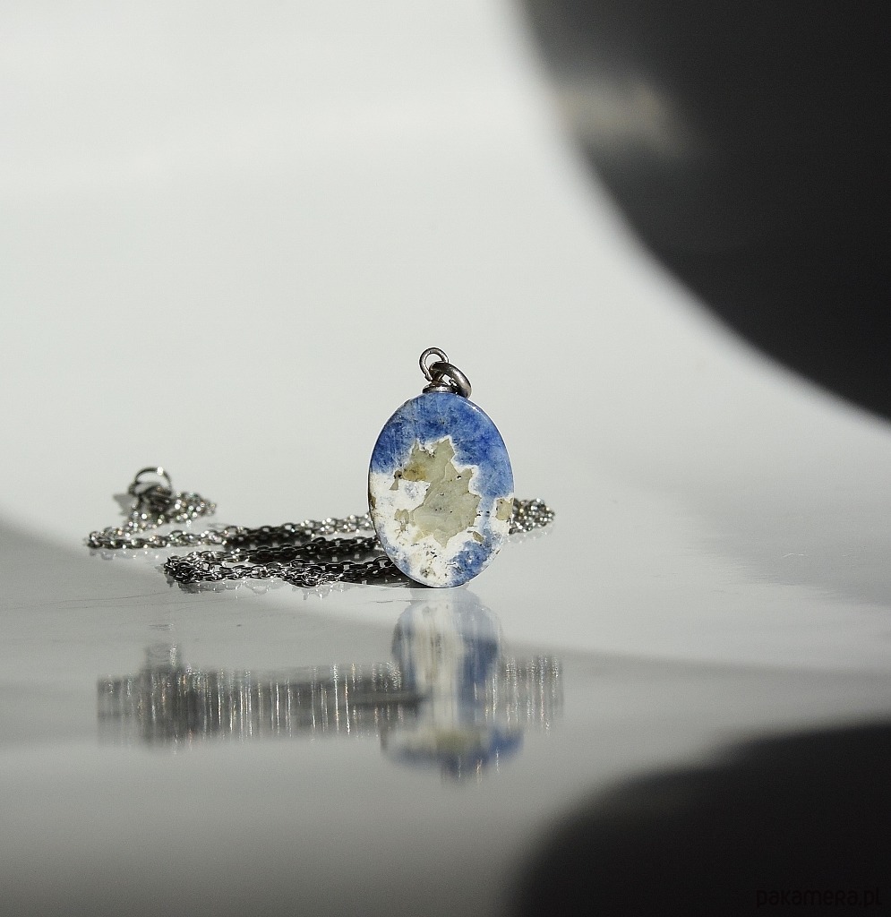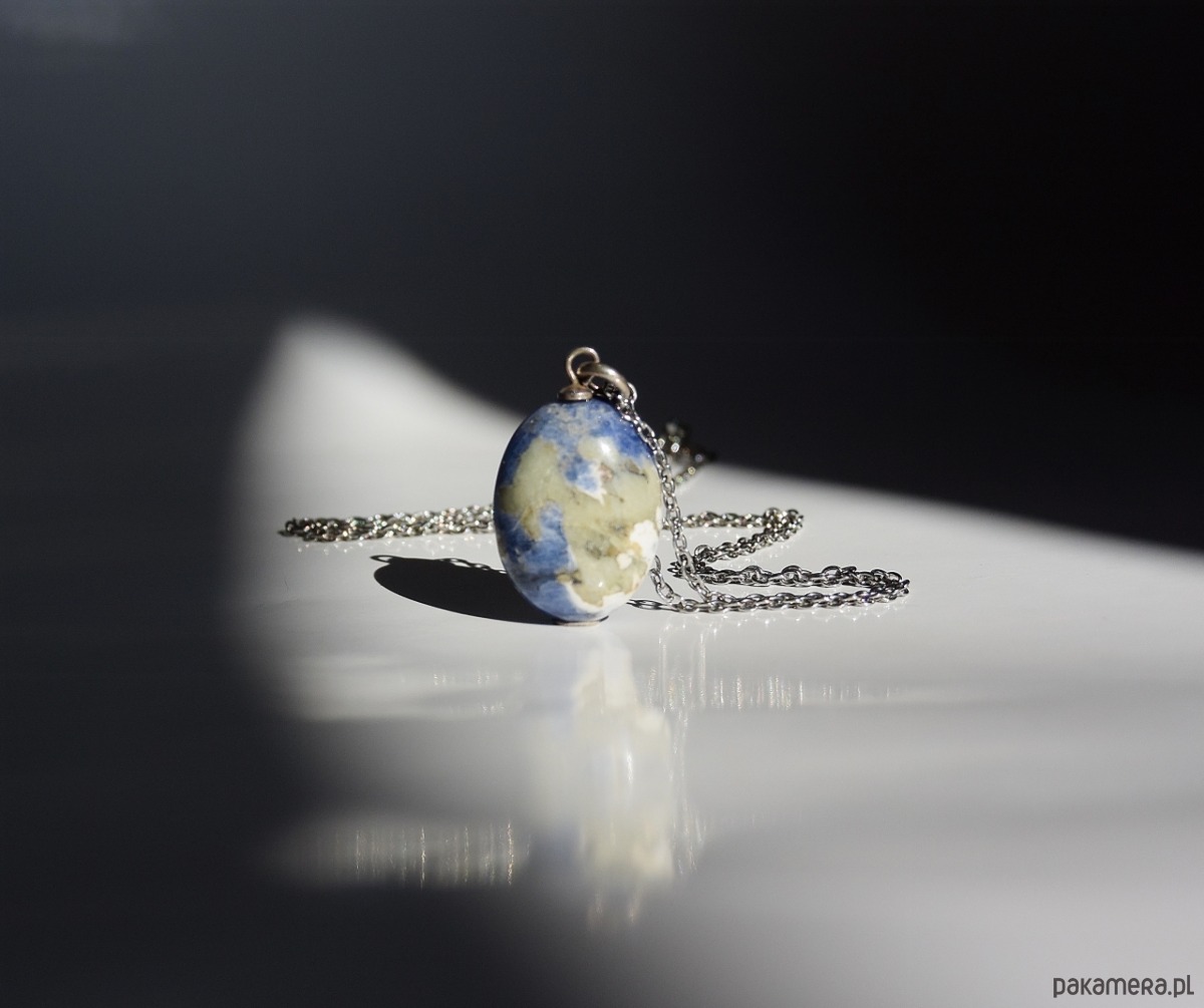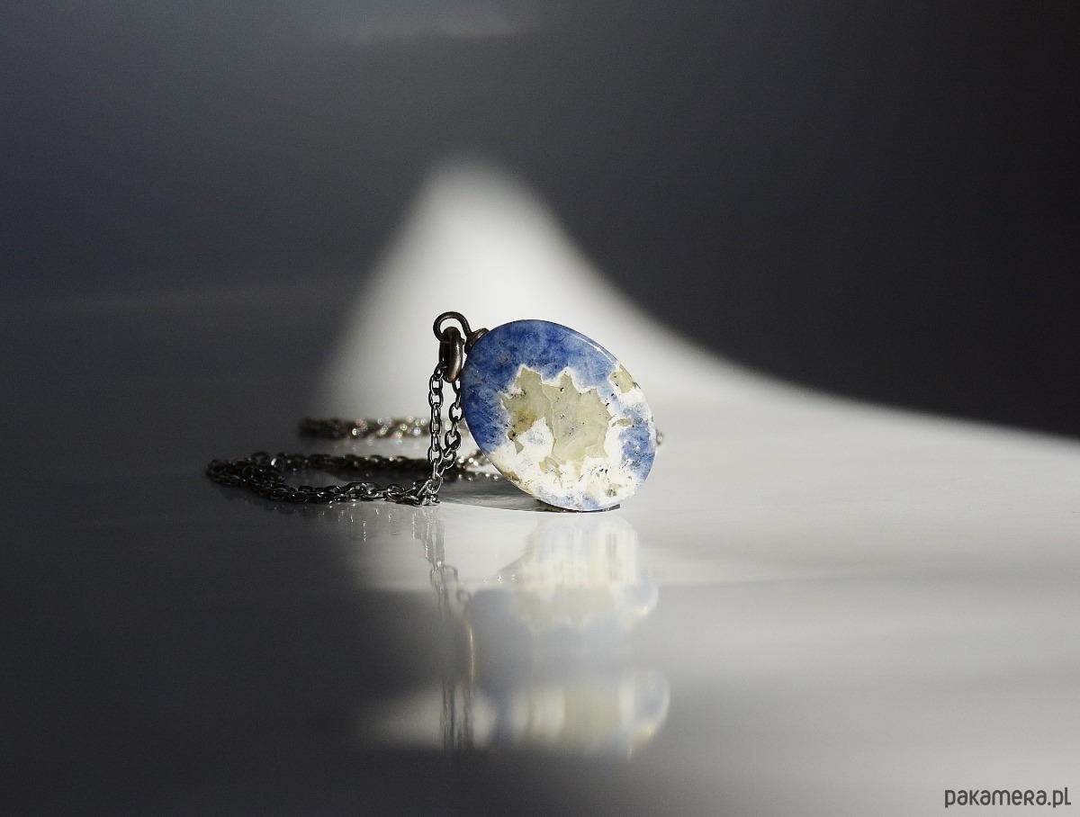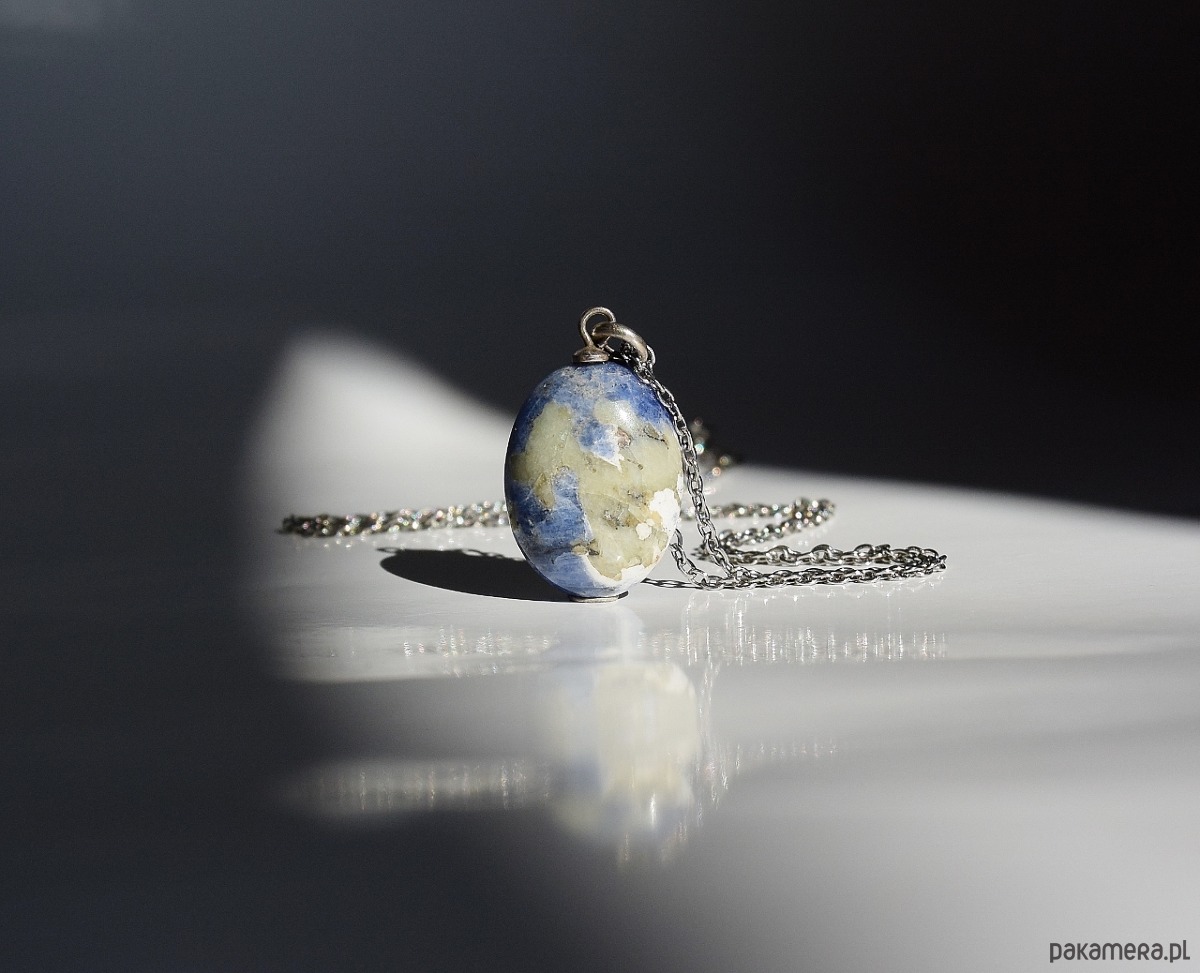 Naszyjnik wykonany został z wyjątkowego kawałka lapis lazuli w którym lazuryt występuje razem z innym minerałem - kalcytem. Wisiorek w formie kaboszonu zawieszony został na łańcuszku ze stali chirurgicznej (nie powoduje uczulenia). Kamień po jednej stronie jest wyszlifowany na płasko, a po drugiej jest półokrągły (widoczne na zdjęciu).