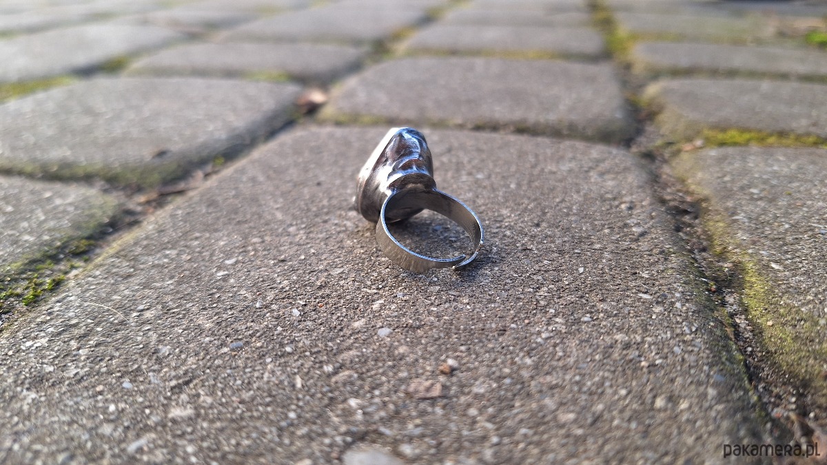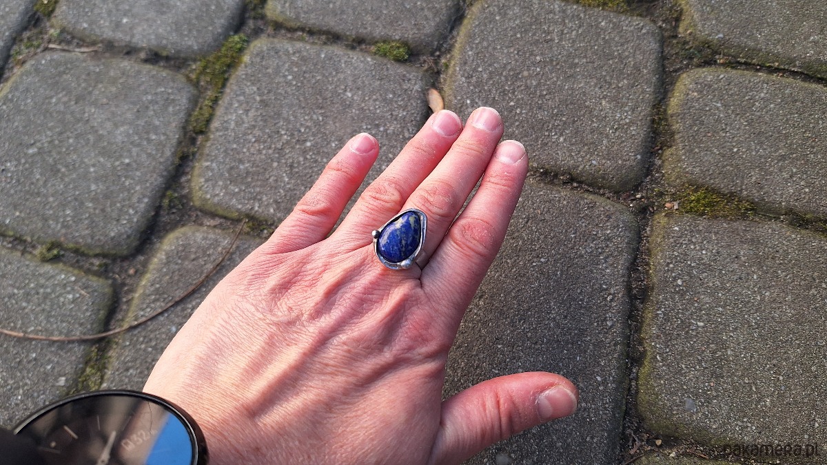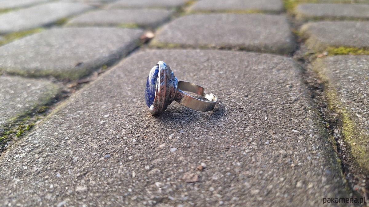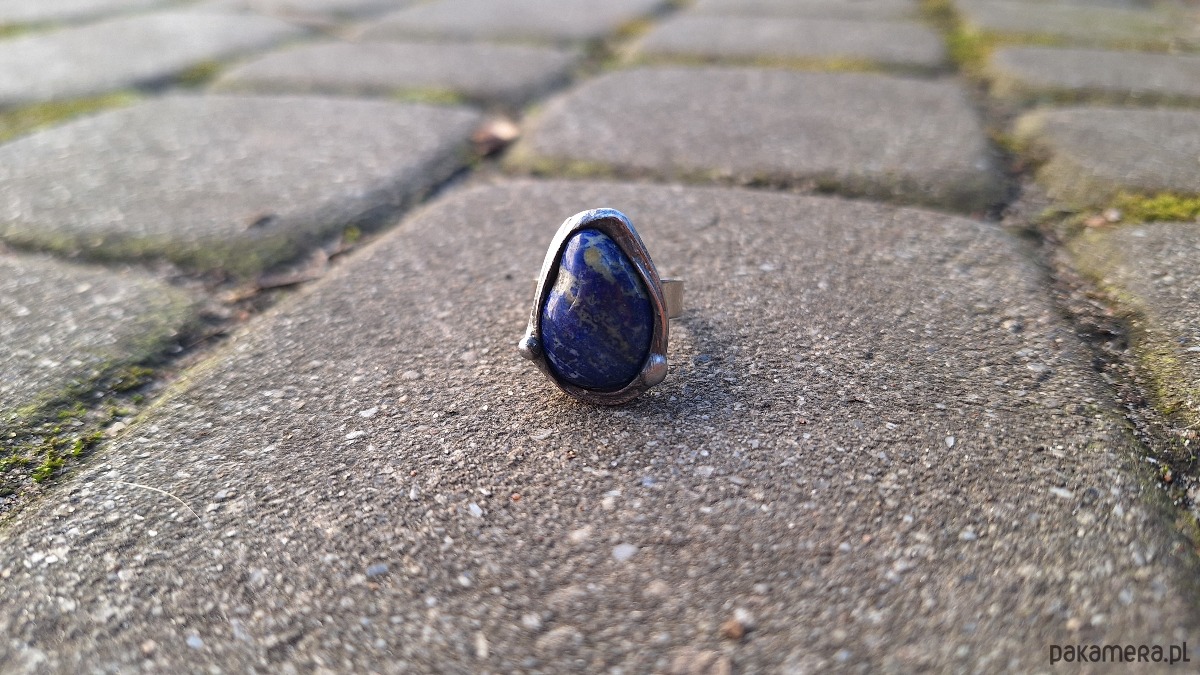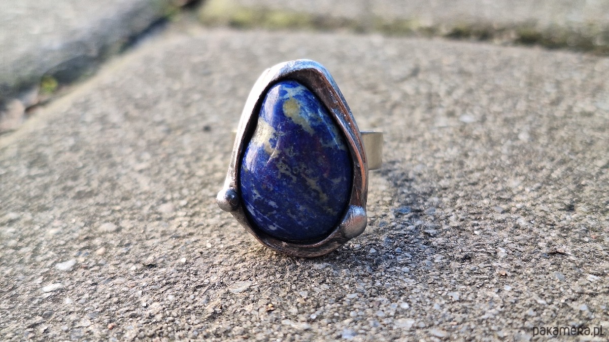Pierścionek wykonany z miedzi, cyny i lapis lazuli. Wymiary ok. 2 na 1.5 cm. Regulowany. Nie jest ciężki.