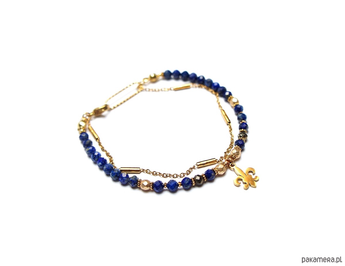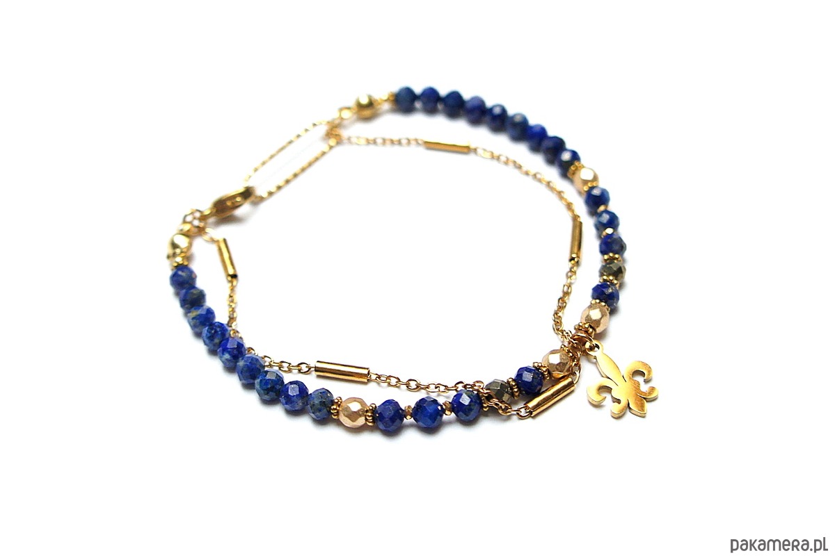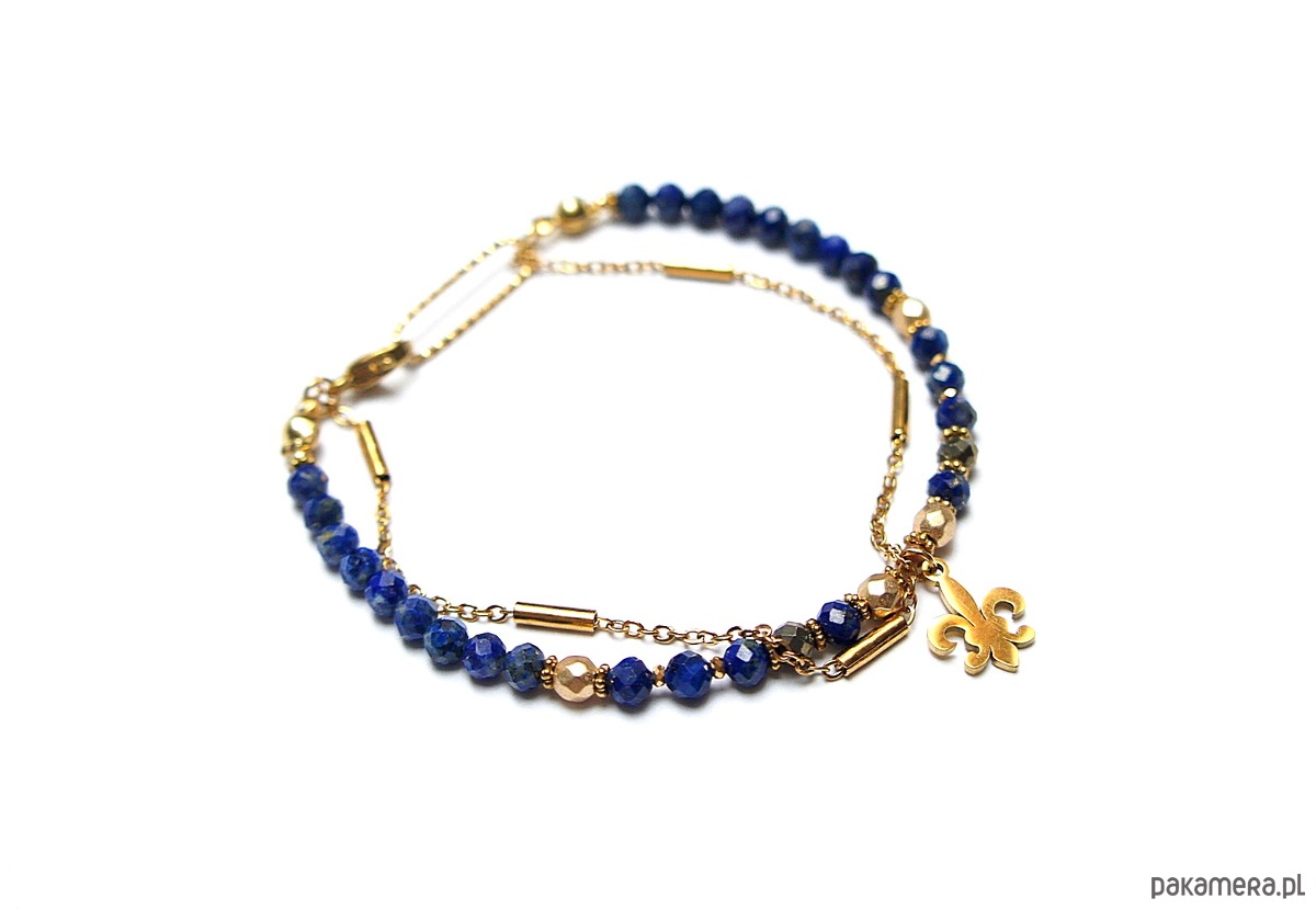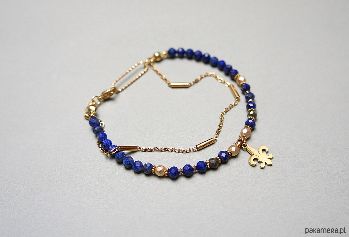 Delikatna bransoletka wykonana w całości ze stali szlachetnej pozłacanej oraz naturalnych, szlachetnych kamieni - fasetowany lapis lazuli [4mm], fasetowany hematyt o matowej powłoce [4mm], piryt o surowym wyglądzie [3,5mm], przekładek z hematytu [1mm]. Całkowita długość bransoletki ok. 19cm. Na życzenie możemy dopasować bransoletkę do innego nadgarstka - w tej sprawie prosimy o wcześniejszy kontakt. Biżuteria ozdobnie zapakowana.