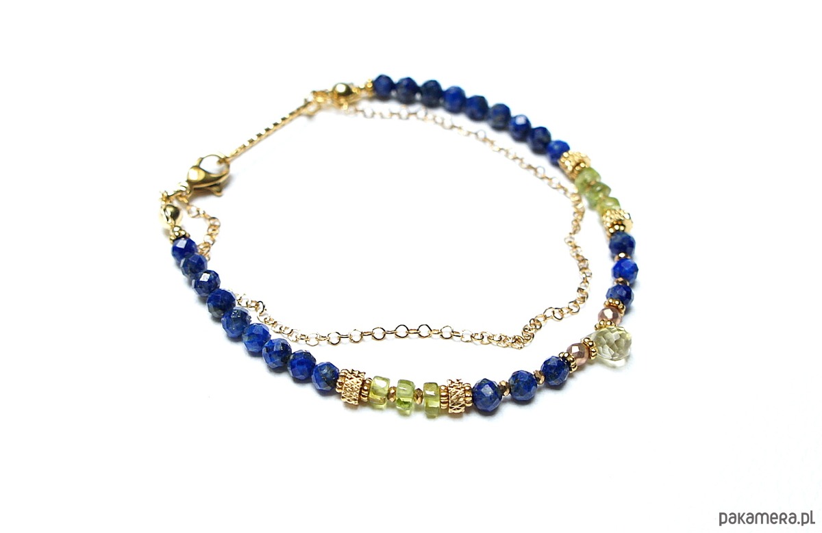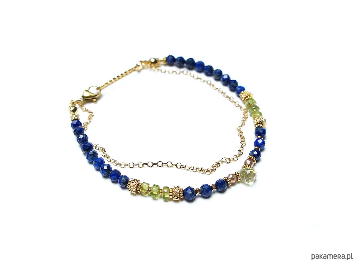 Delikatna bransoletka wykonana w całości ze stali szlachetnej pozłacanej oraz naturalnych kamieni - fasetowany lapis lazuli [4mm], fasetowany hematyt o matowej powłoce [2mm], nieregularne talarki peridotu [ok. 4 x 2mm], przekładek z hematytu [1mm] oraz brioletki fasetowanej kwarcu lemon. Całkowita długość bransoletki ok. 19,5cm. Na życzenie możemy dopasować bransoletkę do innego nadgarstka - w tej sprawie prosimy o wcześniejszy kontakt.