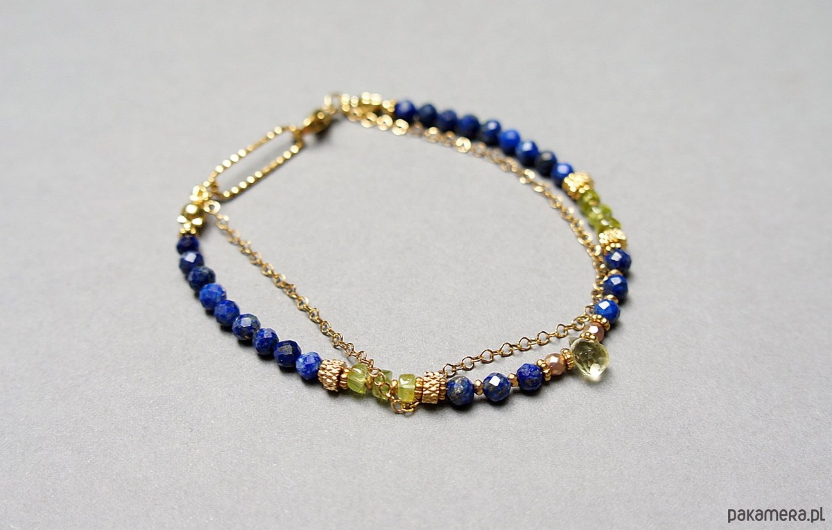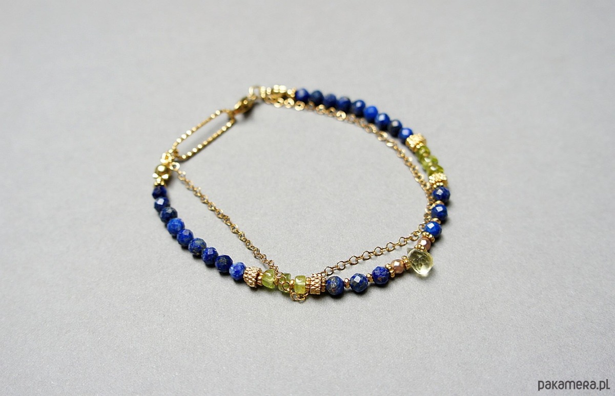 Delikatna bransoletka wykonana w całości ze stali szlachetnej pozłacanej oraz naturalnych kamieni - fasetowany lapis lazuli [4mm], fasetowany hematyt o matowej powłoce [2mm], nieregularne talarki peridotu [ok. 4 x 2mm], przekładek z hematytu [1mm] oraz brioletki fasetowanej kwarcu lemon. Całkowita długość bransoletki ok. 19,5cm. Na życzenie możemy dopasować bransoletkę do innego nadgarstka - w tej sprawie prosimy o wcześniejszy kontakt.
