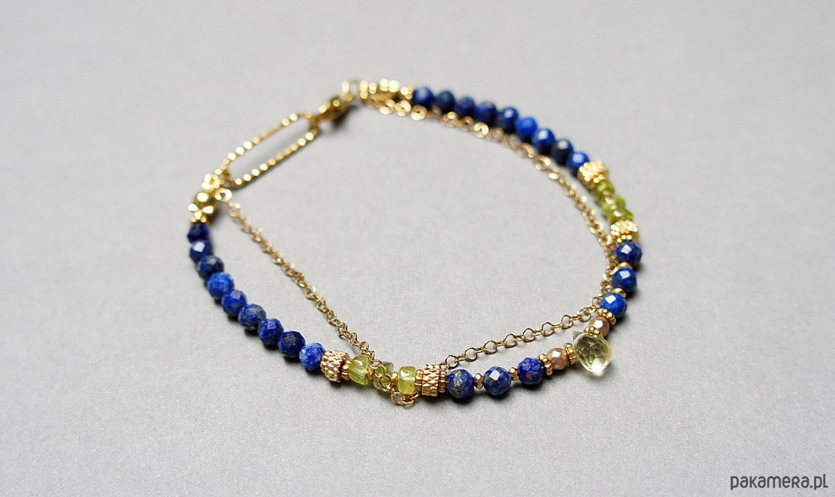 Delikatna bransoletka wykonana w całości ze stali szlachetnej pozłacanej oraz naturalnych kamieni - fasetowany lapis lazuli [4mm], fasetowany hematyt o matowej powłoce [2mm], nieregularne talarki peridotu [ok. 4 x 2mm], przekładek z hematytu [1mm] oraz brioletki fasetowanej kwarcu lemon. Całkowita długość bransoletki ok. 19,5cm. Na życzenie możemy dopasować bransoletkę do innego nadgarstka - w tej sprawie prosimy o wcześniejszy kontakt.