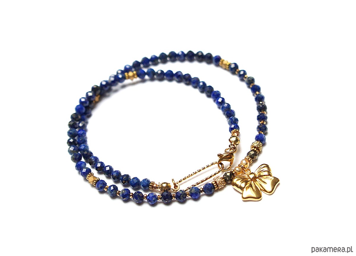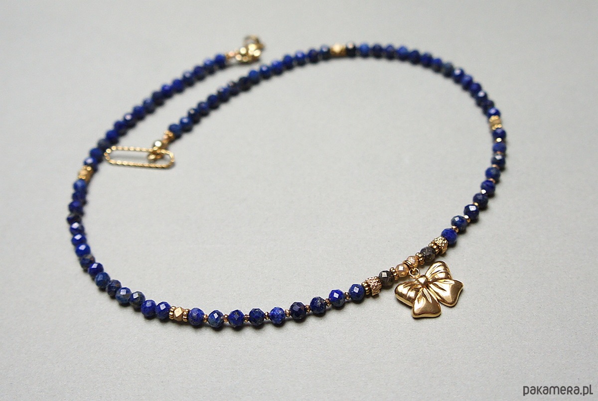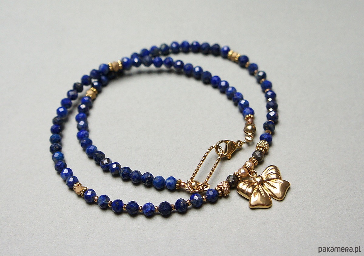 Krótki, delikatny naszyjnik wykonany w całości ze stali szlachetnej pozłacanej oraz naturalnych kamieni - fasetowany lapis lazuli [4mm], fasetowany piryt o surowym wyglądzie [3,5mm], fasetowany, platerowany hematyt o matowej powłoce [ 3mm], przekładek z hematytu [3 x 2mm oraz 1mm]. Naszyjnik o długości ok. 42cm.