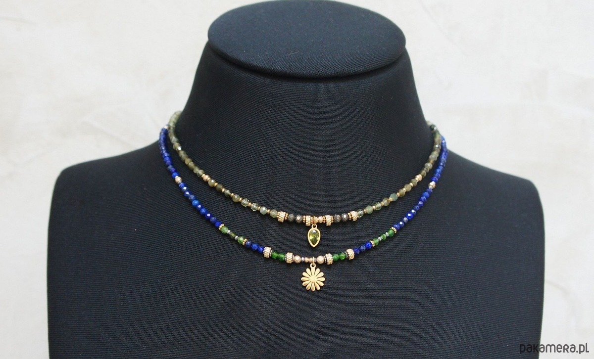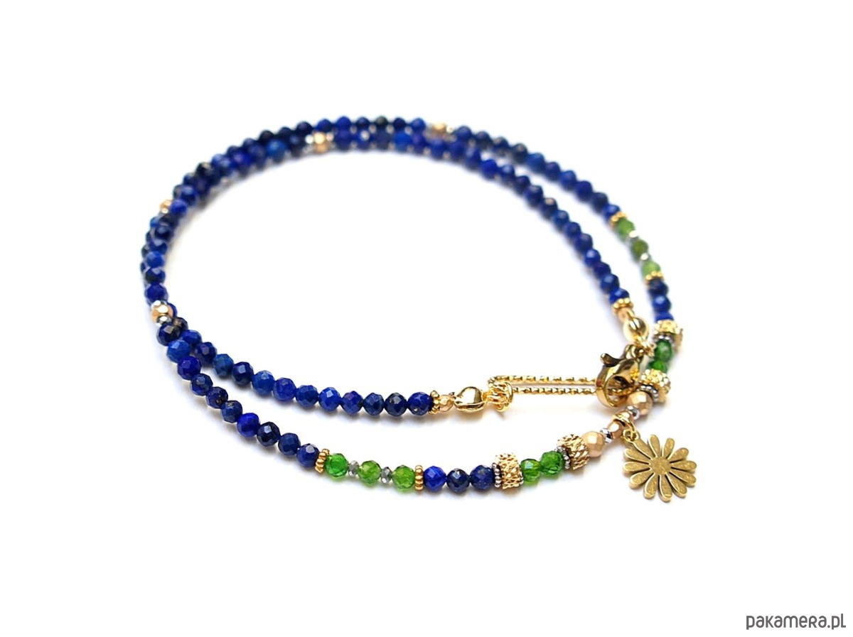 Krótki, delikatny naszyjnik wykonany w całości ze stali szlachetnej, stali szlachetnej pozłacanej oraz naturalnych kamieni - fasetowany lapis lazuli [3mm], fasetowany diopsyd [3mm], fasetowany, platerowany hematyt o matowej powłoce [ 3mm], przekładek z hematytu [3 x 2mm oraz 1mm]. Naszyjnik o długości ok. 42cm.