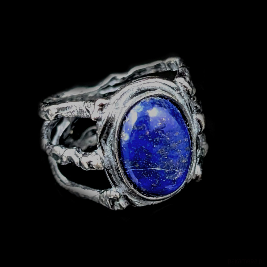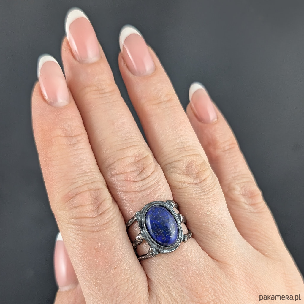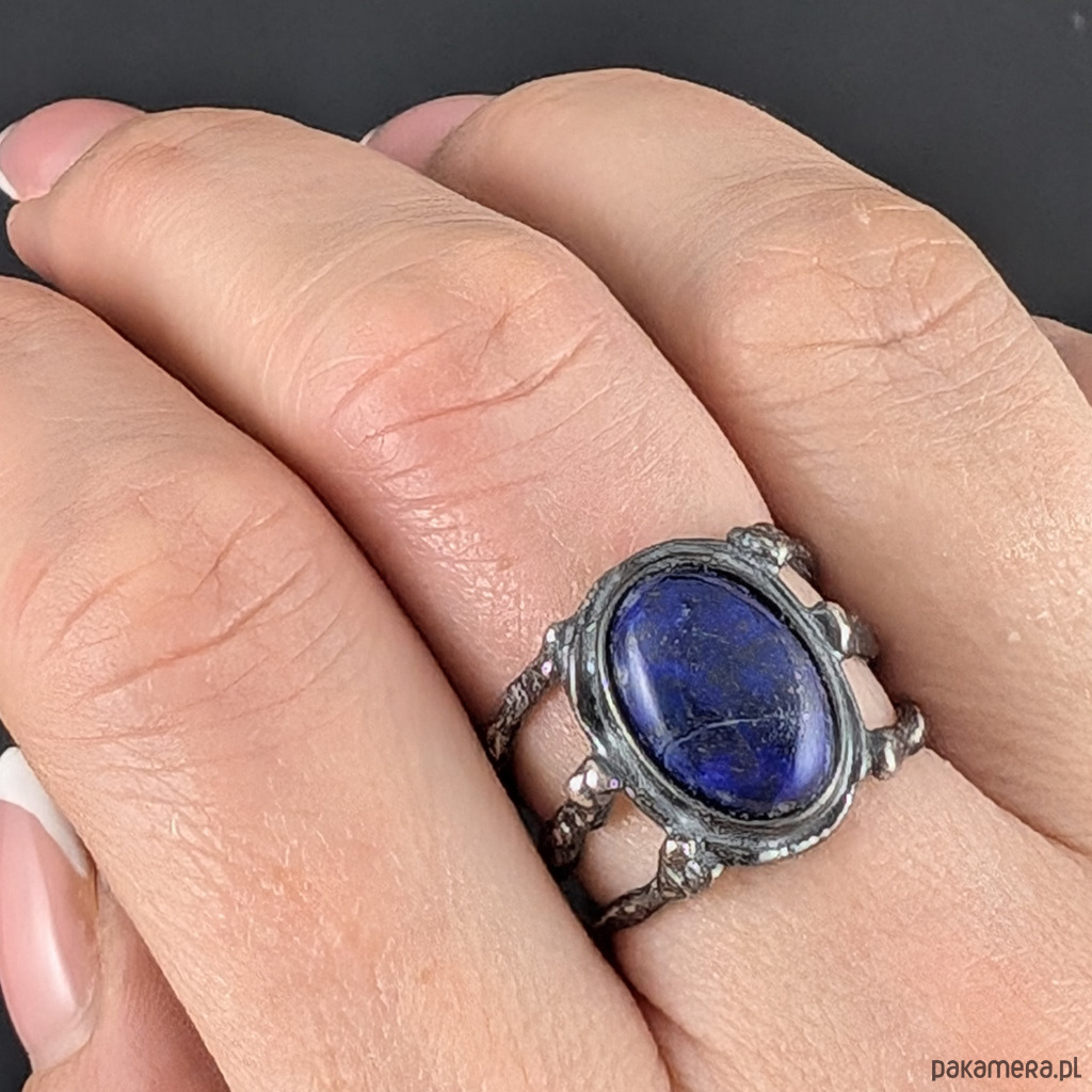 Kobiecy pierścionek z oprawionym w potrójną ramę oksydowanego srebra próby 925 lapisem lazuli. Obrączka szerokość max. 14 mm. Wymiary oprawy pierścionka 17 x13 mm. Rozmiar jubilerski 17, z możliwością powiększenia na max. 18. Proszę napisać na jaki dopasować. Waga 5.8 g. Pierścień zapakowany zostanie w ozdobne pudełeczko.