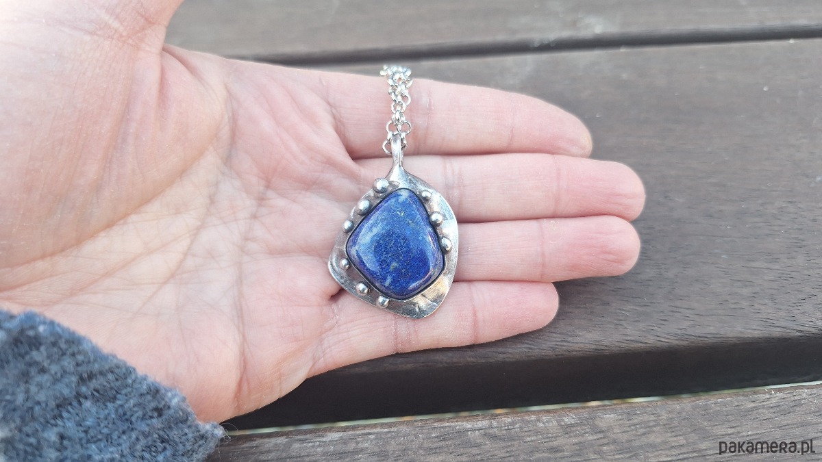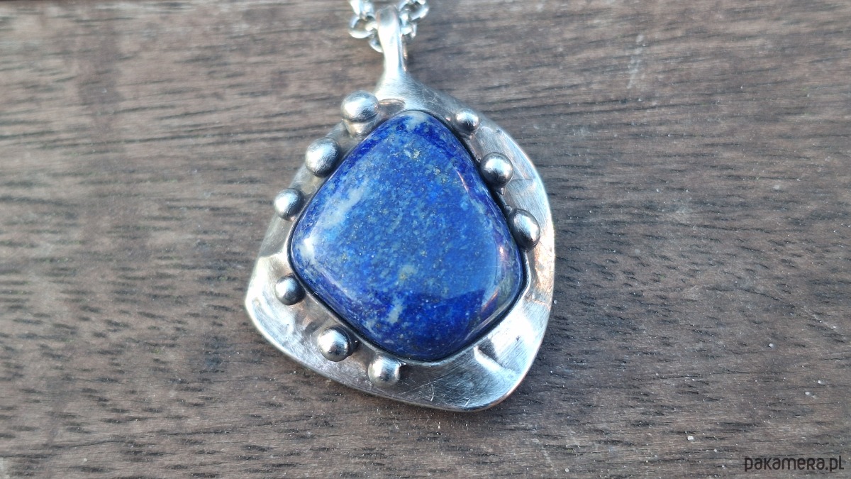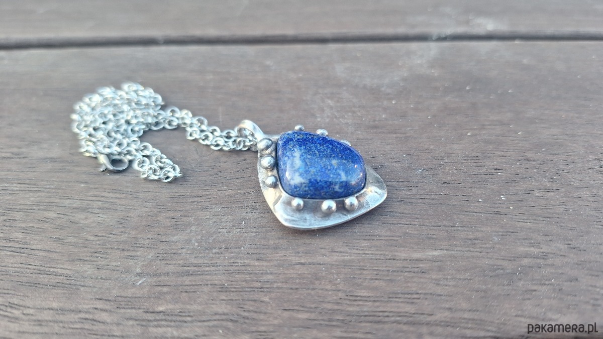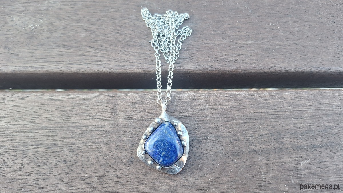 Wisiorek wykonany z miedzi, cyny i lapis lazuli. Wymiary ok. 3.5 na 3 cm. Zawieszony na łańcuszku o długości ok. 50 cm.