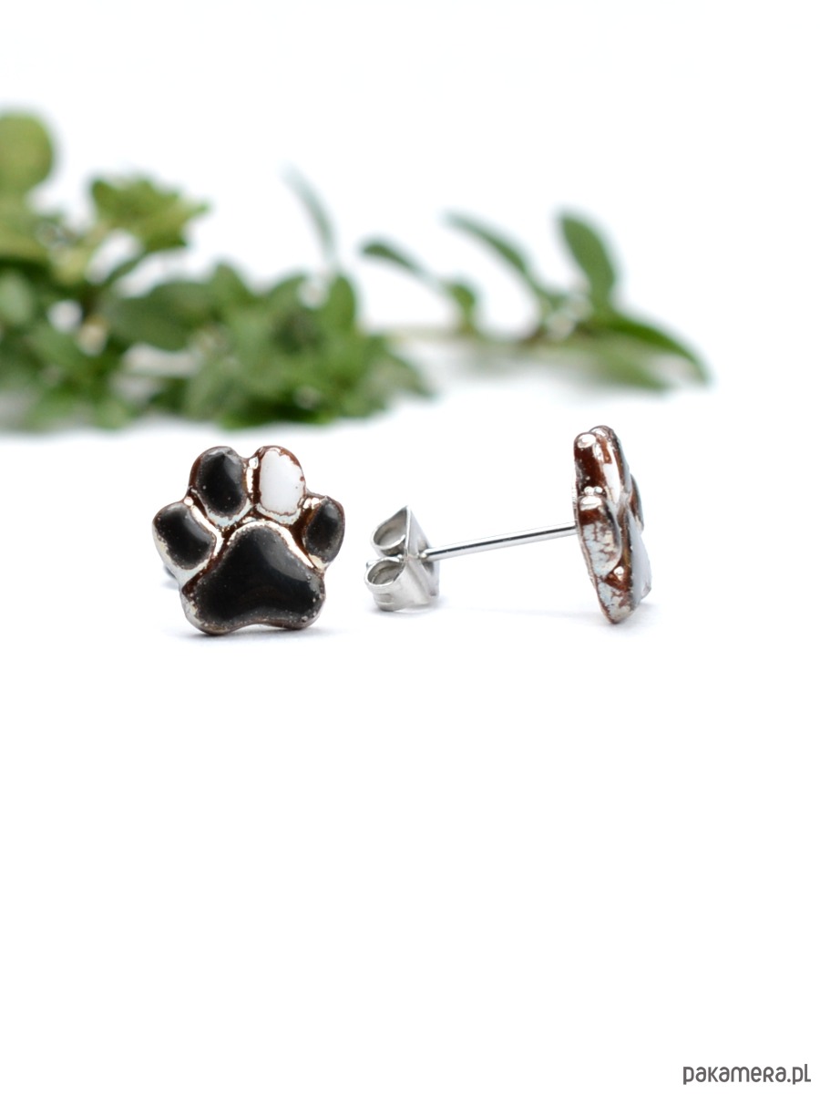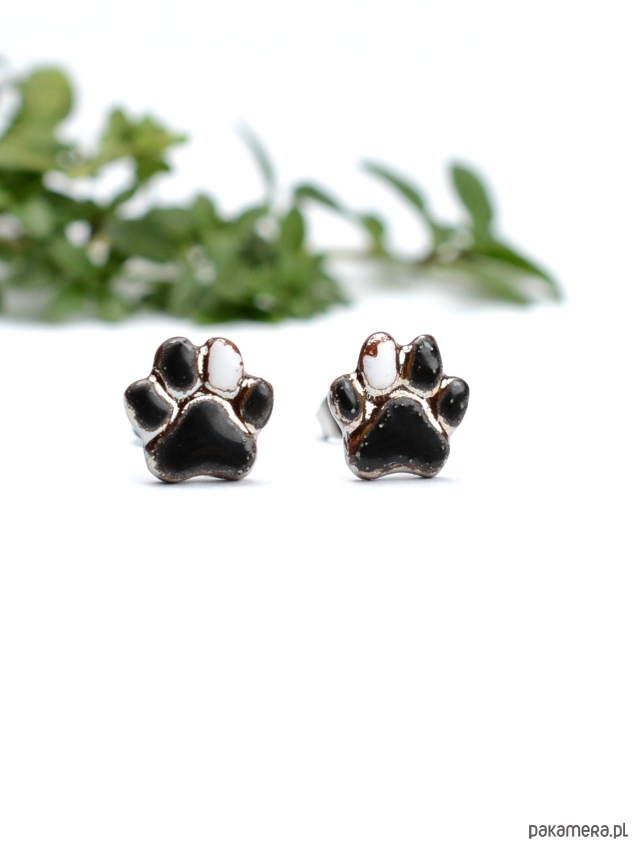 Kolczyki mają kształt łapek i są delikatnie wypukłe:) Ich rozmiar to 9mm.Czarne z jednym białym opuszkiem , otoczone szklwem z połyskiem metalicznym. Element ceramiczny został umocowany na sztyftach ze stali chirurgicznej. Kolczyki wysyłam w ozdobnym pudełeczku- gotowe na prezent:)