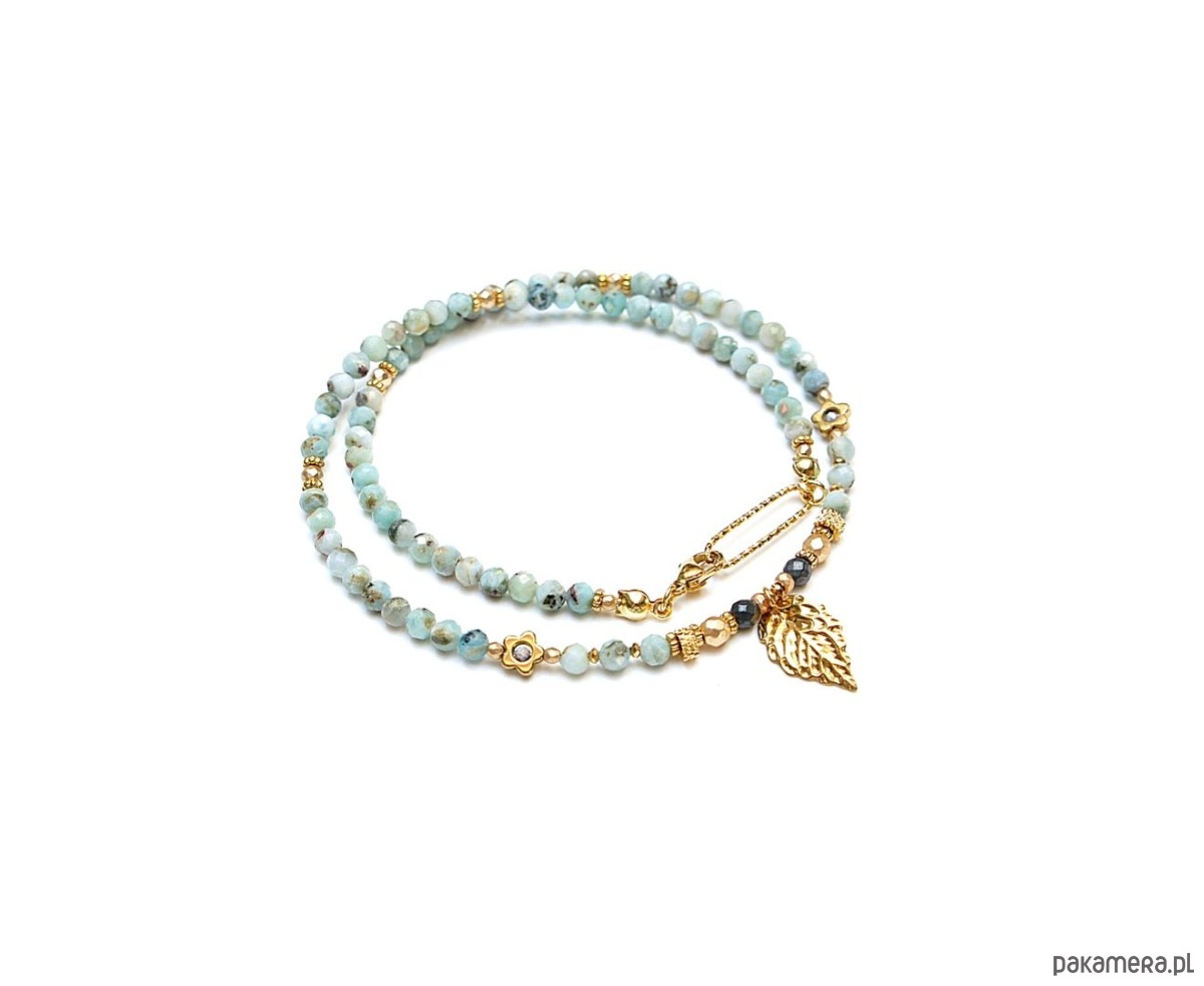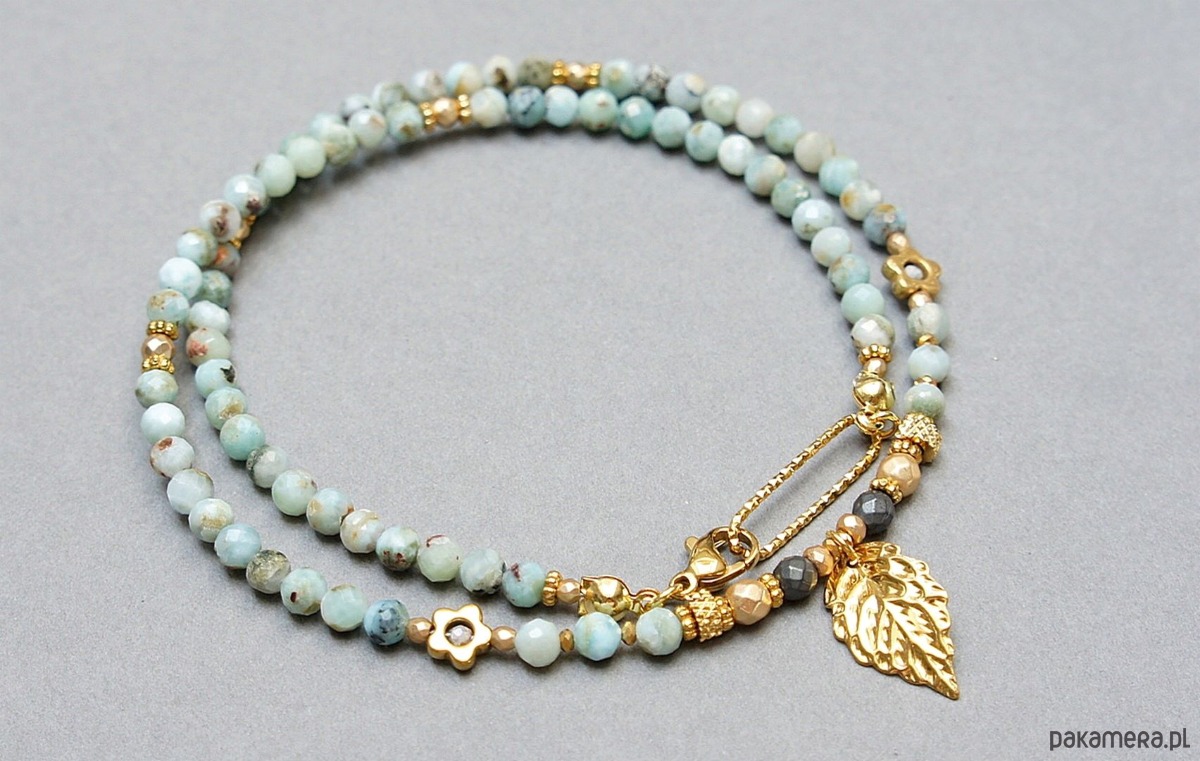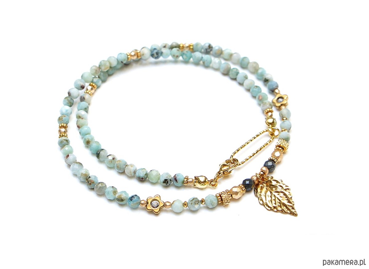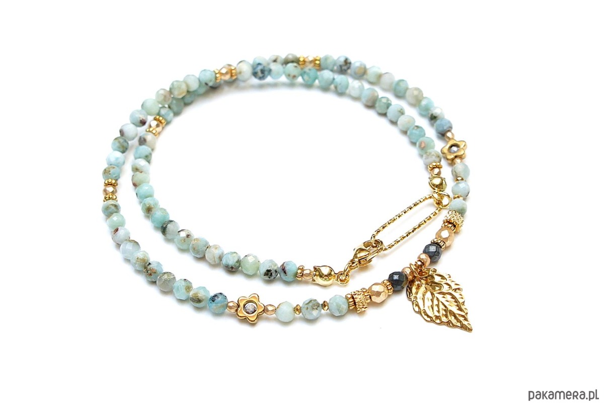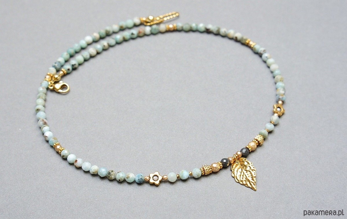 Krótki, delikatny naszyjnik wykonany w całości z pozłacanej stali szlachetnej, fasetowanego larimaru [4mm; rzadki minerał występujący tylko na Dominikanie], szafirów fasetowanych o błękitnym wybarwieniu [1,5mm], hematytu fasetowanego, platerowanego o matowej powłoce [4mm, 2mm i 3 x 2mm], przekładek z hematytu [1mm], kwiatków z hematytu [6mm]. Naszyjnik o długości ok. 42,5cm. Biżuteria ozdobnie zapakowana. Jedyny egzemplarz.