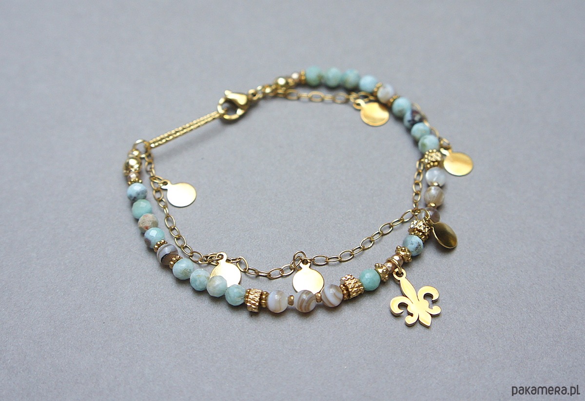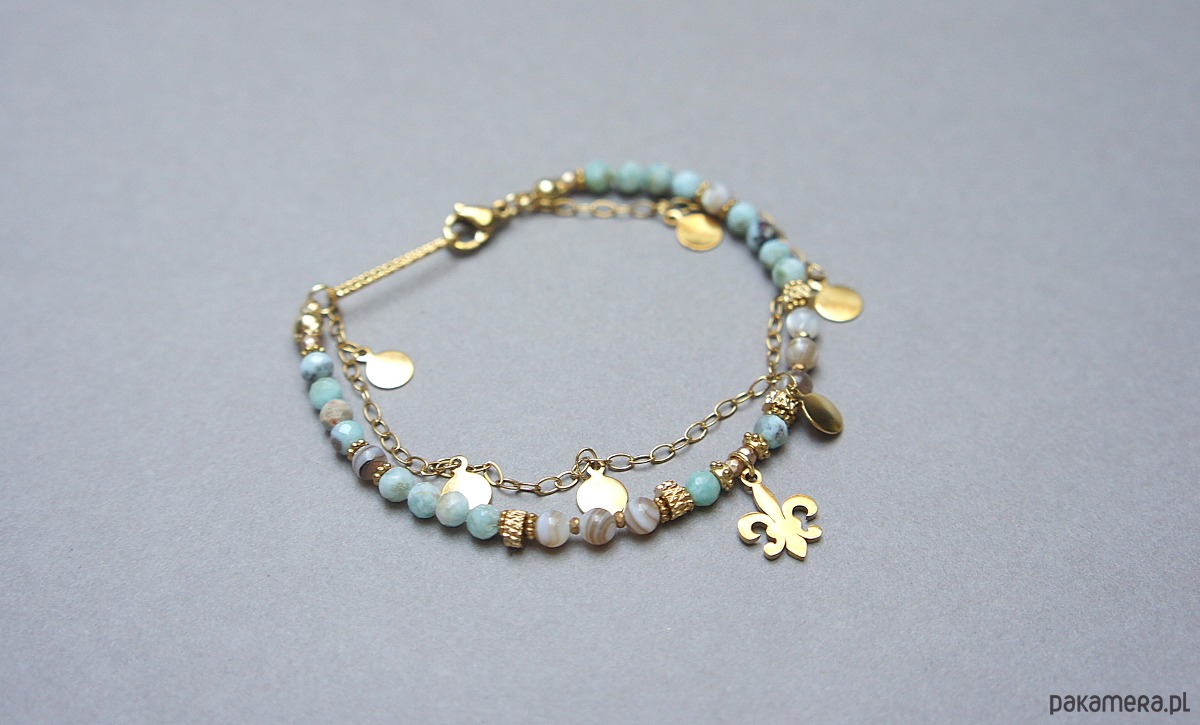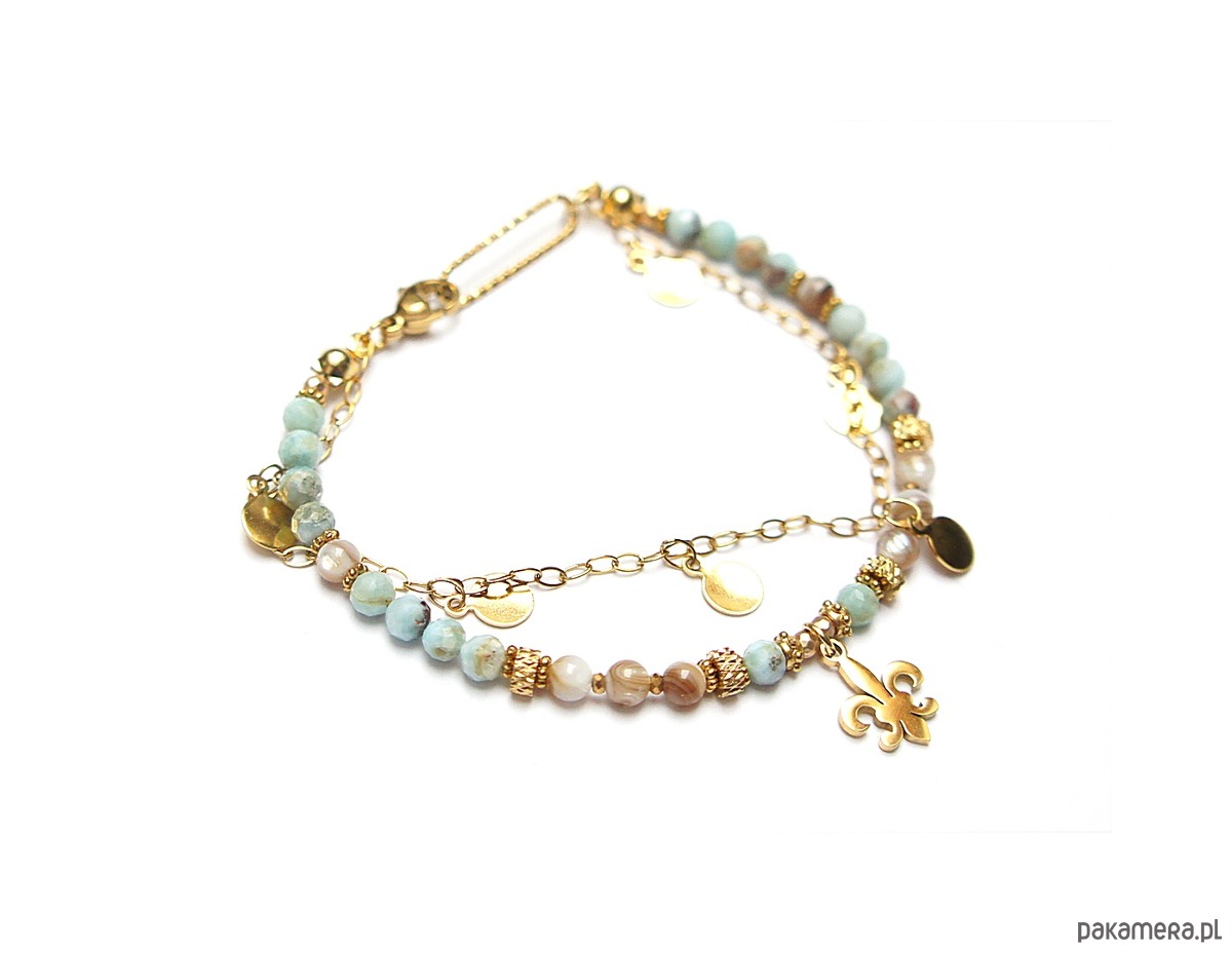 Delikatna bransoletka wykonana w całości z pozłacanej stali szlachetnej oraz naturalnych, szlachetnych kamieni - larimar fasetowany [4mm], muszla latte [4mm], hematytów fasetowanych, platerowanych [1mm i 2mm]. Całkowita długość bransoletki: 18,6cm.