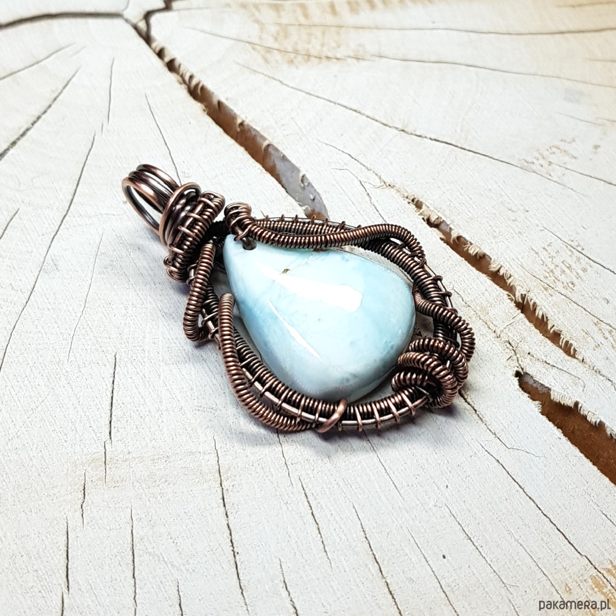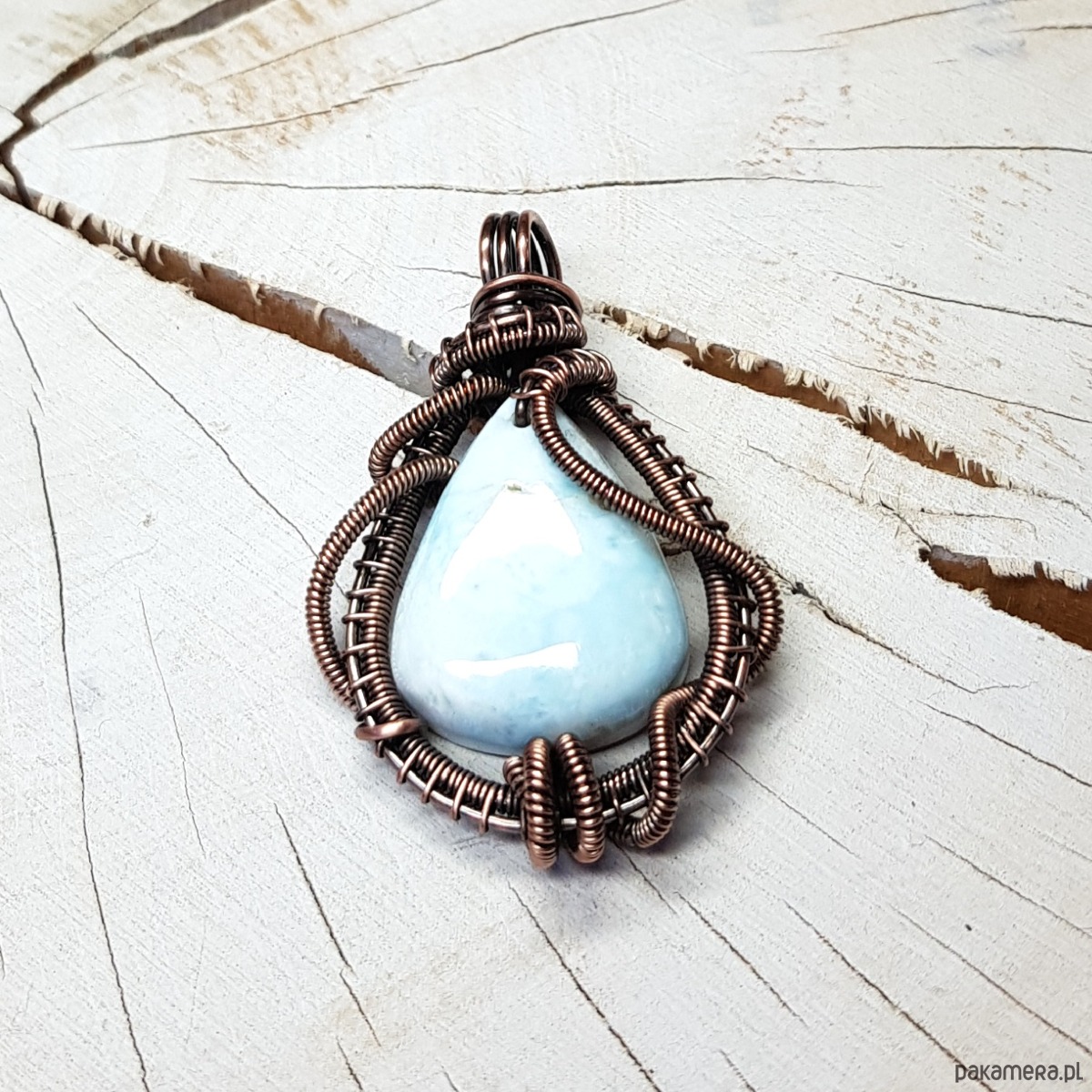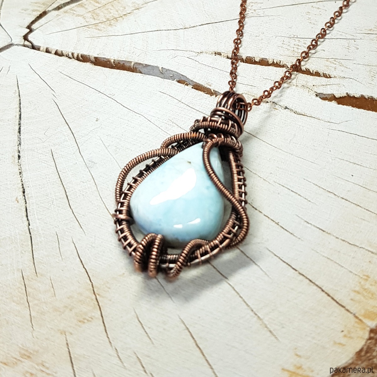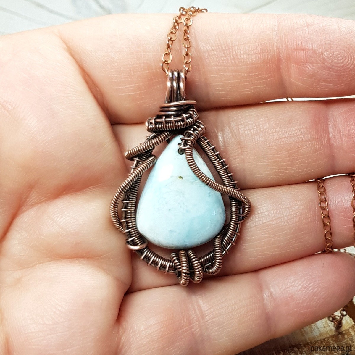 Zawieszka wykonana ręcznie metodą wire-wrappingu której głównym elementem jest naturalny larimar . Do wykonania wisiorka użyłam drutu miedzianego który następnie oksydowałam i wypolerowałam w celu uzyskania szlachetnego efektu postarzenia . Wymiary zawieszki 44x28mm z łańcuszkiem długości 45-50 cm. Wisiorek jest mały, delikatny.