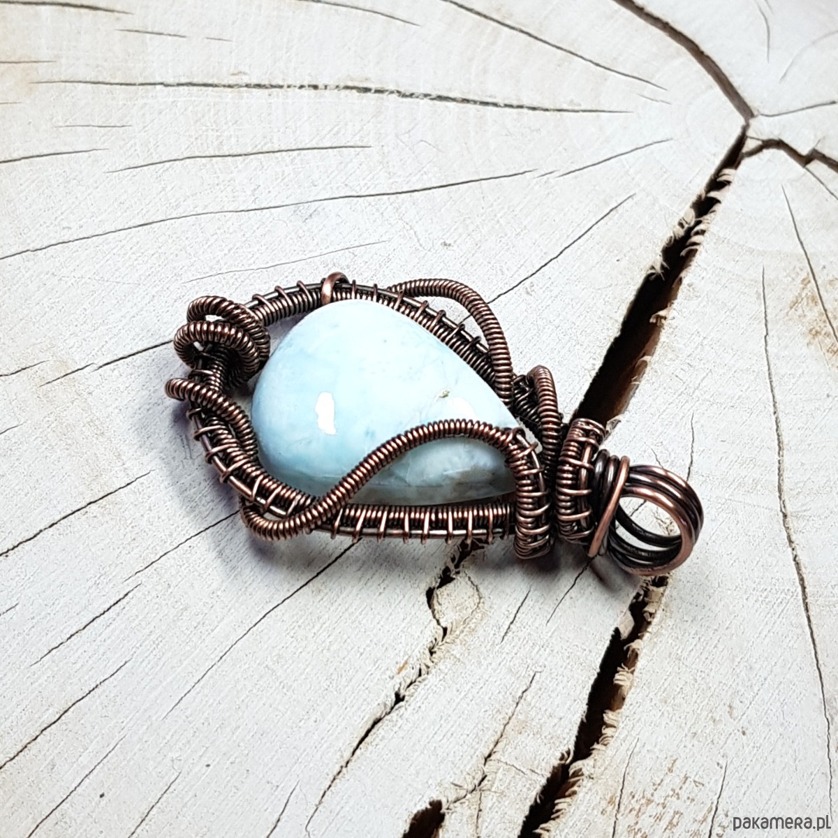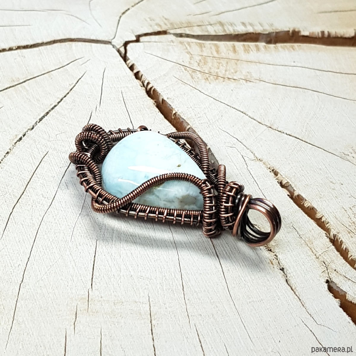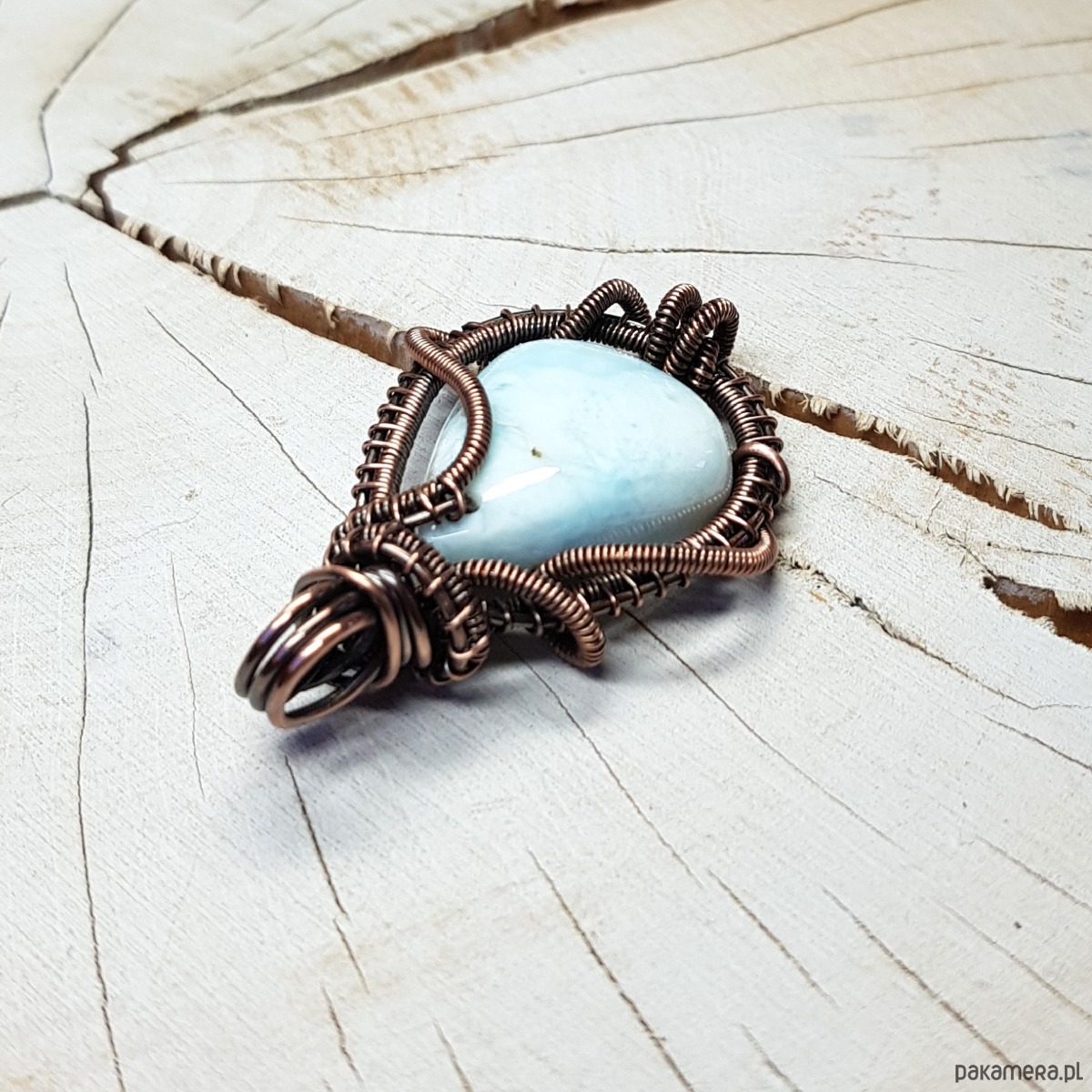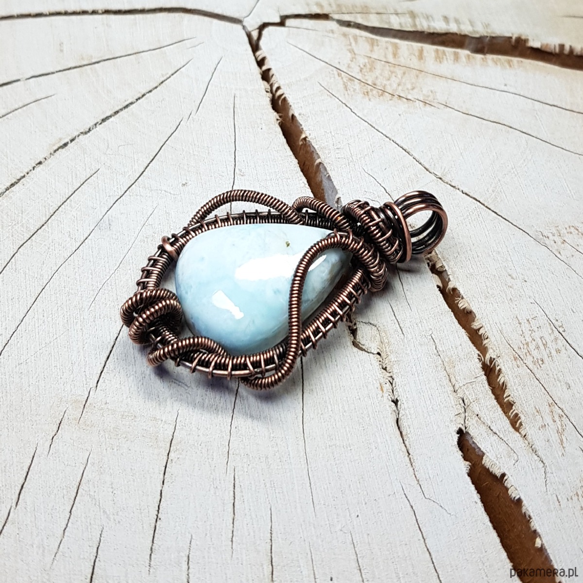 Zawieszka wykonana ręcznie metodą wire-wrappingu której głównym elementem jest naturalny larimar . Do wykonania wisiorka użyłam drutu miedzianego który następnie oksydowałam i wypolerowałam w celu uzyskania szlachetnego efektu postarzenia . Wymiary zawieszki 44x28mm z łańcuszkiem długości 45-50 cm. Wisiorek jest mały, delikatny.