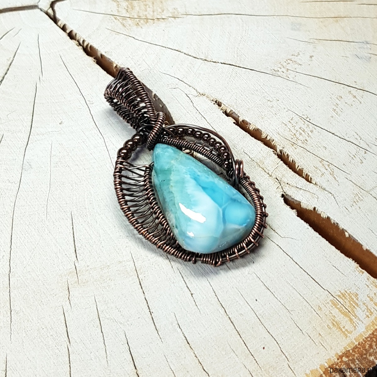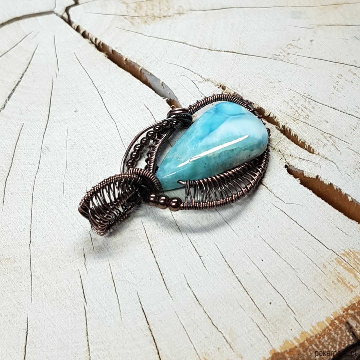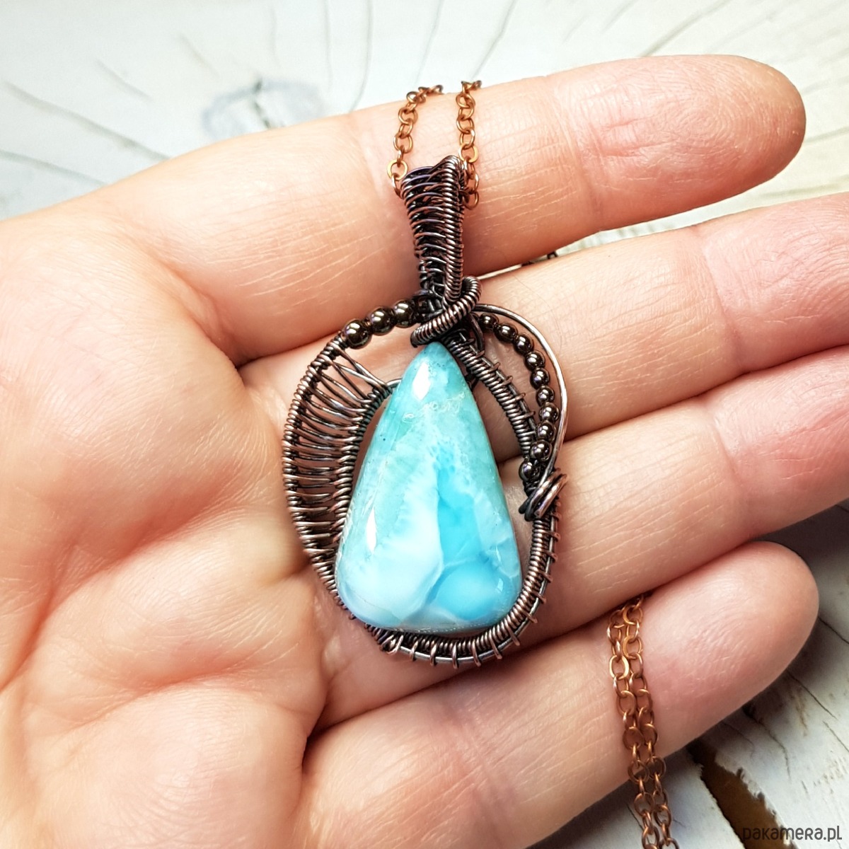Zawieszka wykonana ręcznie metodą wire-wrappingu której głównym elementem jest naturalny larimar . Do wykonania wisiorka użyłam drutu miedzianego który następnie oksydowałam i wypolerowałam w celu uzyskania szlachetnego efektu postarzenia . Wymiary zawieszki 47x27mm z łańcuszkiem długości 45-50 cm. Wisiorek jest mały, delikatny.