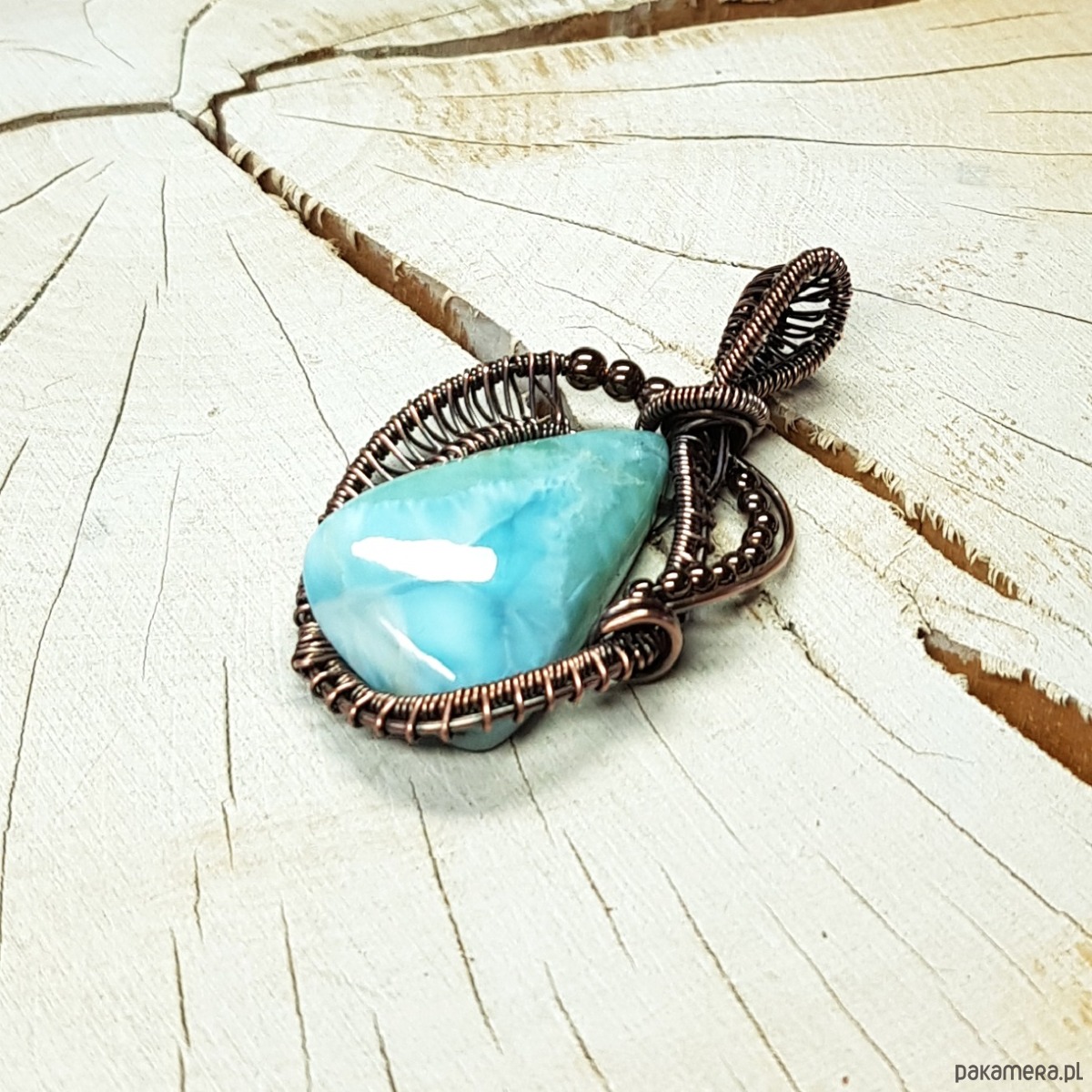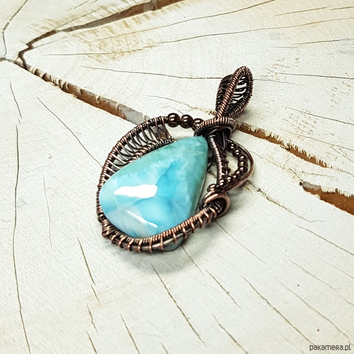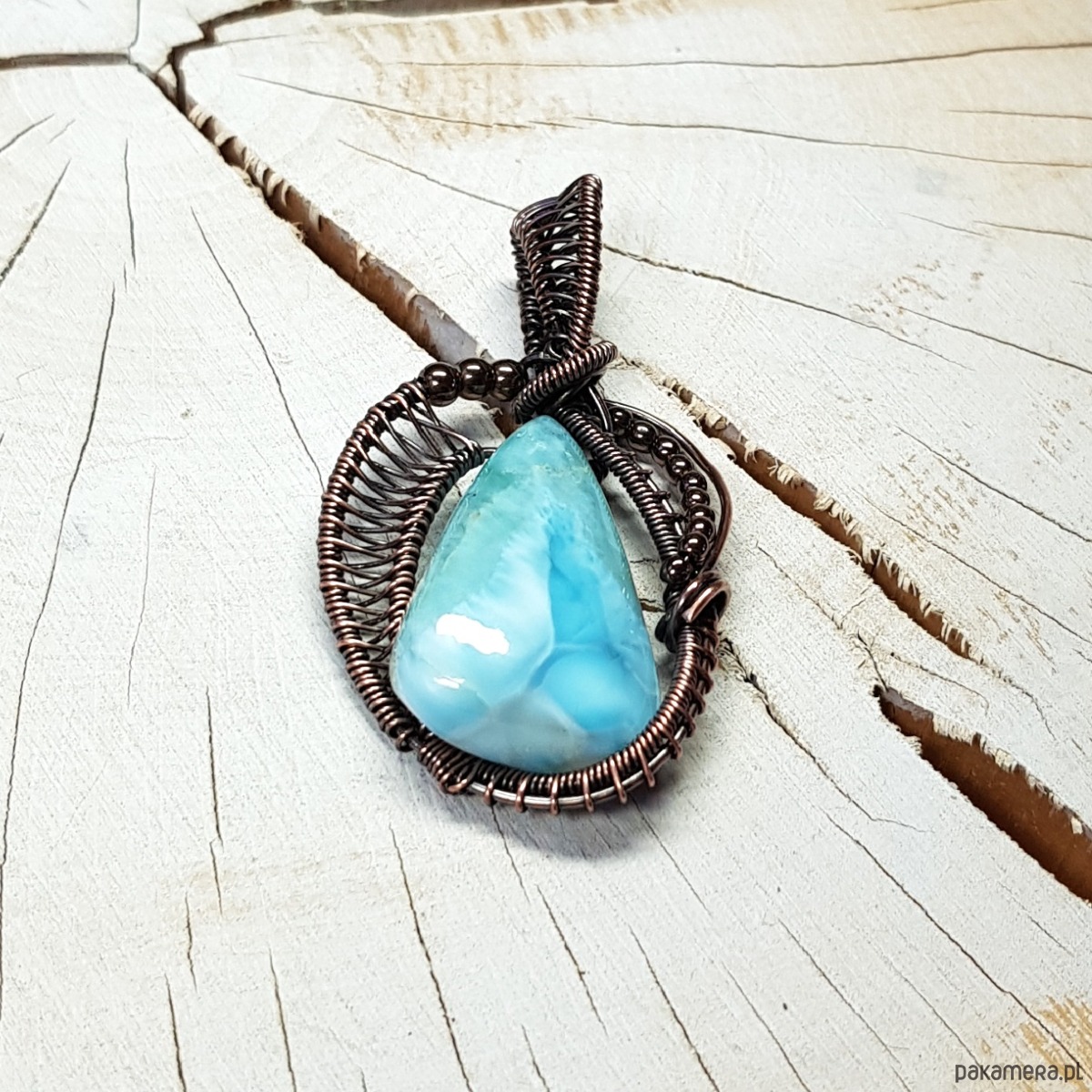 Zawieszka wykonana ręcznie metodą wire-wrappingu której głównym elementem jest naturalny larimar . Do wykonania wisiorka użyłam drutu miedzianego który następnie oksydowałam i wypolerowałam w celu uzyskania szlachetnego efektu postarzenia . Wymiary zawieszki 47x27mm z łańcuszkiem długości 45-50 cm. Wisiorek jest mały, delikatny.