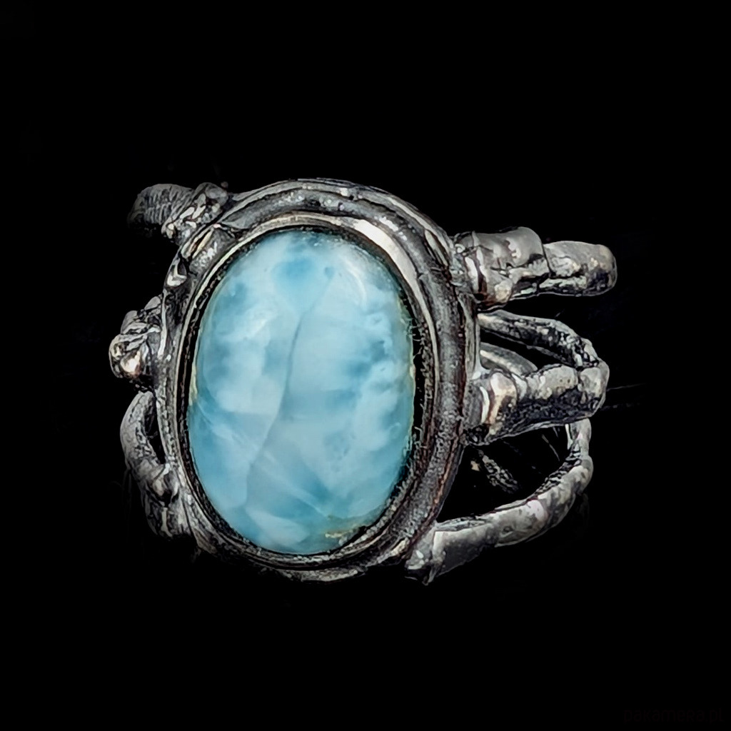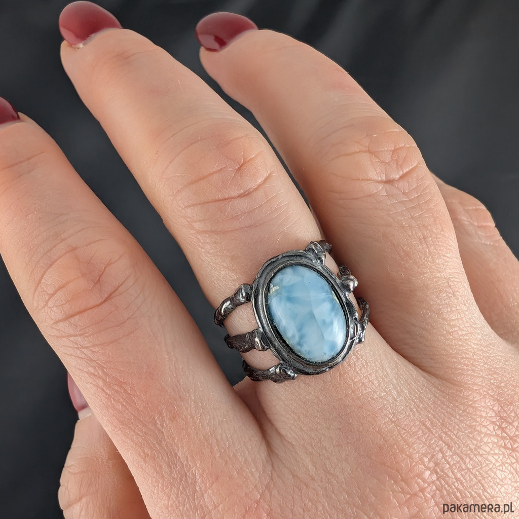 Kobiecy, subtelny pierścionek z oprawionym w potrójną ramę oksydowanego srebra próby 925 naturalnym larimarem. Obrączka szerokość max. 14 mm. Wymiary oprawy pierścionka 17 x13 mm. Rozmiar jubilerski 16, z możliwością powiększenia na max. 18. Proszę napisać na jaki dopasować. Waga 6,15 g. Pierścień zapakowany zostanie w ozdobne pudełeczko.